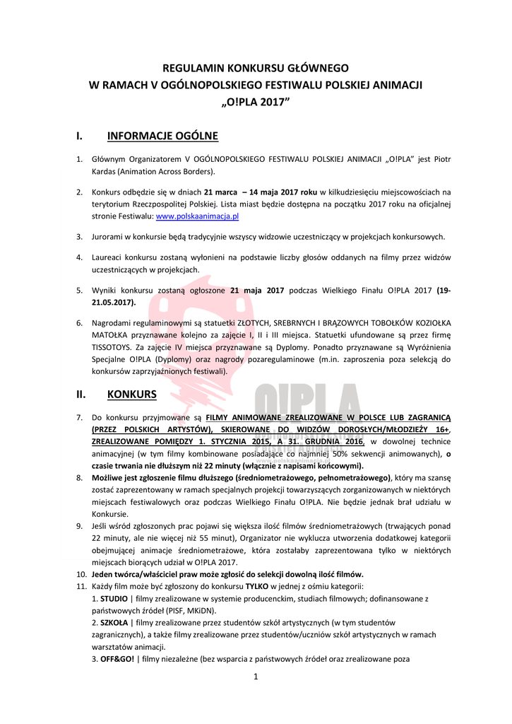 REGULAMIN KONKURSU GŁÓWNEGO W RAMACH V OGÓLNOPOLSKIEGO FESTIWALU POLSKIEJ ANIMACJI „O!PLA 2017” I. INFORMACJE OGÓLNE 1. Głównym Organizatorem V OGÓLNOPOLSKIEGO FESTIWALU POLSKIEJ ANIMACJI „O!PLA” jest Piotr Kardas (Animation Across Borders). 2. Konkurs odbędzie się w dniach 21 marca – 14 maja 2017 roku w kilkudziesięciu miejscowościach na terytorium Rzeczpospolitej Polskiej. Lista miast będzie dostępna na początku 2017 roku na oficjalnej stronie Festiwalu: www.polskaanimacja.pl 3. Jurorami w konkursie będą tradycyjnie wszyscy widzowie uczestniczący w projekcjach konkursowych. 4. Laureaci konkursu zostaną wyłonieni na podstawie liczby głosów oddanych na filmy przez widzów uczestniczących w projekcjach. 5. Wyniki konkursu zostaną ogłoszone 21 maja 2017 podczas Wielkiego Finału O!PLA 2017 (1921.05.2017). 6. Nagrodami regulaminowymi są statuetki ZŁOTYCH, SREBRNYCH I BRĄZOWYCH TOBOŁKÓW KOZIOŁKA MATOŁKA przyznawane kolejno za zajęcie I, II i III miejsca. Statuetki ufundowane są przez firmę TISSOTOYS. Za zajęcie IV miejsca przyznawane są Dyplomy. Ponadto przyznawane są Wyróżnienia Specjalne O!PLA (Dyplomy) oraz nagrody pozaregulaminowe (m.in. zaproszenia poza selekcją do konkursów zaprzyjaźnionych festiwali). II. KONKURS 7. Do konkursu przyjmowane są FILMY ANIMOWANE ZREALIZOWANE W POLSCE LUB ZAGRANICĄ (PRZEZ POLSKICH ARTYSTÓW), SKIEROWANE DO WIDZÓW DOROSŁYCH/MŁODZIEŻY 16+, ZREALIZOWANE POMIĘDZY 1. STYCZNIA 2015, A 31. GRUDNIA 2016, w dowolnej technice animacyjnej (w tym filmy kombinowane posiadające co najmniej 50% sekwencji animowanych), o czasie trwania nie dłuższym niż 22 minuty (włącznie z napisami końcowymi). 8. Możliwe jest zgłoszenie filmu dłuższego (średniometrażowego, pełnometrażowego), który ma szansę zostać zaprezentowany w ramach specjalnych projekcji towarzyszących zorganizowanych w niektórych miejscach festiwalowych oraz podczas Wielkiego Finału O!PLA. Nie będzie jednak brał udziału w Konkursie. 9. Jeśli wśród zgłoszonych prac pojawi się większa ilość filmów średniometrażowych (trwających ponad 22 minuty, ale nie więcej niż 55 minut), Organizator nie wyklucza utworzenia dodatkowej kategorii obejmującej animacje średniometrażowe, która zostałaby zaprezentowana tylko w niektórych miejscach biorących udział w O!PLA 2017. 10. Jeden twórca/właściciel praw może zgłosić do selekcji dowolną ilość filmów. 11. Każdy film może być zgłoszony do konkursu TYLKO w jednej z ośmiu kategorii: 1. STUDIO | filmy zrealizowane w systemie producenckim, studiach filmowych; dofinansowane z państwowych źródeł (PISF, MKiDN). 2. SZKOŁA | filmy zrealizowane przez studentów szkół artystycznych (w tym studentów zagranicznych), a także filmy zrealizowane przez studentów/uczniów szkół artystycznych w ramach warsztatów animacji. 3. OFF&GO! | filmy niezależne (bez wsparcia z państwowych źródeł oraz zrealizowane poza 1 szkołą/akademią), w tym filmy zrealizowane przez amatorów w ramach warsztatów animacji. 4. ANIMOWANY WIDEOKLIP | oficjalne animowane teledyski zrealizowane na zamówienie, w tym wideoklipy nieoficjalne, ale posiadające zgodę na wykorzystanie muzyki. 5. ANIMOWANA FRASZKA | filmy, których akcja trwa od 1 do 90 sekund. 6. FORMANIMY | abstrakcje i animacje eksperymentalne. 7. POZAPOLSKĄ | filmy zrealizowane przez polskich artystów, ale poza Polską (w szkołach artystycznych, bądź niezależnie). 8. TERAZ DZIECI MAJĄ GŁOS! > filmy skierowane do dzieci (zobacz REGULAMIN i FORMULARZ ZGŁOSZENIOWY Konkursu TERAZ DZIECI MAJĄ GŁOS!) PROSZĘ O WYRAŹNE ZAZNACZENIE KATEGORII W FORMULARZU ZGŁOSZENIOWYM. 12. Organizator zastrzega sobie prawo do przyporządkowania filmu do innej kategorii, niż zaznaczona przez zgłaszającego, jeśli uzna to za stosowne/konieczne/lepsze dla filmu. 13. ZGŁOSZENIE FILMU DO KONKURSU JEST BEZPŁATNE. 14. Termin zgłaszania filmów oraz przesłania ich do Organizatora upływa 31 stycznia 2017 r. 15. Filmy mogą być zgłaszane przez producentów, dystrybutorów, szkoły filmowe/artystyczne, instytucje filmowe, grupy filmowe, indywidualnych twórców lub inne podmioty posiadające do tego prawo. 16. Warunkiem dopuszczenia filmu do selekcji jest wypełnienie FORMULARZA ZGŁOSZENIOWEGO filmu znajdującego się na stronie www.polskaanimacja.pl oraz terminowe przesłanie kopii przeglądowej filmu w postaci (proszę wybrać TYLKO jedną drogę): Pliku MP4 (za pomocą WeTransfer: https://www.wetransfer.com/ lub Google Drive, na adres: [email protected]) + skan odręcznie podpisanego FORMULARZA ZGŁOSZENIOWEGO. Link do Vimeo, YouTube, etc. + skan odręcznie podpisanego FORMULARZA ZGŁOSZENIOWEGO na adres: [email protected]. 17. Selekcja filmów konkursowych obejmuje wyłącznie filmy zgłoszone w terminie (ZGŁOSZENIE MUSI TRAFIĆ DO ORGANIZATORA DO 31.01.2017) i na zasadach określonych w niniejszym Regulaminie. 18. W razie niedotrzymania terminu przez zgłaszającego lub niedokładnego wypełnienia karty zgłoszeniowej Organizator nie ma obowiązku dopuszczenia filmu do selekcji. 19. Organizator zastrzega sobie prawo nie przyjąć filmu do selekcji z powodu wadliwej jakości technicznej kopii przeglądowej filmu. 20. Odpowiedzialność za prawny tytuł do zgłoszenia filmu na Festiwal leży po stronie Zgłaszającego. 21. Organizator i współorganizatorzy nie ponoszą żadnej odpowiedzialności prawnej wynikającej z naruszenia przez Zgłaszającego osobistych lub majątkowych praw autorskich osób trzecich. 22. Lista filmów dopuszczonych do Konkursu, w każdej z ośmiu Kategorii, ogłoszona zostanie 28 lutego 2017 roku na stronie www.polskaanimacja.pl 23. Zgłaszający, którego film został przyjęty do konkursu, zostanie ponadto poinformowany o tym fakcie drogą mailową lub telefonicznie. 24. Po otrzymaniu informacji o zakwalifikowaniu filmu do konkursu, Zgłaszający zobowiązany jest do przesłania na adres: [email protected]: