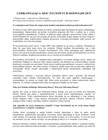 UZDRAWIAJĄCA MOC ŻYCIOWYCH DOŚWIADCZEŃ * Tłumaczenie: wydawnictwo Illuminatio. Wywiad przeprowadzony został po opublikowaniu książki „Odważne Dusze”. Co zainspirowało Pana do rozpoczęcia badań nad planowaniem przedurodzeniowym? W połowie roku 2003 pracowałem na własny rachunek jako konsultant do spraw marketingu i komunikacji. Zajmowałem się przede wszystkim pisaniem dla firm i czułem się w swoim życiu głęboko niespełniony. Czułem, że gdybym nagle zniknął z powierzchni ziemi, żaden z moich klientów by się tym nie przejął, po prostu wstawiliby kogoś innego na moje miejsce i pracowaliby dalej. Jednocześnie miałem przeczucie wyższego powołania, tylko jeszcze nie wiedziałem, na czym ono polega. W poszukiwaniu sensu życia, 7 maja 2003 roku udałem się na sesję z medium. Pamiętam tę datę, bo tego dnia moje życie się zmieniło. Dzięki medium dowiedziałem się o idei przewodników duchowych, wysoko rozwiniętych istot, które pomagają nam zaplanować nasze życie jeszcze przed narodzinami i potem nas prowadzą, kiedy już przyjdziemy na świat. Poprzez medium, mogłem porozumieć się ze swoimi przewodnikami. Przewodnicy powiedzieli, że zaplanowałem największe wyzwania mojego życia, zanim się urodziłem. Mogłem to odrzucić, jako własne urojenie, ale okazało się, że przewodnicy wiedzą dosłownie wszystko na mój temat. Znali nawet osobiste przemyślenia i uczucia, o których nie opowiadałem nikomu. Jak sobie możesz wyobrazić, dzięki temu stali się dla mnie całkowicie wiarygodni! Kiedy zaczęli opowiadać o planowaniu przed narodzinami, słuchałem jak urzeczony. Omówiliśmy niektóre z wyzwań, którym musiałem stawić czoła i powody, dla których wybrałem takie właśnie doświadczenia. To było dla mnie głęboko uzdrawiające i zrozumiałem, że jestem na tropie idei, która może przynieść to samo uzdrowienie innym ludziom. To właśnie zainspirowało mnie do napisania książki na ten temat. Jaka jest Pańska definicja Odważnej Duszy? Kto jest Odważną Duszą? Każdy, kto czyta te słowa jest Odważną Duszą. Każdy, kto żyje na Ziemi jest Odważną Duszą. Ziemia jest jedną z najtrudniejszych, a może nawet najtrudniejszą „szkołą” we wszechświecie. Tylko najodważniejsze dusze decydują się na inkarnację w tym miejscu. Kiedy zdajemy sobie z tego sprawę, umacniamy poczucie własnej wartości, miłości do samego siebie, a także szacunku, miłości i podziwu wobec innych. Jak zmieniło się życie bohaterów książki? Czego dowiedzieli się na swój temat dzięki uczestnictwu w sesjach z medium? Osoby, które występują w mojej książce zostały zapoznane z ideą, że same, przed narodzinami, zaplanowały największe wyzwania, które napotykają w życiu. Niektóre z tych osób wiedzą, że to prawda. Inne jeszcze nie bardzo wiedzą, co o tym myśleć. To czy ich życie się zmienia, czy nie, zależy od tego, czy przyjmują tę ideę i co w związku z tym robią. Historia Christiny, kobiety, która przed narodzinami zaplanowała udział w wybuchu bomby, jest być może kluczowa dla tej książki. Z rozmów z przewodnikami, które odbyły się wiele lat wcześniej niż wywiady na potrzeby książki, dowiedziała się, że faktycznie chciała przeżyć wybuch bomby lub cos równie traumatycznego. Dlaczego? Ponieważ chciała przeżyć inkarnację utalentowanej uzdrowicielki. Wiedziała, że jeśli uleczy się ze straszliwych skutków eksplozji, to będzie mogła całą tę mądrość i wiedzę na temat uzdrawiania wykorzystać w służbie ludzkości. I tak właśnie zrobiła. Kiedy już uzdrowiła siebie po wybuchu, Christina zdobyła tytuł doktora logopedii, założyła prywatna klinikę i uzdrowiła tysiące ludzi, a co może wydać się jeszcze bardziej niezwykłe, całkowicie przebaczyła osobie, która podłożyła bombę i naraziła ją na tyle cierpienia. Christina jest wręcz głęboko wdzięczna tej osobie. Jest to, jak sądzę, wyjątkowa historia kogoś, kto wykorzystał wiedzę o swoim planie, żeby całkowicie odmienić własne życie. Jednak, każdy z nas może zrobić to co Christina. Możemy wybaczyć tym, co nas skrzywdzili, możemy być wdzięczni za wyzwania, które napotykamy i możemy porzucić przekonanie, że jesteśmy ofiarami. Zamiast tego, możemy widzieć siebie samych jako potężnych stwórców własnych doświadczeń. Jaka jest główna idea tej książki? Książka opiera się na dwóch ideach. Pierwsza z nich mówi, że nie ma czegoś takiego jak przypadkowe, narzucone z góry czy bezsensowne cierpienie. Każde cierpienie ma swój głęboki, duchowy sens, nawet jeśli go nie widzimy. Nie żyjemy w okrutnym świecie, w którym Bóg nas ocenia i karze za przewinienia. To my tworzymy wszystko, czego doświadczamy. Wszystko. Druga główna idea polega na tym, że nie jesteśmy swoimi ciałami, czy osobowościami, a raczej świętymi, wiecznymi, odważnymi duszami, istotami z miłości i światła. Ta osobowość i ciało towarzyszy nam tylko w czasie obecnego życia. Jeśli posiadasz jakąś rzecz, to nie znaczy, że nią jesteś. Jeśli masz konia, to nie znaczy, że jesteś koniem. Podobnie, jeśli masz ciało i osobowość, to nie znaczy, że jesteś tym ciałem i tą osobowością. Nie jesteś. Kim jesteś w takim razie? Duszą. A czego się Pan dowiedział na swój temat? Jak to wpłynęło na Pańskie życie? Dowiedziałem się, że mam skłonność do postrzegania siebie samego jako ofiary, do obwiniania innych albo całego wszechświata o rzeczy, które mi się przytrafiały i które uznawałem za złe. Teraz, ilekroć zdarza mi się coś „złego”, pytam sam siebie: „Dlaczego to stworzyłem?”. Często nie znam odpowiedzi na to pytanie, ale biorę za to odpowiedzialność, bo jestem stworzycielem wszystkiego, czego doświadczam. Poza tym, przypominam sobie, że we wszystkim tkwi duchowe znaczenie i cel. Nie ma bezsensownego cierpienia. Ono po prostu nie is