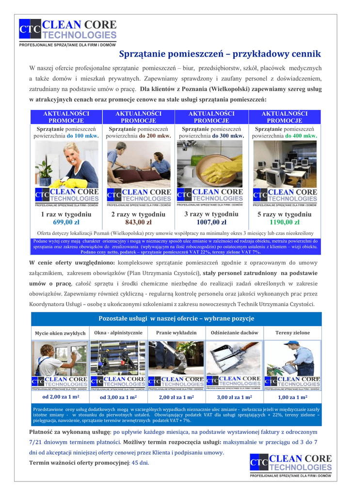 Sprzątanie pomieszczeń – przykładowy cennik W naszej ofercie profesjonalne sprzątanie pomieszczeń – biur, przedsiębiorstw, szkół, placówek medycznych a także domów i mieszkań prywatnych. Zapewniamy sprawdzony i zaufany personel z doświadczeniem, zatrudniany na podstawie umów o pracę. Dla klientów z Poznania (Wielkopolski) zapewniamy szereg usług w atrakcyjnych cenach oraz promocje cenowe na stałe usługi sprzątania pomieszczeń: AKTUALNOŚCI PROMOCJE AKTUALNOŚCI PROMOCJE AKTUALNOŚCI PROMOCJE AKTUALNOŚCI PROMOCJE Sprzątanie pomieszczeń powierzchnia do 100 mkw. Sprzątanie pomieszczeń powierzchnia do 200 mkw. Sprzątanie pomieszczeń powierzchnia do 300 mkw. Sprzątanie pomieszczeń powierzchnia do 400 mkw. 1 raz w tygodniu 699,00 zł 2 razy w tygodniu 843,00 zł 3 razy w tygodniu 1007,00 zł 5 razy w tygodniu 1190,00 zł Oferta dotyczy lokalizacji Poznań (Wielkopolska) przy umowie współpracy na minimalny okres 3 miesięcy lub czas nieokreślony Podane wyżej ceny mają charakter orientacyjny i mogą w nieznaczny sposób ulec zmianie w zależności od rodzaju obiektu, metrażu powierzchni do sprzątania oraz zakresu obowiązków do zrealizowania (wpływającym na ilość roboczogodzin) po ostatecznym ustaleniu z klientem – wizji obiektu. Podano ceny netto, podatek – sprzątanie pomieszczeń VAT 22%, tereny zielone VAT 7%. W cenie oferty uwzględniono: kompleksowe sprzątanie pomieszczeń zgodnie z opracowanym do umowy załącznikiem, zakresem obowiązków (Plan Utrzymania Czystości), stały personel zatrudniony na podstawie umów o pracę, całość sprzętu i środki chemiczne niezbędne do realizacji zadań określonych w zakresie obowiązków. Zapewniamy również cykliczną - regularną kontrolę personelu oraz jakości wykonanych prac przez Koordynatora Usługi – osobę z ukończonymi szkoleniami z zakresu nowoczesnych Technik Utrzymania Czystości. Pozostałe usługi w naszej ofercie – wybrane pozycje Mycie okien zwykłych Okna - alpinistycznie Pranie wykładzin Odśnieżanie dachów Tereny zielone od 2,00 za 1 m2 od 3,00 za 1 m2 2,00 zł za 1 m2 3,00 zł za 1 m2 1,00 za 1 m2 Przedstawione ceny usług dodatkowych mogą w szczególnych wypadkach nieznacznie ulec zmianie - zwłaszcza jeżeli w międzyczasie zaszły istotne zmiany - w stosunku do pierwotnych ustaleń. Obowiązujący podatek VAT dla usługi sprzątających + 22%, tereny zielone – pielęgnacja, nawożenie, sprzątanie terenów zewnętrznych podatek VAT + 7%. Płatność za wykonaną usługę: po upływie każdego miesiąca, na podstawie wystawionej faktury z odroczonym 7/21 dniowym terminem płatności. Możliwy termin rozpoczęcia usługi: maksymalnie w przeciągu od 3 do 7 dni od akceptacji niniejszej oferty cenowej przez Klienta i podpisaniu umowy. Termin ważności oferty promocyjnej: 45 dni. Dlaczego nasza oferta? – czym różnimy się od konkurencji Personel, powyższa oferta uwzględnia zatrudnienie doświadczonego i przeszkolonego personelu sprzątającego na podstawie umów o pracę. W trakcie pracy zapewniamy cykliczne szkolenia doskonalące, podnoszenie poziomu wiedzy i kwalifikacji oraz stałą pomoc techniczną i merytoryczną przy wykonywaniu obowiązków. Nadzór jakości usługi, Koordynator Usługi czuwa nad jakością wykonywanej pracy – minimum jeden raz w tygodniu (na podstawie indywidualnych ustaleń z klientem) nadzoruje jakość usługi, szkoli personel, zamawia środki czystości i sprzęt oraz kontaktuje się z Państwem na bieżąco organizując przebieg współpracy. Profesjonalny sprzęt logistyczny oraz środki chemiczne niezbędne do właściwego wykonania i odpowiedniej jakości usługi. Wszystkie produkty posiadają atesty i karty charakterystyki które otrzymujecie Państwo od nas zaraz po podpisaniu umowy (atesty i karty charakterystyki wymagane podczas kontroli Sanepid, inne...) Plan Utrzymania Czystości - szczegółowy zakres prac z podziałem na dni, strefy i zadania do wykonania wraz z przypisaniem odpowiednich środków, sposobem ich rozcieńczenia i stosowania - stanowi załącznik do umowy. Na obiekcie wprowadzamy Dziennik Prac gdzie strony mogą wpisywać swoje sugestie i uwagi dotyczące usługi. Gwarancja i bezpieczeństwo – wszystkie osoby są przeszkolone w kierunku bezpiecznego wykonywania obowiązków oraz zachowania tajemnicy służbowej i zawodowej. Na życzenie klienta mogą podpisać klauzulę poufności, wszystkie nasze działania określają odpowiednie jasno sformułowane paragrafy i zapisy w umowie! Zastępstwa i nieobecności – rozwiązujemy w sposób natychmiastowy, poprzez dobre i skuteczne działania oraz właściwe zaplecze personalne. Osoby z innych obiektów lub specjalne osoby zatrudnione jako „personel dyżurny”, odpowiednio przeszkolone wchodzą na bieżąco w powstające luki w miejscach pracy. Uczciwe zasady – w każdej nawet najlepiej zorganizowanej firmie pomimo dokładania wszelkich starań i maksymalnej dbałości o jakość - zdarzają się pomyłki, dlatego naszym kluczowym celem w momencie powstania ewentualnego błędu jest rozwiązanie problemu w sposób - najbardziej satysfakcjonujący naszych klientów. ZAPRASZAMY DO KORZYSTANIA Z NASZYCH USŁUG! 2|Strona Dział handlowy Poznań 502 147 700 więcej informacji www.clean-core.pl