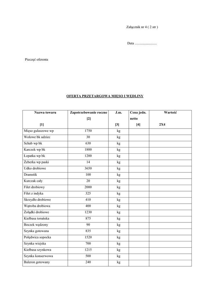 Załącznik nr 4 ( 2 str ) Data ......................... Pieczęć oferenta OFERTA PRZETARGOWA MIĘSO I WĘDLINY Nazwa towaru Zapotrzebowanie roczne J.m. [2] [1] Mięso gulaszowe wp Wartość netto [3] 1750 kg Wołowe bk udziec 30 kg Schab wp bk 630 kg Karczek wp bk 1800 kg Łopatka wp bk 1200 kg 14 kg Udko drobiowe 3650 kg Dramstik 100 kg Kurczak cały 20 kg Filet drobiowy 2000 kg Filet z indyka 325 kg Skrzydło drobiowe 410 kg Wątroba drobiowa 400 kg Żołądki drobiowe 1230 kg Kiełbasa toruńska 875 kg Boczek wędzony 90 kg Szynka gotowana 835 kg Polędwica sopocka 1520 kg Szynka wiejska 700 kg Kiełbasa szynkowa 1215 kg Szynka konserwowa 500 kg Baleron gotowany 240 kg Żeberka wp paski Cena jedn. [4] 2X4 Parówki drobiowe 1100 kg Polędwica drobiowa 820 kg Filet z indyka wędzony 160 kg Podgardle gotowane 360 kg Słonina 20 kg Kabanos wp 15 kg Kiełbasa wiejska 50 kg Kiełbasa żywiecka 1400 kg Łopatka pieczona 100 kg Kiełbasa swojska 50 kg Szynka w galarecie 370 kg Pasztet pieczony 600 kg Kiełbasa drobiowa 270 kg podsuszana k Suma wartości g Uwaga Zamawiający zastrzega sobie prawo do zmiany proporcji w zamawianych asortymentach w przypadku różnic w planowanym obłożeniu obiektu ,zmian kategorii gości, oraz stanów osób na pobytach leczniczych powodujących konieczność stosowania diet zaleconych przez lekarzy. Podpis ..................