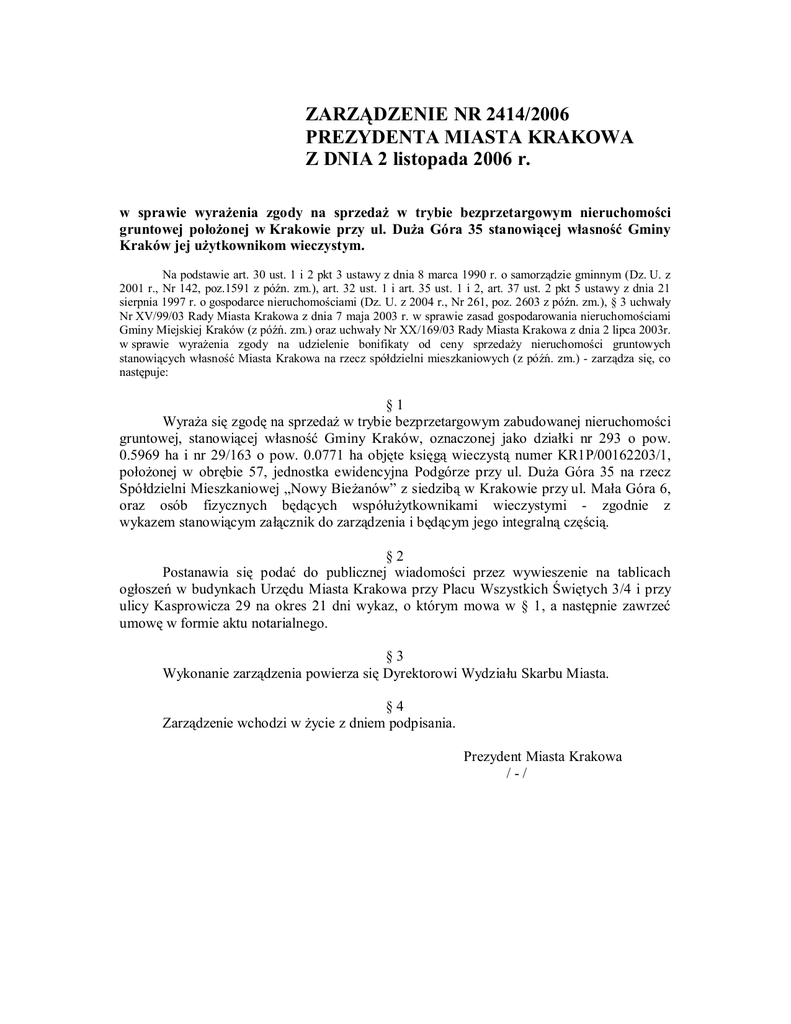 ZARZĄDZENIE NR 2414/2006 PREZYDENTA MIASTA KRAKOWA Z