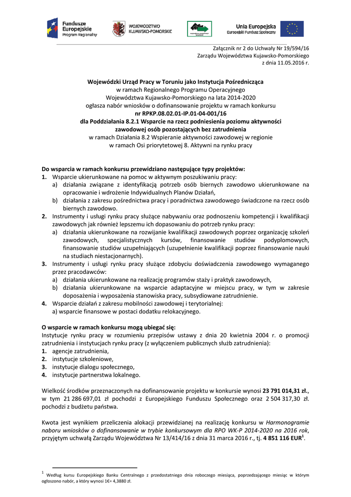 Załącznik nr 2 do Uchwały Nr 19/594/16 Zarządu Województwa Kujawsko-Pomorskiego Kujawsko z dnia 11.05.2016 r. Wojewódzki Urząd Pracy w Toruniu jako Instytucja Pośrednicząca w ramach Regionalnego Programu Operacyjnego Województwa Kujawsko-Pomorskiego Kujawsko na lata 2014-2020 2020 ogłasza nabór wniosków o dofinansowanie projektu w ramach konkursu nr RPKP.08.02.01-IP.01-04-001/16 dla Poddziałania 8.2.1 Wsparcie na rzecz podniesienia poziomu aktywności zawodowej osób pozostających bez zatrudnienia w ramach Działania 8.2 Wspieranie ieranie aktywności zawodowej w regionie w ramach Osi priorytetowej 8. 8 Aktywni na rynku pracy Do wsparcia w ramach konkursu przewidziano następujące typy projektów: 1. Wsparcie ukierunkowane na pomoc w aktywnym poszukiwaniu pracy: a) działania związane z identyfikacją potrzeb osób biernych zawodowo ukierunkowane na opracowanie i wdrożenie Indywidualnych Planów Działań, b) działania z zakresu pośrednictwa pracy i poradnictwa zawodowego świadczone na rzecz osób biernych zawodowo. 2. Instrumenty i usługi rynku pracy pracy służące nabywaniu oraz podnoszeniu kompetencji i kwalifikacji zawodowych jak również lepszemu ich dopasowaniu do potrzeb rynku pracy: a) działania ukierunkowane na rozwijanie kwalifikacji zawodowych poprzez organizację szkoleń zawodowych, specjalistycznych kursów, finansowanie studiów podyplomowych, finansowanie studiów uzupełniających (uzupełnienie kwalifikacji poprzez finansowanie nauki na studiach niestacjonarnych). 3. Instrumenty i usługi rynku pracy służące zdobyciu doświadczenia zawodowego wymaganego przez pracodawców: a) działania ukierunkowane na realizację programów staży i praktyk zawodowych, b) działania ukierunkowane na wsparcie adaptacyjne w miejscu pracy, w tym w zakresie doposażenia i wyposażenia stanowiska pracy, subsydiowane zatrudnienie. 4. Wsparcie działań ziałań z zakresu mobilności zawodowej i terytorialnej: a) wsparcie finansowe w postaci dodatku relokacyjnego. O wsparcie w ramach konkursu mogą ubiegać się: Instytucje rynku pracy w rozumieniu przepisów ustawy z dnia 20 kwietnia 2004 r. o promocji zatrudnienia nienia i instytucjach rynku pracy (z wyłączeniem publicznych służb zatrudnienia): 1. agencje zatrudnienia, 2. instytucje szkoleniowe, 3. instytucje dialogu społecznego, 4. instytucje partnerstwa lokalnego. Wielkość środków przeznaczonych na dofinansowanie projektu w konkursie wynosi 23 791 014,31 zł., w tym 21 286 697,01 zł pochodzi z Europejskiego Funduszu Społecznego oraz 2 504 317,30 zł. pochodzi z budżetu państwa. Kwota jest wynikiem przeliczenia alokacji alokacji przewidzianej na realizację konkursu w Harmonogramie naboru wniosków o dofinansowanie w trybie konkursowym dla RPO WK-P WK P 2014-2020 2014 na 2016 rok, przyjętym uchwałą Zarządu Województwa Nr 13/414/16 z dnia 31 marca 2016 r., tj. 4 851 116 EUR1. 1 Według kursu Europejskiego Banku Centralnego z przedostatniego dnia roboczego miesiąca, poprzedzającego miesiąc w którym ogłoszono nabór, a który wynosi 1€= 4,3880 zł. Minimalna wartość projektu wynosi 100 000 zł. Maksymalna wartość projektu wynosi 1 500 000 zł. Średni koszt na uczestnika projektu nie przekracza 15 000 zł2. Do realizacji projektu jest wymagane wniesienie wkładu własnego stanowiącego minimum 5,00% wydatków kwalifikowalnych. Maksymalny poziom dofinansowania UE wydatków kwalifikowalnych na poziomie projektu wynosi 85%. Maksymalny poziom dofinansowania całkowitego wydatków kwalifikowalnych na poziomie projektu wynosi 95%. Konkurs ma charakter zamknięty. Wnioski o dofinansowanie projektu należy składać od 20 czerwca 2016 r. do 4 lipca 2016 r. Formularz wniosku o dofinansowanie projektu należy w pierwszej kolejności wypełnić i przesłać w Generatorze Wniosków o Dofinansowanie dla RPO WK-P 2014-2020 dostępnym na stronie www.gwd.kujawsko-pomorskie.pl. Następnie należy złożyć wniosek w formie papierowej. Oznacza to złożenie 2 egzemplarzy wniosku o dofinansowanie projektu w formie papierowej wraz z załącznikami albo przesłanie 1 egzemplarza wraz z załącznikami w formie dokumentu elektronicznego. Wnioski o dofinansowanie projektu w formie papierowej wraz z załącznikami należy składać w dni robocze od poniedziałku do piątku w godzinach od 7.30 do 15.30 w Kancelarii Wojewódzkiego Urzędu Pracy w Toruniu, VII piętro, pokój nr 2, ul. Szosa Chełmińska 30/32, 87-100 Toruń. Wniosek o dofinansowanie projektu w formie papierowej może być dostarczony: osobiście lub przez posłańca (dostarczyciel otrzyma dowód wpływu przesyłki opatrzony podpisem i datą) – decyduje data wpływu do Kancelarii Wojewódzkiego Urzędu Pracy w Toruniu; poprzez nadanie w polskiej placówce pocztowej wyznaczonego operatora w rozumieniu Ustawy z dnia 23 listopada 2012 r. – Prawo pocztowe (Dz.U. 2012 poz. 1529) – decyduje data nadania. poprzez wysłanie w formie dokumentu elektronicznego do Wojewódzkiego Urzędu Pracy w Toruniu, a nadawca otrzyma urzędowe poświadczenie odbioru – decyduje data i godzina wytworzenia urzędowego poświadczenia odbioru. Nadto termin uważa się za zachowany, jeśli wniosek o dofinansowanie projektu został złożony w sposób określony w art. 57 § 5 Ustawy z dnia 14 czerwca 1960 r. - Kodeks postępowania administracyjnego (t.j. Dz. U z 2016 r. poz. 23). Wnioskodawca powinien ściśle stosować się do Instrukcji wypełniania wniosku o dofinansowanie projektu w ramach części RPO WK-P na lata 2014-2020 współfinansowanej z EFS, która stanowi załącznik nr 2 do Regulaminu konkursu. Termin rozstrzygnięcia konkursu przewiduje się na listopad 2016 r. Instytucja Pośrednicząca RPO WK-P 2014-2020 dokona oceny i wyboru projektów w oparciu o kryteria wyboru projektów zatwierdzone uchwałami Komitetu Monitorującego Regionalny Program Operacyjny Województwa Kujawsko-Pomorskiego na lata 2014-2020, które stanowią załącznik nr 5 do Regulam
