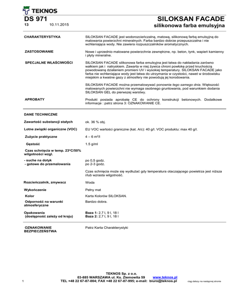 DS 971 13 SILOKSAN FACADE 10.11.2015 silikonowa farba emulsyjna CHARAKTERYSTYKA SILOKSAN FACADE jest wodorozcieńczalną, matową, silikonową farbą emulsyjną do malowania powierzchni mineralnych. Farba bardzo dobrze przepuszczalna i nie wchłaniająca wody. Nie zawiera rozpuszczalników aromatycznych. ZASTOSOWANIE Nowe i uprzednio malowane powierzchnie zewnętrzne, np. beton, tynk, wapień kamienny i płyty mineralne. SPECJALNE WŁAŚCIWOŚCI SILOKSAN FACADE silikonowa farba emulsyjna jest łatwa do nakładania zarówno wałkiem jak i natryskiem. Zawarta w niej żywica chroni powłokę przed kruchością powodowaną działaniem promieni UV i wysokiej temperatury. SILOKSAN FACADE jako farba nie wchłaniająca wody jest łatwa do utrzymania w czystości, nawet w środowisku miejskim a kwaśne gazy z atmosfery nie powodują jej korodowania. SILOKSAN FACADE można przemalowywać ponownie tego samego dnia. Większość malowanych powierzchni nie wymaga osobnego gruntowania, pod warunkiem dodania SILOKSAN GEL do pierwszej warstwy. APROBATY Produkt posiada aprobatę CE do ochrony konstrukcji betonowych. Dodatkowe informacje : patrz strona 3: OZNAKOWANIE CE. DANE TECHNICZNE Zawartość substancji stałych ok. 36 % obj. Lotne związki organiczne (VOC) EU VOC wartości graniczne (kat. A/c): 40 g/l. VOC produktu: max 40 g/l. Zużycie praktyczne 4 – 6 m2/l Gęstość 1.5 g/ml Czas schnięcia w temp. 23oC/50% wilgotności wzgl. - suche na dotyk - gotowe do przemalowania po 0,5 godz. po 2-3 godz. Czas schnięcia może się wydłużać gdy temperatura otaczającego powietrza jest niższa i/lub wzrasta wilgotność. Rozcieńczalnik, zmywacz Woda Wykończenie Pełny mat Kolor Karta Kolorów SILOKSAN. Odporność na warunki atmosferyczne Bardzo dobra. Opakowania (dostępność zależy od kraju) Baza 1: 2,7 l, 9 l, 18 l Baza 2: 2,7 l, 9 l, 18 l OZNAKOWANIE BEZPIECZEŃSTWA Patrz Karta Charakterystyki 1 TEKNOS Sp. z o.o. www.teknos.pl 03-885 WARSZAWA ul. Ks. Ziemowita 59 TEL +48 22 67-87-004; FAX +48 22 67-87-995; e-mail: [email protected] ciąg dalszy na następnej stronie SILOKSAN FACADE SPOSÓB STOSOWANIA Przygotowanie podłoża DS 971-13 Strona 2 NOWE PODŁOŻA: Nowe elementy betonowe i powierzchnie wylane mogą być malowane SILOKSAN FACADE po upływie minimum jednego miesiąca po wylaniu, wtedy gdy powierzchnia jest całkowicie związana, nie jest mokra ani wilgotna. Przy robieniu pomiarów, wartość wilgotności betonu nie może przekraczać 97% przy wilgotności względnej (RH) lub 4 % wagowo. Zaleca się aby nowe powierzchnie tynkowe malować dopiero po czasie utwardzenia (6-8 tygodni). Usunąć brud z powierzchni przy użyciu myjki wysokociśnieniowej . W razie potrzeby dodać piasek do wody lub użyć np. stalowej szczotki lub podobnego urządzenie do osiągnięcia odpowiedniego profilu powierzchni (np. forma odlewnicza). UWAGA! Przed malowaniem powierzchni betonowych dokładnie usunąć mleczko cementowe. Podczas przygotowywania i malowania powierzchni zawierających azbest należy postępować zgodnie z lokalnymi przepisami. POWIERZCHNIE UPRZEDNIO MALOWANE Usunąć złuszczające się i słabo trzymające warstwy farby (np. farba wapienna) z uprzednio pomalowanych powierzchni. Zastosowana metoda zależeć powinna od podłoża i rodzaju farby, która ma być usunięta (np. szczotkowanie, czyszczenie wysokociśnieniowe lub czyszczenie wodno-piaskowe). Usunąć również słabo przyczepny, kruchy tynk i beton. Sprawdzić stan powierzchni betonowej i dokonać ewentualnych napraw. Jeżeli konstrukcje betonowe są uszkodzone w wyniku korozji prętów zbrojeniowych, należy otworzyć pęknięcia np. poprzez skucie uszkodzonego betonu dookoła pręta. W razie potrzeby zszorstkować beton. Oczyścić powierzchnię stalowych prętów i zabezpieczyć je warstwą farby epoksydowej INERTA MASTIC. Użyć odpowiedniej zaprawy w celu uzupełnienia uszkodzeń w betonie. Dokładnie wygładzić naprawiane powierzchnie, pozwolić im wyschnąć i dopiero malować. Gruntowanie Przed użyciem farbę dokładnie wymieszać. Zagruntować czyste powierzchnie mineralne przy pomocy SILOKSAN FACADE silikonowa farba emulsyjna z dodatkiem SILOKSAN GEL (9:1). Przed zagruntowaniem farba może być rozcieńczona dodatkiem 5 % wody. Grunt ten może być również stosowany do pokrywania powierzchni uprzednio malowanych. 2 Warstwa nawierzchniowa Nie rozcieńczona silikonowa farba emulsyjna SILOKSAN FACADE. Przy malowaniu różnych powierzchni zachować wystarczającą ilość farby z tej samej partii produkcyjnej, aby uniknąć ewentualnych różnic w kolorze. Spoiny pomiędzy podłożami malowanymi farbą z różnych partii produkcyjnych są niezauważalne i należy je pokrywać mieszaniną obu szarży. (np.1:1). Sprzęt do aplikacji Nakładać wałkiem, pędzlem lub natryskiem bezpowietrznym. Średnica dyszy do natrysku bezpowietrznego: 0.017 – 0,021”. Warunki podczas aplikacji Temperatura otaczającego powietrza, malowanej powierzchni i farby powinna być wyższa niż +5⁰C, a wilgotność względna powietrza powinna wynosić poniżej 80 %. Magazynowanie NIE MOŻE ZAMARZAĆ TEKNOS Sp. z o.o. www.teknos.pl 03-885 WARSZAWA ul. Ks. Ziemowita 59 TEL +48 22 67-87-004; FAX +48 22 67-87-995; e-mail: [email protected] ciąg dalszy na następnej stronie SILOKSAN FACADE DS 971-13 Strona 3 OZNAKOWANIE CE 0809 Teknos Oy Takkatie 3, P.O. Box 107 FI-00371 Helsinki, Finland 13 Deklaracja właściwości użytkowych No.0018 (testowana w następującym systemie malarskim: SILOKSAN FACADE silikonowa farba emulsyjna z dodatkiem SILOKSAN GEL SILOKSAN PRIMER, grunt + SILOKSAN FACADE silikonowa farba emulsyjna) 0809-CPR-1063 EN 1504-2:2004 Ochrona powierzchni – powłoki Kontrola zawilgocenia (2.2) Podwyższenie odporności elektrycznej przez ograniczenie zawartości wilgoci (8.2) Przepuszczalność pary wodnej Absorpcja kapilarna i przepuszczalność wody Przyczepność przy odrywaniu Klasa I: sD < 5 m Wymagania: w < 0,1 kg/m m2h0,5 Subst