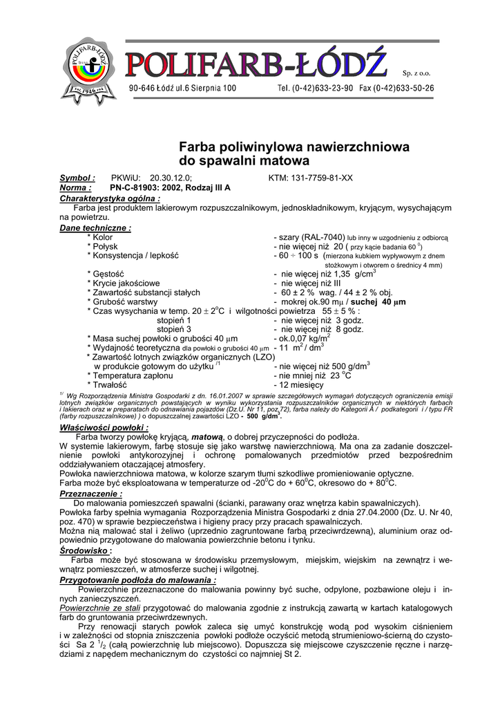 Farba poliwinylowa nawierzchniowa do spawalni matowa Symbol : PKWiU: 20.30.12.0; KTM: 131-7759-81-XX Norma : PN-C-81903: 2002, Rodzaj III A Charakterystyka ogólna : Farba jest produktem lakierowym rozpuszczalnikowym, jednoskładnikowym, kryjącym, wysychającym na powietrzu. Dane techniczne : * Kolor - szary (RAL-7040) lub inny w uzgodnieniu z odbiorcą * Połysk - nie więcej niż 20 ( przy kącie badania 60 0) * Konsystencja / lepkość - 60 ÷ 100 s (mierzona kubkiem wypływowym z dnem stożkowym i otworem o średnicy 4 mm) * Gęstość - nie więcej niż 1,35 g/cm3 * Krycie jakościowe - nie więcej niż III * Zawartość substancji stałych - 60 ± 2 % wag. / 44 ± 2 % obj. * Grubość warstwy - mokrej ok.90 mµ / suchej 40 µm * Czas wysychania w temp. 20 ± 2oC i wilgotności powietrza 55 ± 5 % : stopień 1 - nie więcej niż 3 godz. stopień 3 - nie więcej niż 8 godz. * Masa suchej powłoki o grubości 40 µm - ok.0,07 kg/m2 * Wydajność teoretyczna dla powłoki o grubości 40 µm - 11 m2 / dm3 * Zawartość lotnych związków organicznych (LZO) w produkcie gotowym do użytku /1 - nie więcej niż 500 g/dm3 * Temperatura zapłonu - nie mniej niż 23 oC * Trwałość - 12 miesięcy 1/ Wg Rozporządzenia Ministra Gospodarki z dn. 16.01.2007 w sprawie szczegółowych wymagań dotyczących ograniczenia emisji lotnych związków organicznych powstających w wyniku wykorzystania rozpuszczalników organicznych w niektórych farbach i lakierach oraz w preparatach do odnawiania pojazdów (Dz.U. Nr 11, poz.72), farba należy do Kategorii A / podkategorii i / typu FR 3 (farby rozpuszczalnikowe) ) o dopuszczalnej zawartości LZO - 500 g/dm . Właściwości powłoki : Farba tworzy powłokę kryjącą, matową, o dobrej przyczepności do podłoża. W systemie lakierowym, farbę stosuje się jako warstwę nawierzchniową. Ma ona za zadanie doszczelnienie powłoki antykorozyjnej i ochronę pomalowanych przedmiotów przed bezpośrednim oddziaływaniem otaczającej atmosfery. Powłoka nawierzchniowa matowa, w kolorze szarym tłumi szkodliwe promieniowanie optyczne. Farba może być eksploatowana w temperaturze od -200C do + 600C, okresowo do + 800C. Przeznaczenie : Do malowania pomieszczeń spawalni (ścianki, parawany oraz wnętrza kabin spawalniczych). Powłoka farby spełnia wymagania Rozporządzenia Ministra Gospodarki z dnia 27.04.2000 (Dz. U. Nr 40, poz. 470) w sprawie bezpieczeństwa i higieny pracy przy pracach spawalniczych. Można nią malować stal i żeliwo (uprzednio zagruntowane farbą przeciwrdzewną), aluminium oraz odpowiednio przygotowane do malowania powierzchnie betonu i tynku. Środowisko : Farba może być stosowana w środowisku przemysłowym, miejskim, wiejskim na zewnątrz i wewnątrz pomieszczeń, w atmosferze suchej i wilgotnej. Przygotowanie podłoża do malowania : Powierzchnie przeznaczone do malowania powinny być suche, odpylone, pozbawione oleju i innych zanieczyszczeń. Powierzchnie ze stali przygotować do malowania zgodnie z instrukcją zawartą w kartach katalogowych farb do gruntowania przeciwrdzewnych. Przy renowacji starych powłok zaleca się umyć konstrukcję wodą pod wysokim ciśnieniem i w zależności od stopnia zniszczenia powłoki podłoże oczyścić metodą strumieniowo-ścierną do czystości Sa 2 1/2 (całą powierzchnię lub miejscowo). Dopuszcza się miejscowe czyszczenie ręczne i narzędziami z napędem mechanicznym do czystości co najmniej St 2. Oczyszczone podłoże zagruntować jedną z niżej podanych farb przeciwrdzewnych w okresie nie dłuższym niż 6 godz. po oczyszczeniu, aby zapobiec powstawaniu rdzy nalotowej. Aluminium po odtłuszczeniu i oczyszczeniu z produktów korozji można malować farbą bezpośrednio (bez gruntowania). W razie potrzeby powierzchnię lekko przeszlifować. Tynk i beton można malować nie wcześniej niż po 4 tygodniach od wykonania. Przed malowaniem farbą podłoże zagruntować preparatem dyspersyjnym do gruntowania LOWIGRUNT. Przy malowaniu renowacyjnym powierzchnię oczyścić z brudu, kurzu oraz powłok farb słabo trzymających się podłoża, braki podłoża uzupełnić odpowiednimi zaprawkami, a następnie całą powierzchnię lub miejscowo zagruntować ww. preparatem. Warunki malowania : Temperatura farby Temperatura podłoża Wilgotność wzgl. powietrza 10 ÷ 30 oC 5 ÷ 40 oC najwyżej 80 % Temperatura podłoża powinna być wyższa od punktu rosy co najmniej o 3oC. Farbę przed użyciem dokładnie wymieszać nawet, gdy osad nie występuje. Sposób aplikacji : Farbę nakładać: - pędzlem lub wałkiem: rozcieńczenie 0 ÷ 3 % wag. - natryskiem powietrznym lub zanurzeniowo: rozcieńczenie 5 ÷ 10 % wag. - natryskiem bezpowietrznym: rozcieńczenie 0 ÷ 3 % wag., średnica dyszy 0,33 ÷ 0,46 mm, ciśnienie natrysku 12 ÷ 18 MPa, kąt natrysku 20 ÷ 60 o (zależy od uwarunkowań praktycznych). Farba o lepkości handlowej nadaje się do malowania pędzlem, wałkiem oraz natryskiem bezpowietrznym (hydrodynamicznym). Do natrysku powietrznego (pneumatycznego) oraz malowania zanurzeniowego, farbę należy rozcieńczyć (5 ÷10 % wag.). Natrysk pneumatyczny oraz malowanie metodą zanurzeniową można stosować wyłącznie w instalacjach. Rozcieńczalnik / zmywacz : Rozcieńczalnik do wyrobów poliwinylowych i chlorokauczukowych ogólnego stosowania (KTM : 1318157-01-01). Czas sezonowania powłoki przed nałożeniem następnej warstwy : Kolejne warstwy farby można nakładać w odstępach co najmniej 3 godzinnych. W przypadku gruntowania podłoża, farbę nakładać po co najmniej 12 godz. schnięcia warstwy gruntującej. Tworzenie zestawu z innymi produktami malarskimi: W zależności od potrzeb i metody aplikacji stosować 1÷3 warstw farby. Farbę można nakładać na powłoki: - farby poliwinylowej do gruntowania przeciwrdzewnej LOWIKOR-2 (KTM: 131-7722-04-xx), - farby poliwinylowej do gruntowania przeciwrdzewnej tiksotropowej TIXOKOR-G2 (KTM:131-7722-02xx), - farby ftalowej do gruntowania przeci