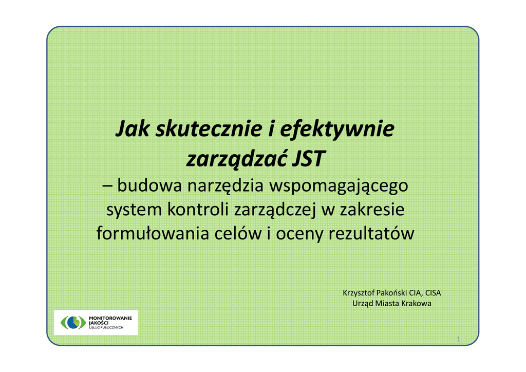 Jak skutecznie i efektywnie zarządzać JST – budowa narzędzia wspomagającego system kontroli zarządczej w zakresie formułowania celów i oceny rezultatów Krzysztof Pakoński CIA, CISA Urząd Miasta Krakowa 1 Skutecznie oznacza - że skutek, wynik działań jest zgodny z wolą, oczekiwaniem realizatora (a ( także klienta). ). 1. Zamiar, oczekiwanie czyli cel do osiągnięcia musi być określony. 2. Sposób oceny zgodności uzyskanego wyniku z zamiarem (oczekiwaniem, celem) musi być zaplanowany. Oczekiwanie, zamiar winien być sformułowany w postaci zdania logicznego. Przykłady: a) Torba jest ciężka, waży nie mniej niż 10 kg. - prawdziwość stwierdzamy szybko (po zważeniu torby) b) W najbliższych 5 latach średnia ilość pyłu w powietrzu w centrum zostanie obniżona do poziomu zgodności z normą… - prawdziwość można będzie stwierdzić dopiero po 5 latach. c) Należy zintensyfikować działania na rzecz ochrony środowiska – trudno stwierdzić prawdziwość Zdanie logiczne zawiera w sobie kryterium. Wykorzystując to kryterium definiujemy miarę – wielkość, którą można zmierzyć – jej wartość pozwoli rozróżnić prawdę od fałszu w zdaniu logicznym. A zatem, aby można mówić o zarządzaniu skutecznym : 1. Cele muszą być wyraźnie formułowane 2. Sposób formułowania celów musi zapewnić ich „rozliczalność”. Cele warto formułować co najmniej na 2 poziomach: strategicznym i operacyjnym (rocznym) 2 Model Zarządzania Zintegrowanego 1 Opis stanu - baza danych 3 Strategie sektorowe (dziedzinowe)oczekiwana zmiana stanu 5 6 7 U MIARY Wybór działań, cele szczegółowe, sformułowanie zadań 4 8 U Określenie hierarchii potrzeb i celów 2 MIARY “produkcja i dostarczanie usług” Ocena wykonania zadań Ocena zmiany stanu U U MIARY MIARY Uzupełnienie bazy i wnioski U - UCZESTNICTWO 3 Ryzyko strategiczne i operacyjne Cele strategiczne Definicja oczekiwanej zmiany Cele operacyjne Plan działania – określenie zadań Wskaźnik końcowy Miernik bezpośredni Dostarczanie usług i produktów Ocena wykonania zadań Ocena osiągnięcia oczekiwanej zmiany Ryzyko operacyjne Ryzyko strategiczne 4 MJUP (projekt innowacyjny sponsorowany przez MAiC w ramach KST „Dobre rządzenie” – realizowany przez Kraków w partnerstwie z Poznaniem) W ramach projektu przygotowujemy: 1. Katalog wskaźników jakości usług i jakości życia w powiązaniu z działaniami jakie JST podejmuje dla ich zmian . 2. „Podręczniki” proponujące zestaw wymagań wobec systemu zarządzania 3. System informatyczny obejmujący: • Obszar planowania (zapis wieloletniego planu finansowego, planowanie zadań budżetowych i programów wieloletnich, generowanie listy przedsięwzięć) • Obszar zarządzania ryzykiem (ryzyka strategiczne, operacyjne, projektowe oraz bezpieczeństwa informacji) • Obszar monitorowania zadań i procesów – analiza osiągniętych wskaźników • Obszar planowania i zapisu rezultatów oraz rekomendacji z badań audytowych • Hurtownię danych gromadzącą dane z systemów finansowo- księgowych urzędów i największych budżetowych jednostek miejskich oraz dane z innych systemów (np. rejestracja czasu pracy) • Zbiór raportów pozwalający m.in. na bieżącą obserwację dla każdego zadania budżetowego planu, zaangażowania, zobowiązań, wydatków oraz kosztów, a także wykonania zakresu rzeczowego i aktualnych wartości wskaźników. 5 MJUP (projekt innowacyjny sponsorowany przez MAiC w ramach KST „Dobre rządzenie” – realizowany przez Kraków w partnerstwie z Poznaniem) System Informatyczny w ramach projektu budowany jest wg metodyki SCRUM. Na podstawie wymagań zapisanych w załączniku do umowy dostawca w odstępach miesięcznych (etapach) prezentuje do odbioru uzgodnioną w planie etapu i gotową do użytku funkcjonalność aplikacji. Zamawiający mając dostęp do środowiska, w którym pracuje dostawca może na bieżąco śledzić rozwiązania i wnosić uwagi, korekty, a także sugestie. Taki rytm wymaga od nas więcej pracy w trakcie budowy, ale nasz wpływ na szczegółowe rozwiązania jest duży i w efekcie produkt jest znacznie lepiej dostosowany do potrzeb, potrzeb niż przy metodyce tradycyjnej. 6 Dziedziny zarządzania Uniwersum, jakim zajmuje się JST dzielimy (umownie) na rozłączne części. Nazywamy je dziedzinami. W ramach porządkowania, budując system wspomagający zarządzanie zdefiniowano następujące dziedziny: 7 8 9 10 Wskaźniki „kontekstowe” (informacyjne, śledzimy ich zmiany, bo są istotne dla podejmowania decyzji, ale mamy zbyt mały wpływ, aby istotnie oddziaływać) np.: Demografia (ilość ludzi, dzieci, rozkład wiekowy) Dane klimatyczne, dane o rynku pracy, działalności gospodarczej Wskaźniki „strategiczne” (formułowane dla celów, które wyznaczyliśmy, chcemy mieć na nie wpływ i dla ich zmiany przygotowujemy programy i podejmujemy działania) np.: Przepustowość sieci dróg miejskich w głównych ciągach komunikacyjnych Osiągane standardy w transporcie publicznym (lub innych usługach) 11 Program sektorowy - element kontroli zarządczej na poziomie strategicznym Jednostka rozliczeniowa w planie wieloletnim - zespół zaplanowanych co najmniej na kilka lat działań, przygotowanych i wykonywanych w celu zmiany jednego lub kilku wskaźników strategicznych zdefiniowanych na podstawie strategii. Program obejmuje zadania, projekty, przedsięwzięcia i posiada finansowanie zapewnione w WPF. System kontroli zarządczej dla programów sektorowych ujęto w ZPMK. ZPMK. 12 13 14 15 16 Zadanie budŜetowe – podstawowy element kontroli zarządczej Jednostka rozliczeniowa w budŜecie rocznym o określonym celu, dostarczanych produktach, wymaganiach jakościowych i przewidywaniach ilościowych oraz zasobach (środki finansowe, personel, infrastruktura) zaplanowanych do wykorzystania. W zadaniu zdefiniowano mierniki i wskaźniki operacyjne pozwalające ocenić jego wykonanie. 17 18
