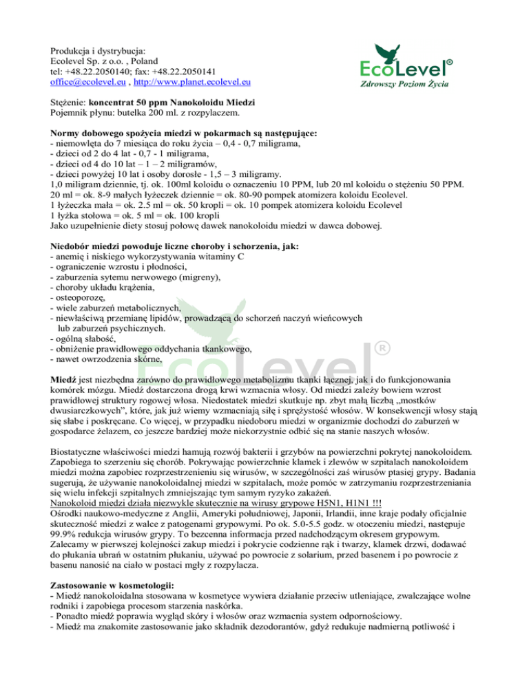 Produkcja i dystrybucja: Ecolevel Sp. z o.o. , Poland tel: +48.22.2050140; fax: +48.22.2050141 [email protected] , http://www.planet.ecolevel.eu St enie: koncentrat 50 ppm Nanokoloidu Miedzi Pojemnik p ynu: butelka 200 ml. z rozpylaczem. Normy dobowego spo ycia miedzi w pokarmach s nast puj ce: - niemowl ta do 7 miesi ca do roku ycia – 0,4 - 0,7 miligrama, - dzieci od 2 do 4 lat - 0,7 - 1 miligrama, - dzieci od 4 do 10 lat – 1 – 2 miligramów, - dzieci powy ej 10 lat i osoby doros e - 1,5 – 3 miligramy. 1,0 miligram dziennie, tj. ok. 100ml koloidu o oznaczeniu 10 PPM, lub 20 ml koloidu o st eniu 50 PPM. 20 ml = ok. 8-9 ma ych eczek dziennie = ok. 80-90 pompek atomizera koloidu Ecolevel. 1 eczka ma a = ok. 2.5 ml = ok. 50 kropli = ok. 10 pompek atomizera koloidu Ecolevel 1 ka sto owa = ok. 5 ml = ok. 100 kropli Jako uzupe nienie diety stosuj po ow dawek nanokoloidu miedzi w dawca dobowej. Niedobór miedzi powoduje liczne choroby i schorzenia, jak: - anemi i niskiego wykorzystywania witaminy C - ograniczenie wzrostu i p odno ci, - zaburzenia sytemu nerwowego (migreny), - choroby uk adu kr enia, - osteoporoz , - wiele zaburze metabolicznych, - niew ciw przemian lipidów, prowadz do schorze naczy wie cowych lub zaburze psychicznych. - ogóln s abo , - obni enie prawid owego oddychania tkankowego, - nawet owrzodzenia skórne, Mied jest niezb dna zarówno do prawid owego metabolizmu tkanki cznej, jak i do funkcjonowania komórek mózgu. Mied dostarczona drog krwi wzmacnia w osy. Od miedzi zale y bowiem wzrost prawid owej struktury rogowej w osa. Niedostatek miedzi skutkuje np. zbyt ma liczb „mostków dwusiarczkowych”, które, jak ju wiemy wzmacniaj si i spr ysto w osów. W konsekwencji w osy staj si s abe i poskr cane. Co wi cej, w przypadku niedoboru miedzi w organizmie dochodzi do zaburze w gospodarce elazem, co jeszcze bardziej mo e niekorzystnie odbi si na stanie naszych w osów. Biostatyczne w ciwo ci miedzi hamuj rozwój bakterii i grzybów na powierzchni pokrytej nanokoloidem. Zapobiega to szerzeniu si chorób. Pokrywaj c powierzchnie klamek i zlewów w szpitalach nanokoloidem miedzi mo na zapobiec rozprzestrzenieniu si wirusów, w szczególno ci za wirusów ptasiej grypy. Badania sugeruj , e u ywanie nanokoloidalnej miedzi w szpitalach, mo e pomóc w zatrzymaniu rozprzestrzeniania si wielu infekcji szpitalnych zmniejszaj c tym samym ryzyko zaka . Nanokoloid miedzi dzia a niezwykle skutecznie na wirusy grypowe H5N1, H1N1 !!! rodki naukowo-medyczne z Anglii, Ameryki po udniowej, Japonii, Irlandii, inne kraje poda y oficjalnie skuteczno miedzi z walce z patogenami grypowymi. Po ok. 5.0-5.5 godz. w otoczeniu miedzi, nast puje 99.9% redukcja wirusów grypy. To bezcenna informacja przed nadchodz cym okresem grypowym. Zalecamy w pierwszej kolejno ci zakup miedzi i pokrycie codzienne r k i twarzy, klamek drzwi, dodawa do p ukania ubra w ostatnim p ukaniu, u ywa po powrocie z solarium, przed basenem i po powrocie z basenu nanosi na cia o w postaci mg y z rozpylacza. Zastosowanie w kosmetologii: - Mied nanokoloidalna stosowana w kosmetyce wywiera dzia anie przeciw utleniaj ce, zwalczaj ce wolne rodniki i zapobiega procesom starzenia naskórka. - Ponadto mied poprawia wygl d skóry i w osów oraz wzmacnia system odporno ciowy. - Mied ma znakomite zastosowanie jako sk adnik dezodorantów, gdy redukuje nadmiern potliwo i eliminuje przykry zapach wynik y z bakteryjnego rozk adu potu. - Mied doskonale si sprawdza w kosmetykach przeciwgrzybicznych, np. w zastosowaniu do stóp. Nanocz steczki miedzi w ci gu kilkunastu minut "robi porz dek" z bakteriami i grzybami znajduj cymi si na stopach, b w obuwiu. Nanokoloid miedzi mo na stosowa zarówno bezpo rednio na stopy jak i do wewn trz obuwia. Po odparowaniu wody, nanocz steczki miedzi osadzaj si na powierzchni skóry, tworz c na stopach trwa warstw ochronn . Po godzinnej k pieli w basenie publicznym, warstwa ochronna miedzi pozostaje nienaruszona na powierzchni naskórka. Nie bójmy si zatem korzysta z basenów. - Poza tym, mied nanokoloidalna mo e by stosowana z dobrym wynikiem jako dodatek dezynfekuj cy wod w basenach k pielowych. Zastosowanie w gospodarstwie domowym: Nanokoloid miedzi chroni wod pitn przed wieloma zanieczyszczeniami typu organicznego. Poza tym nanokoloid miedzi skutecznie pomaga w walce z wiecznie ciemniej cymi fugami w azienkach. Uniemo liwia rozwój grzybów na zawilgoconych cianach i sufitach. Efekt grzybobójczy mo na, wi c uzyska samemu, spryskuj c odpowiednie miejsca w azienkach nanokoloidem miedzi. Ogólnie o miedzi: Mied (medycyna - dietetyka), jest pierwiastkiem ladowym wyst puj cym w ca ym organizmie. Z ogólnej ilo ci, oko o 100 miligramów, ponad po owa znajduje si w mi niach i ko cu. Najwi ksza koncentracja miedzi wyst puje w w trobie, mózgu, sercu i w nerkach. Mied wchodzi w sk ad wielu enzymów i bierze udzia w wielu procesach przemian metabolicznych. Uczestniczy w syntezie hemoglobiny i razem z elazem bierze udzia w dostarczaniu tlenu, szczególnie wra liwej na niedotlenienie, tkance nerwowej. Mied wchodzi w sk ad enzymów niezb dnych w procesach tworzenia kolagenu, elastyny, melaniny i hormonopodobnych zwi zków - prostaglandyn, bior cych udzia w regulacji ci nienia krwi, pracy serca, gojeniu wrzodów dka i likwidacji stanów zapalnych. Przypuszcza si e niedobory miedzi mog mie zwi zek z wadami kr gos upa a zw aszcza skoliozy, powstaj cej w wieku rozwojowym. Du o miedzi znajduje si w owocach morza, w orzechach, podrobach, w grzybach, w li ciastych warzywach zielonych, w pe noziarnistych produktach zbo owych i w wodzie z instalacji o miedzianych rurach. 100 gramów gotowanej w troby zawiera oko o 3 miligramów miedzi, jedna ostryga – ponad 2 miligramy, owoc awokado – 1 miligram, banan – 0,26 miligrama, 100 gramów szpinaku gotowanego – 0,13 miligrama, kromka chleba razowego – 0,06 miligrama, gotowana marchew – 0,06 miligrama. Bardzo ma o miedzi zawieraj , mleko i ma o przetworzone produkty mlecz