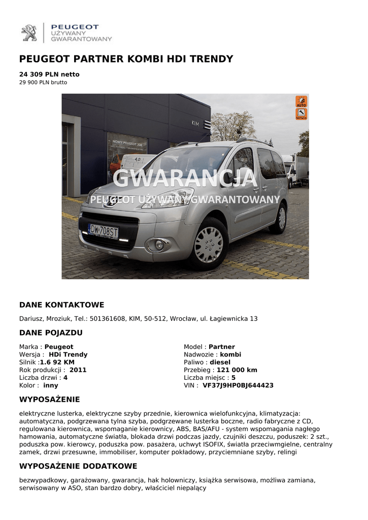 PEUGEOT PARTNER KOMBI HDI TRENDY 24 309 PLN netto 29 900 PLN brutto DANE KONTAKTOWE Dariusz, Mroziuk, Tel.: 501361608, KIM, 50-512, Wrocław, ul. Łagiewnicka 13 DANE POJAZDU Marka : Peugeot Wersja : HDi Trendy Silnik :1.6 92 KM Rok produkcji : 2011 Liczba drzwi : 4 Kolor : inny Model : Partner Nadwozie : kombi Paliwo : diesel Przebieg : 121 000 km Liczba miejsc : 5 VIN : VF37J9HP0BJ644423 WYPOSAŻENIE elektryczne lusterka, elektryczne szyby przednie, kierownica wielofunkcyjna, klimatyzacja: automatyczna, podgrzewana tylna szyba, podgrzewane lusterka boczne, radio fabryczne z CD, regulowana kierownica, wspomaganie kierownicy, ABS, BAS/AFU - system wspomagania nagłego hamowania, automatyczne światła, blokada drzwi podczas jazdy, czujniki deszczu, poduszek: 2 szt., poduszka pow. kierowcy, poduszka pow. pasażera, uchwyt ISOFIX, światła przeciwmgielne, centralny zamek, drzwi przesuwne, immobiliser, komputer pokładowy, przyciemniane szyby, relingi WYPOSAŻENIE DODATKOWE bezwypadkowy, garażowany, gwarancja, hak holowniczy, książka serwisowa, możliwa zamiana, serwisowany w ASO, stan bardzo dobry, właściciel niepalący OPIS POJAZDU AUTORYZOWANY DEALER PEUGEOT KIM SP. Z O.O. OFERUJE SAMOCHODY UŻYWANE W PROGRAMIE GWARANCYJNYM „PEUGEOT UŻYWANY GWARANTOWANY” WE WROCŁAWIU PRZY UL. ŁAGIEWNICKIEJ 13. Opis pojazdu: -GWARANCJA -MOŻLIWOŚĆ KREDYTU BEZ WPŁATY I BEZ ZAŚWIADCZEŃ -PAKIET UBEZPIECZENIOWY AC/OC/NW NA ATRAKCYJNYCH WARUNKACH -PRZYJMUJEMY SAMOCHODY W ROZLICZENIU WSZYSTKICH MAREK -KUPUJĄCY ZWOLNIONY Z OPŁATY SKARBOWEJ 2% ZADZWOŃ I ZAPYTAJ O SZCZEGÓŁY, TEL : 501 36 16 08 Wyposażenie standardowe: ABS z rozdziałem siły hamowania Centralny zamek + blokowanie drzwi podczas ruszania Drzwi tylne klapa przeszklona (szyba ogrzewana + wycieraczka) Elektrycznie sterowane szyby boczne przednie Hamulce przednie - tarcze wentylowane Hamulce tylne tarczowe Immobiliser Klimatyzacja automatyczna dwustrefowa: filtr przeciwpyłkowy Lusterka boczne regulowane elektrycznie Mocowania fotelika dziecięcego Isofix (x2) w drugim rzędzie siedzeń Oświetlenie wnętrza: 1 lampka gówna + 2 lampki do czytania w konsoli sufitowej z przodu, 1 lampka w przestrzeni bagażowej Pakiet Plus: zdalne sterowanie centralnym zamkiem, lusterka boczne regulowane elektrycznie, szyba po stronie kierowcy sterowana sekwencyjnie ograniczniki Poduszki czołowe dla kierowcy i pasażera (pasażera z możliwością dezaktywacji) Prawe i lewe drzwi boczne przesuwne, przeszklone Reflektory przednie halogenowe (H4) Regulacja kolumny kierownicy manualna w dwóch płaszczyznach Schowki otwarte: na desce rozdzielczej przed pasażerem, w desce rozdzielczej pod centralnymi wylotami powietrza, w desce rozdzielczej nad sterowaniem nawiewem, w podstawie dźwigni zmiany biegów od strony pasażera Schowki zamykane: na desce rozdzielczej przed kierowcą, w desce rozdzielczej przed pasażerem, 2 x w podłodze w II rzędzie 0016 Szyba po stronie kierowcy sterowana sekwencyjnie Szyby barwione Szyby uchylne w 2-rzędzie i stałe w 3-rzędzie Tapicerka siedzeń tkaninowa WIP Sound: komputer pokładowy, radio CD z MP3 + 4 głośniki, sterowanie z kolumny kierownicy, monochromatyczny wyświetlacz numeryczny A+ na desce rozdzielczej Wspomaganie kierownicy progresywne ZADZWOŃ I ZAPYTAJ O SZCZEGÓŁY, TEL : 501 36 16 08 Dane zawarte w cenniku nie stanowią oferty w rozumieniu przepisów prawa polskiego. Treść ogłoszenia ma charakter wyłącznie informacyjny, w szczególności nie należy jej traktować jako wiążącego prawnie zobowiązania lub zapewnienia gwarancyjnego w rozumieniu art. 13. Ustawy z 27 lipca 2002 r. o szczególnych warunkach sprzedaży konsumenckiej – gwarancję stanowi wyłącznie dokument gwarancyjny wydany przez sprzedawcę. Zachęcamy do sprawdzenia samochodu przed zakupem i wykonania jazdy próbnej. Światła przeciwmgielne, Zamek centralny z pilotem, Wspomaganie układu kierowniczego - progresywne, Zderzaki: przedni z dolnym wykończeniem w kolorze srebrnym, tylny dwukolorowy, Tylna klapa podnoszona do góry, Szyby boczne w 2. rzędzie uchylne, Szyby barwione, Lusterka boczne regulowane elektrycznie, System wspomagania hamowania awaryjnego, Radio CD z MP3, REF - system rozdziału sił hamowania, Drzwi boczne prawe przesuwne przeszklone, Klimatyzacja, Listwy boczne w kolorze nadwozia, Osłona przestrzeni bagażowej, Klamki i lusterka w kolorze nadwozia, ABS, Drzwi boczne lewe przesuwne przeszklone, Kanapa 3 osobowa, dzielona, Elektryczne podnoszenie szyb, przód, Pakiet Bezpieczeństwo dzieci, Airbag kierowcy i pasażera, Lakier metalik, Klimatyzacja automatyczna, Tempomat, Relingi dachowe Pierwszy właściciel, Bezwypadkowy, Pojazd regularnie serwisowany QR CODE DLA OGŁOSZENIA W SERWISIE UZYWANYGWARANTOWANY.PL Powered by TCPDF (www.tcpdf.org)