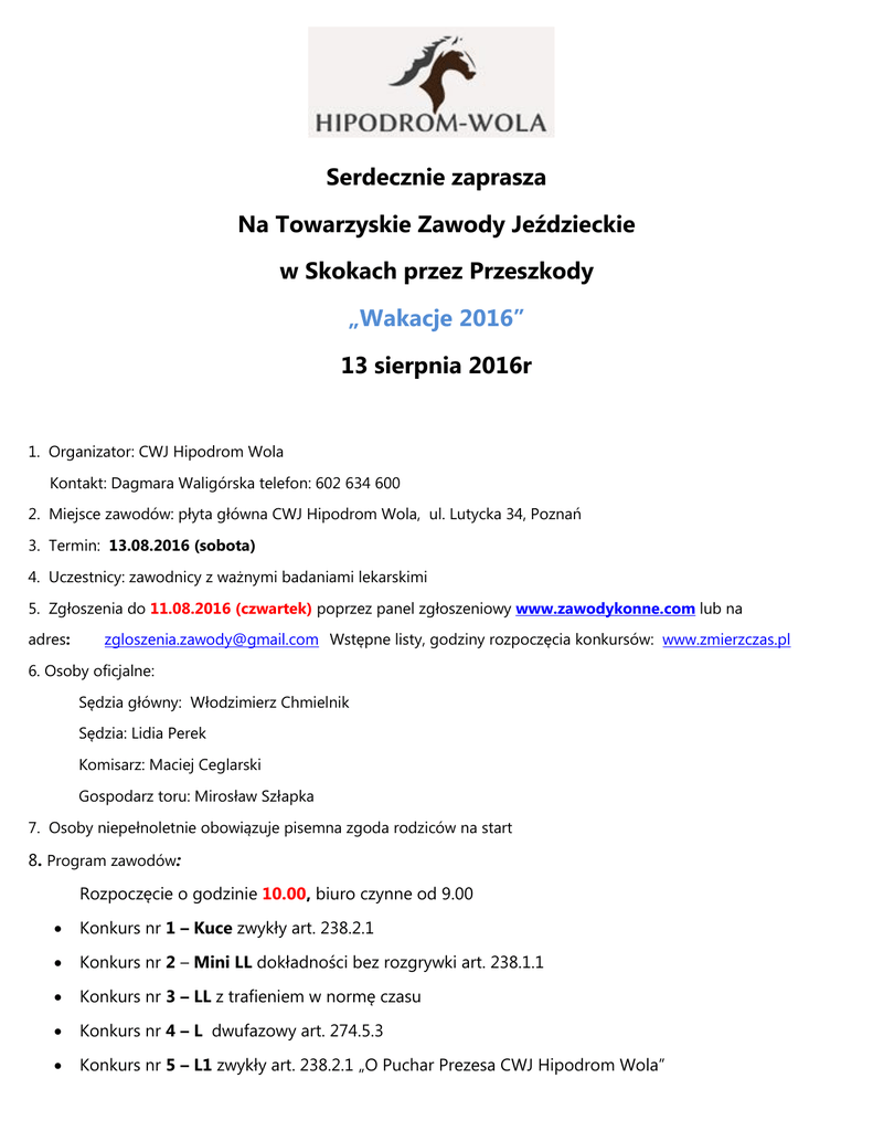 Serdecznie zaprasza Na Towarzyskie Zawody Jeździeckie w Skokach przez Przeszkody „Wakacje 2016” 13 sierpnia 2016r 1. Organizator: CWJ Hipodrom Wola Kontakt: Dagmara Waligórska telefon: 602 634 600 2. Miejsce zawodów: płyta główna CWJ Hipodrom Wola, ul. Lutycka 34, Poznań 3. Termin: 13.08.2016 (sobota) 4. Uczestnicy: zawodnicy z ważnymi badaniami lekarskimi 5. Zgłoszenia do 11.08.2016 (czwartek) poprzez panel zgłoszeniowy www.zawodykonne.com lub na adres: [email protected] Wstępne listy, godziny rozpoczęcia konkursów: www.zmierzczas.pl 6. Osoby oficjalne: Sędzia główny: Włodzimierz Chmielnik Sędzia: Lidia Perek Komisarz: Maciej Ceglarski Gospodarz toru: Mirosław Szłapka 7. Osoby niepełnoletnie obowiązuje pisemna zgoda rodziców na start 8. Program zawodów: Rozpoczęcie o godzinie 10.00, biuro czynne od 9.00 Konkurs nr 1 – Kuce zwykły art. 238.2.1 Konkurs nr 2 – Mini LL dokładności bez rozgrywki art. 238.1.1 Konkurs nr 3 – LL z trafieniem w normę czasu Konkurs nr 4 – L dwufazowy art. 274.5.3 Konkurs nr 5 – L1 zwykły art. 238.2.1 „O Puchar Prezesa CWJ Hipodrom Wola” W przypadku dwukrotnego startu w konkursie danej pary, do klasyfikacji końcowej brany będzie pierwszy przejazd Zgodnie z aktualizacją przepisów, koń ma prawo do dwukrotnego startu podczas zawodów 9. Nagrody Flot’s , puchary W konkursach nr 1,2,3,4 nagrody rzeczowe funduje Salon Jeździecki Pegaz Bony towarowe w konkursie nr 5 – L1 Konkurs I miejsce II miejsce III miejsce 1,2,3,4 Nagroda rzeczowa Nagroda rzeczowa Nagroda rzeczowa 5 – L1 300 zł 200 zł 100 zł 10. Opłaty startowe: 50 zł za start 11. Boksy – 50 zł za dzień, rezerwacja Dagmara Waligórska tel. 602 634 600 12. Każda zmiana na liście startowej po terminie zgłoszeń – opłata 20 zł (nie dotyczy skreśleń) 13. Protest: każdy musi być podany na piśmie z dołączoną kaucją w wysokości 300 zł 14. Zalecane ubezpieczenie koni oraz następstw od innych zdarzeń losowych. 15. Organizator nie ponosi odpowiedzialności za kradzieże, wypadki i inne szkody mogące wyniknąć w trakcie transportu i uczestnictwa w zawodach. 16. Organizator zastrzega sobie możliwość do zmian w programie zawodów Zapraszamy! CWJ Hipodrom Wola Zawody zostaną rozegrane zgodnie z uchwałą PZJ z dnia 6.12.2013 Propozycje zatwierdzone przez WZJ w dniu 25.07.2016– Ryszard Szymoniak 1. KOŃ JEST NAJWYŻSZYM DOBREM we wszystkich dyscyplinach jeździeckich. 2. Dobro konia jest ważniejsze od interesów hodowców, właścicieli, trenerów, jeźdźców, organizatorów i sponsorów zawodów oraz innych osób oficjalnych. 3. Wszystkie czynności pielęgnacyjne i zabiegi weterynaryjne muszą mieć na celu zdrowie i dobro konia. 4. Dbałość o zdrowie, higienę, odpowiednie żywienie i bezpieczeństwo konia powinna mieć miejsce zawsze i wszędzie. 5. Podczas transportu koni należy zwrócić szczególną uwagę na wentylację, karmienie, pojenie, bezpieczeństwo i właściwe otoczenie zwierząt. 6. Osoby zajmujące się końmi powinny nieustannie podnosić poziom swojej wiedzy na temat treningu, opieki, oraz śledzić postępy nauk zajmujących się koniem. 7. Kompetencje i umiejętności jeździeckie są elementami, które mogą być wykorzystywane wyłącznie dla dobra konia. 8. Koń jako istota żywa nie może być poddawana metodom treningu i jazdy uznawanych przez Międzynarodową Federację Jeździecką za brutalne. 9. Polski Związek Jeździecki ustala odpowiednie sposoby kontroli - wszystkich osób oraz instytucji podległych jego jurysdykcji - dotyczącej respektowania dobra konia. 10. Wszystkie przepisy dotyczące dobra konia obowiązują zawsze podczas treningów i wszelkich zawodów bez względu na ich rangę. Przepisy wszystkich dyscyplin jeździeckich powinny być nieustannie weryfikowane pod kątem dobra konia. POLSKI ZWIĄZEK JEŹDZIECKI