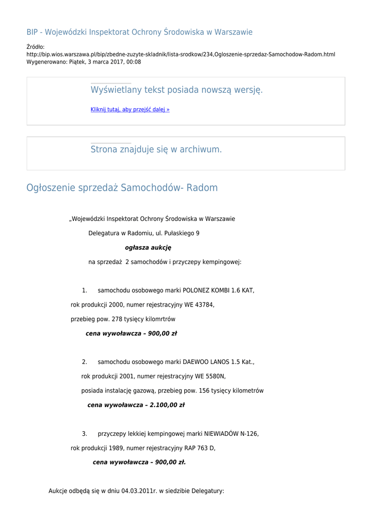 BIP - Wojewódzki Inspektorat Ochrony Środowiska w Warszawie Źródło: http://bip.wios.warszawa.pl/bip/zbedne-zuzyte-skladnik/lista-srodkow/234,Ogloszenie-sprzedaz-Samochodow-Radom.html Wygenerowano: Piątek, 3 marca 2017, 00:08 Wyświetlany tekst posiada nowszą wersję. Kliknij tutaj, aby przejść dalej » Strona znajduje się w archiwum. Ogłoszenie sprzedaż Samochodów- Radom „Wojewódzki Inspektorat Ochrony Środowiska w Warszawie Delegatura w Radomiu, ul. Pułaskiego 9 ogłasza aukcję na sprzedaż 2 samochodów i przyczepy kempingowej: 1. samochodu osobowego marki POLONEZ KOMBI 1.6 KAT, rok produkcji 2000, numer rejestracyjny WE 43784, przebieg pow. 278 tysięcy kilomrtrów cena wywoławcza – 900,00 zł 2. samochodu osobowego marki DAEWOO LANOS 1.5 Kat., rok produkcji 2001, numer rejestracyjny WE 5580N, posiada instalację gazową, przebieg pow. 156 tysięcy kilometrów cena wywoławcza – 2.100,00 zł 3. przyczepy lekkiej kempingowej marki NIEWIADÓW N-126, rok produkcji 1989, numer rejestracyjny RAP 763 D, cena wywoławcza – 900,00 zł. Aukcje odbędą się w dniu 04.03.2011r. w siedzibie Delegatury: - o godz. 11.00 - sprzedaż Poloneza Kombi - o godz. 12.00 - sprzedaż Daewoo Lanosa - o godz. 13.00 – sprzedaż przyczepy kempingowej. Ww. pojazdy i przyczepę można oglądać w dniu 03.03.2011r. w godzinach 12.00-14.00. Dodatkowe informacje można uzyskać pod numerem telefonu 48/ 36-400-46(47) w. 22. Wpłacenie wadium w wysokości 10% ceny wywoławczej w dniu 04.03.2011r., odpowiednio w godzinach: 9.30 – 10.30, 10.30-11.30 i 11.30-12.30 w kasie Delegatury. Wadium nie podlega zwrotowi gdy: - żaden z uczestników aukcji nie zaoferował co najmniej ceny wywoławczej, - uczestnik, który wygrał aukcję uchylił się od zawarcia umowy. Minimalna wysokość postąpienia 1% ceny wywoławczej.” Data wytworzenia 2011.02.16 13:00 Data publikacji 2011.02.16 13:00 Rejestr zmianStarsze wersje dokumentu Liczba wizyt: 361 Podmiot udostępniający informację: Wojewódzki Inspektorat Ochrony Środowiska w Warszawie Osoba wytwarzająca/odpowiadająca za informację: Piotr Jackiewicz Osoba udostępniająca informację: Ewa Lorenc Osoba modyfikująca informację:
