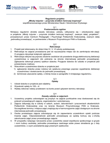 Centrum Pedagogiki i Psychologii Regulamin projektu „Młody inżynier – przyroda źródłem twórczej inspiracji” współfinansowanego przez Ministerstwo Nauki i Szkolnictwa Wyższego §1 Postanowienia ogólne Niniejszy regulamin określa zasady rekrutacji, udziału, odbywania się i odwoływania zajęć w projekcie „Młody inżynier – przyroda źródłem twórczej inspiracji”, zwanym dalej „projektem”, prowadzonym przez Centrum Pedagogiki i Psychologii Politechniki Krakowskiej, zwanym dalej „jednostką prowadzącą”, w partnerstwie z Muzeum Przyrodniczym PAN w Krakowie. 1. 2. 3. 4. §2 Rekrutacja Projekt jest skierowany do dzieci klas IV, V, VI szkoły podstawowej. Rekrutacja na zajęcia prowadzona jest do wyczerpania miejsc lub do zamknięcia rekrutacji. O przyjęciu decyduje kolejność zgłoszeń. Rekrutacja odbywa się poprzez złożenie osobiście lub przesłanie drogą elektroniczną deklaracji uczestnictwa w zajęciach (do pobrania na stronie internetowej jednostki prowadzącej). Zgłoszenia dokonuje prawny opiekun dziecka. Przyjęcie dziecka do udziału w projekcie jest potwierdzane mailowo. Warunkiem uczestnictwa dziecka w projekcie jest: 1) zgłoszenie dziecka przez rodzica lub opiekuna prawnego poprzez wypełnienie deklaracji uczestnictwa i dostarczenie do jednostki prowadzącej, 2) terminowe uiszczenie opłaty, o której mowa w paragrafie 3 niniejszego regulaminu. §3 Opłaty 1. 2. 3. 1. 2. 3. 4. Udział dziecka w projekcie jest odpłatny. Wysokość opłaty to 100,- zł. Wpłaty dokonać należy przelewem na konto przed upływem terminu rekrutacji. §4 Zasady udziału w zajęciach Uczestnicy projektu zobowiązani są przybyć na zajęcia punktualnie oraz dostosować się do poleceń prowadzących zajęcia, organizatorów i wolontariuszy. Zajęcia odbywają się w soboty w salach, aulach, laboratoriach i pracowniach akademickich Politechniki Krakowskiej oraz na terenie Muzeum Przyrodniczego PAN w Krakowie. Szczegółowe terminy i miejsca zajęć znajdują się w harmonogramie zajęć dostępnym na stronie internetowej jednostki prowadzącej. Osoba prowadząca zajęcia zobowiązuje się do zapewnienia uczestnikom opieki podczas trwania zajęć. Odpowiedzialność jednostki prowadzącej za opiekę kończy się z chwilą zakończenia zajęć przez prowadzącego zajęcia. W przypadku rażącego naruszania przez uczestnika zasad współżycia społecznego w grupie i norm kultury osobistej, jednostka prowadząca zastrzega sobie prawo skreślenia go z listy uczestników, o czym powiadamia jego prawnych opiekunów. 1. 2. 3. 1. 2. 3. 1. 2. 3. 1. 2. 3. §5 Rezygnacja z zajęć W przypadku rezygnacji z udziału w Politechnicznym Uniwersytecie Dzieci opiekun prawny jest zobowiązany niezwłocznie poinformować o tym jednostkę prowadzącą osobiście lub drogą elektroniczną. W przypadku rezygnacji z udziału w zajęciach w terminie do 14 dni od daty uiszczenia opłaty, będzie ona zwrócona przelewem, na wskazane przez wnioskodawcę konto. Po tym terminie wpłaty nie będą zwracane. Prośbę o zwrot kosztów należy dostarczyć w formie pisemnej (osobiście lub przesłać na adres e-mail). Musi zawierać ona numer konta i dane właściciela konta, na które ma nastąpić zwrot. §6 Odwołanie zajęć Jednostka prowadząca zastrzega sobie prawo do odwołania zaplanowanych zajęć z przyczyn od niej niezależnych. Informacja o odwołaniu zajęć będzie publikowana na stronie internetowej oraz przesyłana drogą mailową. W przypadku odwołania zajęć jednostka prowadząca deklaruje ich zorganizowanie w innym terminie. §7 Przetwarzanie danych osobowych Opiekun prawny, zgłaszając dziecko na zajęcia projektowe, wyraża tym samym zgodę na gromadzenie i przetwarzanie swoich danych osobowych oraz danych osobowych dziecka przez jednostkę prowadzącą. Dane osobowe będą przetwarzane wyłącznie w celach związanych z uczestnictwem dzieci w zajęciach projektowych. Dane osobowe obejmują: dane opiekuna prawnego (imię i nazwisko, adres elektroniczny, adres zamieszkania oraz telefon kontaktowy), dane dziecka (imię i nazwisko, rok urodzenia, adres zamieszkania, numer/nazwę szkoły podstawowej/klasę). Administratorem bazy danych osobowych studentów jest Rektor Politechniki Krakowskiej im. Tadeusza Kościuszki. §8 Postanowienia końcowe Wypełnienie i przesłanie deklaracji uczestnictwa dziecka w projekcie przez jego opiekunów prawnych oznacza potwierdzenie znajomości treści niniejszego regulaminu oraz jego pełną akceptację. Jednostka prowadząca zastrzega sobie możliwość zmian regulaminu, co ogłaszać będzie każdorazowo na stronie internetowej jednostki prowadzącej. Regulamin wchodzi w życie z dniem 20 stycznia 2017 roku.