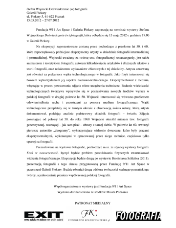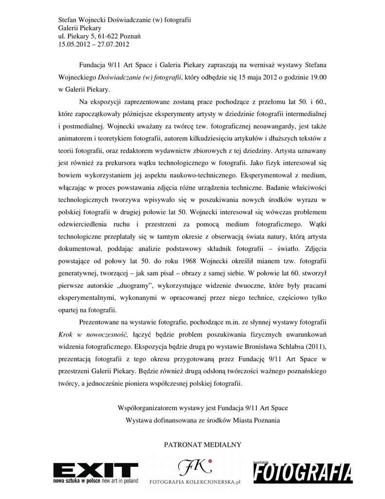 Stefan Wojnecki Doświadczanie (w) fotografii Galerii Piekary ul. Piekary 5, 61-622 Poznań 15.05.2012 – 27.07.2012 Fundacja 9/11 Art Space i Galeria Piekary zapraszają na wernisaż wystawy Stefana Wojneckiego Doświadczanie (w) fotografii, który odbędzie się 15 maja 2012 o godzinie 19.00 w Galerii Piekary. Na ekspozycji zaprezentowane zostaną prace pochodzące z przełomu lat 50. i 60., które zapoczątkowały późniejsze eksperymenty artysty w dziedzinie fotografii intermedialnej i postmedialnej. Wojnecki uważany za twórcę tzw. fotograficznej neoawangardy, jest także animatorem i teoretykiem fotografii, autorem kilkudziesięciu artykułów i dłuższych tekstów z teorii fotografii, oraz redaktorem wydawnictw zbiorowych z tej dziedziny. Artysta uznawany jest również za prekursora wątku technologicznego w fotografii. Jako fizyk interesował się bowiem wykorzystaniem jej aspektu naukowo-technicznego. Eksperymentował z medium, włączając w proces powstawania zdjęcia różne urządzenia techniczne. Badanie właściwości technologicznych tworzywa wpisywało się w poszukiwania nowych środków wyrazu w polskiej fotografii w drugiej połowie lat 50. Wojnecki interesował się wówczas problemem odzwierciedlenia ruchu i przestrzeni za pomocą medium fotograficznego. Wątki technologiczne przeplatały się w tamtym okresie z obserwacją świata natury, którą artysta dokumentował, poddając analizie podstawowy składnik fotografii – światło. Zdjęcia powstające od połowy lat 50. do roku 1968 Wojnecki określił mianem tzw. fotografii generatywnej, tworzącej – jak sam pisał – obrazy z samej siebie. W połowie lat 60. stworzył pierwsze autorskie „duogramy”, wykorzystujące widzenie dwuoczne, które były pracami eksperymentalnymi, wykonanymi w opracowanej przez niego technice, częściowo tylko opartej na fotografii. Prezentowane na wystawie fotografie, pochodzące m.in. ze słynnej wystawy fotografii Krok w nowoczesność, łączyć będzie problem poszukiwania fizycznych uwarunkowań widzenia fotograficznego. Ekspozycja będzie drugą po wystawie Bronisława Schlabsa (2011), prezentacją fotografii z tego okresu przygotowaną przez Fundację 9/11 Art Space w przestrzeni Galerii Piekary. Będzie również drugą odsłoną twórczości ważnego poznańskiego twórcy, a jednocześnie pioniera współczesnej polskiej fotografii. Współorganizatorem wystawy jest Fundacja 9/11 Art Space Wystawa dofinansowana ze środków Miasta Poznania PATRONAT MEDIALNY Stefan Wojnecki Stefan Wojnecki – twórca i teoretyk w dziedzinie fotografii. Studia w Uniwersytecie Poznańskim. Zaliczany do neoawangardy, uprawia fotografię eksperymentalną. Jego postać związana jest z pojęciami fotografii intermedialnej i postmedialnej. Brał udział w prestiżowych wystawach Krok w nowoczesność (1957), Fotografowie poszukujący (1971), Polska fotografia intermedialna lat 80. (1988). Najważniejsze wystąpienia indywidualne to Twarze, Duogramy - seria informacyjna, Sztuka alternatywna, Hiperfotografia, Fotografia tożsamości, Wpisuję swoje uporządkowanie świata, Y sztuki, Alchemia szczelinowego otworka, Społeczeństwa sieci oraz pokaz multimedialny Ku nirwanie. Autor książki Fotografia – gwiazda podwójna kultury oraz skryptu Moja teoria fotografii. Laureat medalu Scholae Bene Merito Akademii Sztuk Pięknych w Poznaniu i Złotego Medalu Zasłużony Kulturze Gloria Artis. Profesor zwyczajny w Uniwersytecie Artystycznym w Poznaniu.