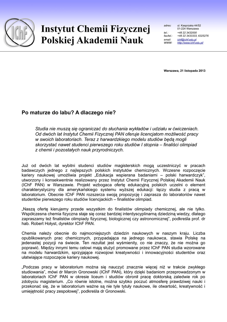 Instytut Chemii Fizycznej Polskiej Akademii Nauk adres: tel.: fax/tel.: email: WWW: ul. Kasprzaka 44/52 01-224 Warszawa +48 22 3432000 +48 22 3433333, 6325276 [email protected] http://www.ichf.edu.pl/ Warszawa, 21 listopada 2013 Po maturze do labu? A dlaczego nie? Studia nie muszą się ograniczać do słuchania wykładów i udziału w ćwiczeniach. Od dwóch lat Instytut Chemii Fizycznej PAN oferuje licencjatom możliwość pracy w swoich laboratoriach. Teraz z harwardzkiego modelu studiów będą mogli skorzystać nawet studenci pierwszego roku studiów I stopnia – finaliści olimpiad z chemii i pozostałych nauk przyrodniczych. Już od dwóch lat wybitni studenci studiów magisterskich mogą uczestniczyć w pracach badawczych jednego z najlepszych polskich instytutów chemicznych. Wczesne rozpoczęcie kariery naukowej umożliwia projekt „Edukacja wspierana badaniami – polski harwardczyk”, utworzony i konsekwentnie realizowany przez Instytut Chemii Fizycznej Polskiej Akademii Nauk (IChF PAN) w Warszawie. Projekt wzbogaca ofertę edukacyjną polskich uczelni o element charakterystyczny dla amerykańskiego systemu wyższej edukacji: łączy studia z pracą w laboratorium. Obecnie IChF PAN rozszerza swoją propozycję i zaprasza do laboratoriów nawet studentów pierwszego roku studiów licencjackich – finalistów olimpiad. „Naszą ofertę kierujemy przede wszystkim do finalistów olimpiady chemicznej, ale nie tylko. Współczesna chemia fizyczna staje się coraz bardziej interdyscyplinarną dziedziną wiedzy, dlatego zapraszamy też finalistów olimpiady fizycznej, biologicznej czy astronomicznej”, podkreśla prof. dr hab. Robert Hołyst, dyrektor IChF PAN. Chemia należy obecnie do najmocniejszych dziedzin naukowych w naszym kraju. Liczba opublikowanych prac chemicznych, przypadająca na jednego naukowca, stawia Polskę na jedenastej pozycji na świecie. Ten rezultat jest wyśmienity, co nie znaczy, że nie można go poprawić. Między innymi temu celowi mają służyć promowane przez IChF PAN studia wzorowane na modelu harwardzkim, sprzyjające rozwojowi kreatywności i innowacyjności studentów oraz ułatwiające rozpoczęcie kariery naukowej. „Podczas pracy w laboratorium można się nauczyć znacznie więcej niż w trakcie zwykłego studiowania”, mówi dr Marcin Gronowski (IChF PAN), który dzięki badaniom przeprowadzonym w laboratoriach IChF PAN w okresie liceum i studiów obronił pracę doktorską zaledwie rok po zdobyciu magisterium. „Co równie istotne, można szybko poczuć atmosferę prawdziwej nauki i przekonać się, że w laboratorium ważne są nie tyle tytuły naukowe, ile otwartość, kreatywność i umiejętność pracy zespołowej”, podkreśla dr Gronowski. „Gdybym nie przyszedł do labu na studiach, po ich ukończeniu miałbym dużo trudniejszy start. A tak gdy broniłem pracy magisterskiej miałem już trzy zgłoszenia patentowe, cztery publikacje naukowe i dwie kolejne w drodze. W efekcie z powodzeniem mogłem startować o najbardziej prestiżowe polskie granty", dodaje doktorant Krzysztof Sozański (IChF PAN). A jak zacząć realizować studia według modelu harwardzkiego? „Finaliści olimpiad nie powinni mieć z tym problemu. Na początek najlepiej do nas przyjść i po prostu porozmawiać”, wyjaśnia prof. Hołyst. Dodatkowe koszty badań, związane z wykorzystaniem przez studentów pomieszczeń, odczynników i najnowocześniejszej aparatury badawczo-pomiarowej, są sfinansowane z funduszy projektów badawczych realizowanych przez IChF PAN. Materiał prasowy przygotowany w ramach grantu NOBLESSE z działania „Potencjał badawczy” 7. Programu Ramowego Unii Europejskiej. Instytut Chemii Fizycznej Polskiej Akademii Nauk (http://www.ichf.edu.pl/) został powołany w 1955 roku jako jeden z pierwszych instytutów chemicznych PAN. Profil naukowy Instytutu jest silnie powiązany z najnowszymi światowymi kierunkami rozwoju chemii fizycznej i fizyki chemicznej. Badania naukowe są prowadzone w 9 zakładach naukowych. Działający w ramach Instytutu Zakład Doświadczalny CHEMIPAN wdraża, produkuje i komercjalizuje specjalistyczne związki chemiczne do zastosowań m.in. w rolnictwie i farmacji. Instytut publikuje około 200 oryginalnych prac badawczych rocznie. KONTAKTY: prof. dr hab. Robert Hołyst Instytut Chemii Fizycznej Polskiej Akademii Nauk tel. +48 22 3433123 email: [email protected] POWIĄZANE STRONY WWW: http://www.ichf.edu.pl/ Strona Instytutu Chemii Fizycznej Polskiej Akademii Nauk. http://www.ichf.edu.pl/press/ Serwis prasowy Instytutu Chemii Fizycznej PAN. MATERIAŁY GRAFICZNE: IIChF131121b_fot01.jpg HR: http://ichf.edu.pl/press/2013/11/IChF131121b_fot01.jpg Instytut Chemii Fizycznej PAN w Warszawie zaprasza do swoich laboratoriów studentów pierwszego roku studiów licencjackich – finalistów olimpiad. Na zdjęciu studenci UKSW w jednym z laboratoriów IChF PAN. (Źródło: IChF PAN / Grzegorz Krzyżewski)