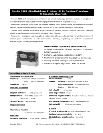 Sondar 5000 Ultradźwiękowy Przetwornik Do Pomiaru Przepływu W Kanałach Otwartych Sondar 5000 jest nowoczesnym systemem do ultradźwiękowego pomiaru poziomu i przepływu w kanałach otwartych metodą bezkontaktowego pomiaru dla różnych spiętrzeń i koryt. Przetwornik SONDAR 5000 działa na zasadzie pomiaru czasu powrotu echa od wysłanego w kierunku medium impulsu ultradźwiękowego wykorzystując do obróbki sygnału najnowszą technologię. Sondar 5000 posiada wbudowany system rejestracji danych (poziom, przepływ chwilowy, całkowity przepływ) za okres czasu maksymalnie wynoszący do 6 miesięcy. Przekaźniki i analogowe wyjście prądowe może pracować przy nastawach fabrycznych lub zmienionych lokalnie przez użytkownika w celu aktywowania alarmów, współpracy ze zdalnymi urządzeniami monitorującymi lub sterującymi procesem. Właściwości użytkowe przetwornika * Możliwość stosowania z róznymi zwężkami i przelewami * 2xSPDT przekaźniki * Graficzny wyświetlacz, rozdzielczość 0.01/h * 4mA/ 20mA proporcjonalne do przepływu chwilowego * Blanking distance setting at user's preference * W warunkach prąd wyjściowy 3.8mA lub 21mA Specyfikacja techniczna Parametry mechaniczne Wymiary Przetwornik 235(S)•185(H) mm Czujnik Przyłącze 59(D)•150(H) mm Wskaźniki metrologiczne Rozdzielczość 1mm Zakres Przepływ Całkowity przepływ 999999999.99 m3/h 3/4”NPT Poziom Warunki otoczenia Kąt wiązki Stopień ochrony Temperatura IP65; przetwornik -20ºC~60ºC; przetwornik -30ºC~70ºC; Czujnik Długość kabla Czas odpowiedzi 500m/s Wartości wyświetlane Dokładność Przepływ chwilowy , Przepływ Pełna kompensacja 0.35% pełnego zakresu Wyjścia Klawiatura lokalna za pomocą 5-ciu przycisków Sondar5000 13º at –3dB Kompensacja temperatury Programowanie Napięcie zasilania 250~3000mm całkowity, Poziom, Grafika 10m (standard) Zasilanie 0.20m3/h to 200,0000.00 m3/h Wyjście analogowe 4~20mA, obciążenie max 700• Nastawialne przekaźniki Obciążalność przekaźnika AC90~260VAC, mniej niż 15VA 3 x SPDT 5A, AC250 IS Technologies Co., Ltd/BMSONIC-BIOTECHNIKA Wymiary Czujnik 3/4" NPT 160 144 75.5 63.5 67 Przetwornik MODE Sondar5000 SET RUN IS Technologies Co., Ltd/BMSONIC-BIOTECHNIKA Listwa zaciskowa Przyłącza sygnałów Wyjść i Wejść PULSE RTN PULSE OC IRTN IOUT GND RX TX RTN VIN RTH TX_CLK SEN+ SEN- V+ A1_COM A2_COM L ER_COM A1_NO A1_NC A2_NO A2_NC ER_NO ER_NC Funkcja Przyłącze V+ Funkcja Uwaga Napięcie wyjściowe +12VDCt SEN- Zacisk ekranu kabla czujnika Czarny SEN+ Zacisk + kabla czujnika Czerwony Wyjście impulsowe z transmitowanego sygnału ultradźwiękowego Opcja TX CLK RTN Zacisk wewnętrznego czujnika temperatury VIN Przyłącze wejścia analogowego TX Zacisk nadajnika RS232C lub zacisk Y terminala RS485 RX zacisk odbiornika RS232C lub zacisk Z terminala RS485 GND IOUT Cyfrowa komunikacja GND Terminal prądu wyjściowego, 4 ~ 20mA proporcjonalne do przepływu Max. 600• chwilowego IRTN PULSE OC PULSE RTN A1_NO Powrót prądu z zacisku IOUT Wyjście impulsowe Open Collector, proporcjonalne do przepływu. Zacisk powrotny sygnału impulsowego z zacisku PULSE OC Alarm1, normalnie rozwarty ze stykiem A1_COM podczas normalnej pracy. A1_COM Alarm1, styk wspólny, rozwarty ze stykiem A1_NO podczas normalnej pracy, A1_NC Alarm1, normalnie zwarty ze stykiem A1_COM podczas normalnej pracy. A2_NO Alarm2, normalnie rozwarty ze stykiem A2_COM podczas normalnej pracy. rozwarty ze stykiem A1_NC w czasie zadziałania alarmu Rozwarty w czasie zadziałania alarmu A2_COM Alarm2, styk wspólny, rozwarty ze stykiem A2_NO podczas normalnej pracy, A2_NC Alarm2, normalnie zwarty ze stykiem A2_COM podczas normalnej pracy. rozwarty ze stykiem A2_NC w czasie zadziałania alarmu Rozwarty w czasie zadziałania alarmu ER_NO Sygnalizacja błędu, normalnie rozwarty ze stykiem ER_COM gdy nie występuje błąd ER_COM Sygnalizacja błędu, styk wspólny, rozwarty ze stykiem ER_NO gdy błąd nie występuje, rozwarty ze stykiem ER_NC gdy jest błąd pomiaru ER_NC Sygnalizacja błędu, normalnie zwarty ze stykiem ER_COM. Rozwarty w czasie zadziałania alarmu L Podłączenie fazy zasilania N Podłączenie przewodu zerowego zasilania * Poniższe punkty są przydatne w czasie sprawdzania przetwornika na instalacji. THR Wyjście standardowego napięcia określającego wielkość sygnału ultradźwię- Punkt testowy kowego. Użytkownik może określić najbardziej korzystną lokalizację sondy. DET Wyjście napięciowe wykrytego sygnału ultradźwiękowego. Punkt testowy TVG Wyjście wzmocnionego napięcia sygnału ultradźwiękowego. Źródło wyzwalania Punkt testowy sygnału DET. Sondar5000 IS Technologies Co., Ltd/BMSONIC-BIOTECHNIKA N Kod Zamówienia *** S5- - A Długość kabla Standard (10m) S10 Wydłużony (meter) *** Napięcie zasilania 24V DC B 90~260V AC F Port komunikacji A RS232 Przykład: S5-025B-A (25m kabla, 24V DC) Sondar5000 IS Technologies Co., Ltd/BMSONIC-BIOTECHNIKA