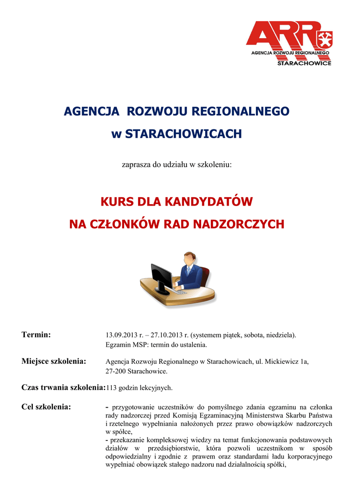 AGENCJA ROZWOJU REGIONALNEGO w STARACHOWICACH zaprasza do udziału w szkoleniu: KURS DLA KANDYDATÓW NA CZŁONKÓW RAD NADZORCZYCH Termin: 13.09.2013 r. – 27.10.2013 r. (systemem piątek, sobota, niedziela). Egzamin MSP: termin do ustalenia. Miejsce szkolenia: Agencja Rozwoju Regionalnego w Starachowicach, ul. Mickiewicz 1a, 27-200 Starachowice. Czas trwania szkolenia:113 godzin lekcyjnych. Cel szkolenia: - przygotowanie uczestników do pomyślnego zdania egzaminu na członka rady nadzorczej przed Komisją Egzaminacyjną Ministerstwa Skarbu Państwa i rzetelnego wypełniania nałożonych przez prawo obowiązków nadzorczych w spółce, - przekazanie kompleksowej wiedzy na temat funkcjonowania podstawowych działów w przedsiębiorstwie, która pozwoli uczestnikom w sposób odpowiedzialny i zgodnie z prawem oraz standardami ładu korporacyjnego wypełniać obowiązek stałego nadzoru nad działalnością spółki, - usystematyzowanie i pogłębienie wiedzy z zakresu zarządzania, prawa, finansów, marketingu, restrukturyzacji i budowy strategii rynkowych, - zrozumienie roli i zakresu odpowiedzialności rady nadzorczej w sprawowaniu nadzoru nad spółką. Program szkolenia: 1) Rola państwa w gospodarce. 2) Zasady działalności przedsiębiorców. 3) Pomoc publiczna dla przedsiębiorców. 4) Rynek kapitałowy w Polsce. 5) Elementy prawa cywilnego. 6) Spółki handlowe – tworzenie, łączenie, dzielenie, funkcjonowanie i likwidowanie. 7) Komercjalizacja i prywatyzacja. 8) Problematyka związków zawodowych w procesie komercjalizacji i prywatyzacji oraz skutki tych procesów w świetle prawa pracy. 9) Rola organów spółki w procesach prywatyzacji w świetle prawa pracy. 10) Kompetencje organów spółek prawa handlowego, w tym zasady funkcjonowania rad nadzorczych w jednoosobowych spółkach Skarbu Państwa. 11) Odpowiedzialność członków rad nadzorczych i zarządów. 12) Ład korporacyjny (corporate governance) w spółkach Skarbu Państwa. 13) Prawo upadłościowe, układowe i inne postępowanie naprawcze. 14) Zarządzanie przedsiębiorstwem. 15) Marketing w przedsiębiorstwie. 16) Biznes plan. 17) Metody wyceny mienia przedsiębiorstwa. 18) Rachunkowość i finanse w przedsiębiorstwie. 19) Wprowadzenie do rachunkowości zarządczej i controllingu. 20) Restrukturyzacja przedsiębiorstw. 21) Repetytorium - w tym egzamin próbny. Program kursu uwzględnia minimum programowe określone w Rozporządzeniu Rady Ministrów z dnia 7 września 2004 roku w sprawie szkoleń i egzaminów dla kandydatów na członków rad nadzorczych spółek, w których Skarb Państwa jest jedynym akcjonariuszem oraz wynagrodzeń członków rad nadzorczych tych spółek (Dz. U. Nr 198/2004, poz. 2038) MINIMUM PROGRAMOWE MSP – 100 GODZIN ZAJĘĆ Oferujemy: - wysoki poziom zajęć prowadzonych przez najlepszą, doświadczoną kadrę wykładowców, - materiały dydaktyczne w postaci konspektów oraz prezentacji, - zaświadczenie potwierdzające ukończenie kursu. Metodyka prowadzenia: wykłady, warsztaty, praca na pytaniach testowych zajęć: 2 500,00 zł brutto za osobę. Cena: Cena obejmuje uczestnictwo w zajęciach, materiały dydaktyczne opracowane przez wykładowców oraz wydawnictwo książkowe – Kodeks Spółek Handlowych. Informacje dodatkowe: Kandydat powołany przez Ministerstwo Skarbu Państwa do Rady Nadzorczej spółki z jednoosobowym udziałem Skarbu Państwa, winien spełniać następujące warunki: Pozytywny wynik egzaminu przed komisją Ministerstwa Skarbu Państwa. Ukończone studia wyższe (wymóg nie dotyczy kandydatów wybieranych przez pracowników, rolników i rybaków). Min. 3 – 5 lat pracy zawodowej (w zależności od rodzaju spółki). Kandydat powołany przez Ministerstwo Skarbu Państwa do Rady Nadzorczej spółki między innymi z udziałem Skarbu Państwa, winien spełniać następujące warunki: Pozytywny wynik egzaminu przed komisją Ministerstwa Skarbu Państwa. Liczba miejsc ograniczona!!! Szczegółowych informacji udzielają pracownicy Agencji Rozwoju Regionalnego: 25-512 Kielce, ul. Warszawska 21/9 ; tel. 041/ 345-05-33(wew.21) , 501-208-706.