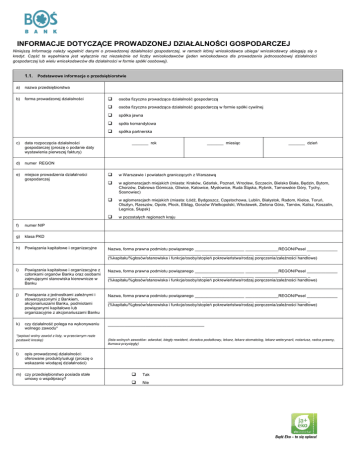 INFORMACJE DOTYCZĄCE PROWADZONEJ DZIAŁALNOŚCI GOSPODARCZEJ Niniejszą Informację należy wypełnić danymi o prowadzonej działalności gospodarczej, w ramach której wnioskodawca ubiega/ wnioskodawcy ubiegają się o kredyt. Część ta wypełniana jest wyłącznie raz niezależnie od liczby wnioskodawców (jeden wnioskodawca dla prowadzenia jednoosobowej działalności gospodarczej lub wielu wnioskodawców dla działalności w formie spółki osobowej). 1.1. Podstawowe informacje o przedsiębiorstwie a) nazwa przedsiębiorstwa b) forma prowadzonej działalności c) data rozpoczęcia działalności gospodarczej (proszę o podanie daty wystawienia pierwszej faktury) d) numer REGON e) miejsce prowadzenia działalności gospodarczej osoba fizyczna prowadząca działalność gospodarczą osoba fizyczna prowadząca działalność gospodarczą w formie spółki cywilnej spółka jawna spóła komandytowa spółka partnerska _______ rok _______ miesiąc _______ dzień w Warszawie i powiatach graniczących z Warszawą w aglomeracjach miejskich (miasta: Kraków, Gdańsk, Poznań, Wrocław, Szczecin, Bielsko Biała, Będzin, Bytom, Chorzów, Dabrowa Górnicza, Gliwice, Katowice, Mysłowice, Ruda Śląska, Rybnik, Tarnowskie Góry, Tychy, Sosnowiec) w aglomeracjach miejskich (miasta: Łódź, Bydgoszcz, Częstochowa, Lublin, Białystok, Radom, Kielce, Toruń, Olsztyn, Rzeszów, Opole, Płock, Elbląg, Gorzów Wielkopolski, Włocławek, Zielona Góra, Tarnów, Kalisz, Koszalin, Legnica, Słupsk) w pozostałych regionach kraju f) numer NIP g) klasa PKD h) Powiązania kapitałowe i organizacyjne Nazwa, forma prawna podmiotu powiązanego _____________________ ______________REGON/Pesel _____________ _________________ ______________________ ______________________ ______________________ _ (%kapitału/%głosów/stanowiska i funkcje/osoby/stopień pokrewieństwa/rodzaj poręczenia/zależności handlowe) i) Powiązania kapitałowe i organizacyjne z członkami organów Banku oraz osobami zajmującymi stanowiska kierownicze w Banku Nazwa, forma prawna podmiotu powiązanego _____________________ ______________REGON/Pesel _____________ _________________ ______________________ ______________________ ______________________ _ (%kapitału/%głosów/stanowiska i funkcje/osoby/stopień pokrewieństwa/rodzaj poręczenia/zależności handlowe) j) Powiązania z jednostkami zależnymi i stowarzyszonymi z Bankiem, akcjonariuszami Banku, podmiotami powiązanymi kapitałowo lub organizacyjnie z akcjonariuszami Banku Nazwa, forma prawna podmiotu powiązanego _____________________ ______________REGON/Pesel _____________ _________________ ______________________ ______________________ ______________________ _ (%kapitału/%głosów/stanowiska i funkcje/osoby/stopień pokrewieństwa/rodzaj poręczenia/zależności handlowe) k) czy działalność polega na wykonywaniu wolnego zawodu* _________________________________________ *(wpisać wolny zawód z listy, w przeciwnym razie postawić kreskę) l) (lista wolnych zawodów: adwokat, biegły rewident, doradca podatkowy, lekarz, lekarz stomatolog, lekarz weterynarii, notariusz, radca prawny, tłumacz przysięgły) opis prowadzonej działalności: oferowane produkty/usługi (proszę o wskazanie wiodącej działalności) m) czy przedsiębiorstwo posiada stałe umowy o współpracy? Tak Nie Bądź Eko – to się opłaca! Główni dostawcy n) p) REGON %obrotu rodzaj/przedmiot dostaw współpraca doraźna*/ na podstawie umowy*/ %obrotów doraźna*/ na podstawie umowy*/ %obrotów doraźna*/ na podstawie umowy*/ %obrotów nazwa odbiorcy REGON %obrotu rodzaj usług/towarów współpraca doraźna*/ na podstawie umowy*/ %obrotów (jeśli posiadacie Państwo stałych dostawców, prosimy o podanie najważniejszych) Główni odbiorcy o) nazwa dostawcy (jeśli posiadacie Państwo stałych odbiorców, prosimy o podanie najważniejszych) rodzaj prowadzonej działalności gospodarczej doraźna*/ na podstawie umowy*/ %obrotów doraźna*/ na podstawie umowy*/ %obrotów Przemysł Usługi Zaawansowana technologia Handel Budownictwo q) czy prowadzona działalność charakteryzuje się sezonowością ? Tak, działalność charakteryzuje się sezonowością Opis charakteru sezonowości ( w tym wskazanie kwartałów o najwyższej i najniższej sprzedaży/dochodzie*) -------------------------------------------------------------------------------------------------------------------------------------------------------------------Wysokość przychodu we wskazanych kwartałach w ostatnim roku najwyższa sprzedaż …..rok ….kwartał najwyższy dochód …..rok ….kwartał najniższa sprzedaż …..rok ….kwartał Wysokość dochodu we wskazanych kwartałach w ostatnim roku ….kwartał ….kwartał najniższy dochód ……rok ….kwartał ….kwartał ….kwartał *Bank ma prawo poprosić Klienta o przedłożenie dokumentów finansowych za kwartały wymienione powyżej Nie, działalność nie charakteryzuje się sezonowością r) liczba zatrudnionych pracowników ……………… osób 1.2. Okres prowadzenia działalności gospodarczej a) Jak długo prowadzona jest działalność gospodarcza, w związku z którą składany jest wniosek kredytowy? _______ miesięcy 1.3. Terminowość regulowania zobowiązań kredytowych a) Czy przedsiębiorstwo posiada lub posiadało zobowiązania kredytowe? b) Czy przedsiębiorstwo terminowo regulowało lub reguluje zobowiązania kredytowe? W przypadku gdy przedsiębiorstwo nie posiada lub nie posiadało zobowiązań kredytowych proszę zaznaczyć pole „nie dotyczy”. Tak Nie Tak Nie Nie dotyczy 1.4. Ewidencja księgowa przedsiębiorstwa rodzaj ewidencji księgowej prowadzony w przedsiębiorstwie Podatkowa księga przychodów i rozchodów Ryczałt od przychodów ewidencjonowanych Brak wydzielonej ewidencji (karta podatkowa) 1.5. Podatkowa księga przychodów i rozchodów Pełny rok obrachunkowy na podstawie PIT – poprzedni rok Pełny rok obrachunkowy na podstawie P