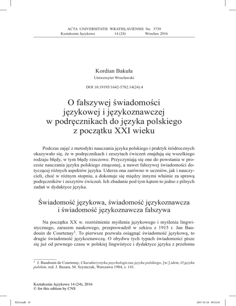 ACTA UNIVERSITATIS WRATISLAVIENSIS No 3739 Kształcenie Językowe 14 (24) Wrocław 2016 Kordian Bakuła Uniwersytet Wrocławski DOI 10.19195/1642-5782.14(24).4 O fałszywej świadomości językowej i językoznawczej w podręcznikach do języka polskiego z początku XXI wieku Podczas zajęć z metodyki nauczania języka polskiego i praktyk śródrocznych okazywało się, że w podręcznikach i zeszytach ćwiczeń znajdują się wszelkiego rodzaju błędy, w tym błędy rzeczowe. Przyczyniają się one do powstania w procesie nauczania języka polskiego zmąconej, a nawet fałszywej świadomości dotyczącej różnych aspektów języka. Uderza ona zarówno w uczniów, jak i nauczycieli, choć w różnym stopniu, a dokonuje się między innymi właśnie za sprawą podręczników i zeszytów ćwiczeń. Ich zbadanie pod tym kątem to jedno z pilnych zadań w dydaktyce języka. Świadomość językowa, świadomość językoznawcza i świadomość językoznawcza fałszywa Na początku XX w. rozróżnienie myślenia językowego i myślenia lingwistycznego, zarazem naukowego, przeprowadził w szkicu z 1915 r. Jan Baudouin de Courtenay1. To pierwsze pozwala osiągnąć świadomość językową, to drugie świadomość językoznawczą. O obydwu tych typach świadomości pisze się już od pewnego czasu w polskiej lingwistyce i dydaktyce języka z przełomu 1 J. Baudouin de Courtenay, Charakterystyka psychologiczna języka polskiego, [w:] idem, O języku polskim, red. J. Basara, M. Szymczak, Warszawa 1984, s. 141. Kształcenie Językowe 14 (24), 2016 © for this edition by CNS KJ14.indb 35 2017-01-24 09:52:43 36 Kordian Bakuła XX i XXI w., na przykład Tadeusz Zgółka2, Marian Bugajski3, Kordian Bakuła4 oraz prace w zbiorze Świadomość językowa5. Nie wprowadzono jednak jeszcze pojęcia fałszywej świadomości językowej i fałszywej świadomości językoznawczej, co właśnie czynię. O samej świadomości językowej wystarczy tutaj przypomnieć za Kazimierzem Polańskim6, Andrzejem Markowskim7, Marianem Bugajskim8, że polega ona na znajomości języka rodzimych jego użytkowników, że realizuje się w wypowiadaniu sądów o języku, o jego cechach, składnikach, celach, normach, a przede wszystkim o sensowności wypowiedzi. Jeśli wypowiedź zostanie uznana za niesensowną, bezsensowną, to spotka się z odrzuceniem, podobnie jak wady innego rodzaju, na przykład w doborze wyrazów czy ich szyku. Tego rodzaju świadomość bywa zwykle intuicyjna, jeśli dojdzie do niej szczególne zaciekawienie językiem, prowadzące do zdobycia wiedzy o języku, jego budowie, historii, zróżnicowaniu, to wtedy mamy do czynienia ze świadomością językoznawczą. W szkole tego rodzaju świadomość sprowadza się w zasadzie do wiedzy o języku, zwłaszcza jego gramatyce. W ostatnich kilkunastu latach nastąpiło w dydaktyce przesunięcie i zamiana: to, co od dziesięcioleci nazywało się wiedzą o języku, nazwano świadomością językową w Podstawie programowej z 2009 r. Ta zmiana wymaga komentarza. Nie wiemy, dlaczego ona nastąpiła, gdyż autorzy podstawy nie podali nigdzie uzasadnienia. Wobec tego braku nasuwa się spostrzeżenie, że chodzi tu jedynie o „dorównanie” tendencjom z zachodu Europy, na przykład Wielkiej Brytanii, gdzie tamtejszy Narodowy Program Nauczania (National Curriculum) od 1990 roku wymaga nauczania świadomości językowej (language awareness)9. Trzeba jednak dodać, że w najnowszym wydaniu National curriculum10 z 2013 r. ani razu nie posłużono się terminem language awareness przez cały czas obowiązkowej nauki od 5 do 16 roku życia, odpowiadający naszej szkole podstawowej i gimnazjum. 2 T. Zgółka, Kształtowanie świadomości językowej i językoznawczej w nauczaniu języka polskiego, [w:] Wiedza o literaturze i edukacja. Księga referatów Zjazdu Polonistów Warszawa 1995, red. T. Michałowska, Z. Goliński, Z. Jarosiński, Warszawa 1996. 3 M. Bugajski, Świadomość językowa a świadomość lingwistyczna. Społeczne i naukowe potrzeby kultury języka, [w:] Mowa rozświetlona myślą, red. J. Miodek, Wrocław 1999; idem, Język w komunikowaniu, Warszawa 2006. 4 K. Bakuła, Świadomość językowa — świadomość dydaktyczna, [w:] Świadomość językowa, red. J. Nocoń, A. Tabisz, „Języka a Edukacja” 3, 2014, s. 53–62. 5 Ibidem. 6 Świadomość językowa, [hasło w:] Encyklopedia językoznawstwa ogólnego, red. K. Polański, Wrocław 2003. 7 A. Markowski, Kultura języka. Teoria. Zagadnienia leksykalne, Warszawa 2005. 8 M. Bugajski, Język w komunikowaniu… 9 B. Mittins, Language Awareness for Teachers, Philadelphia 1991. 10 https://www.gov.uk/government/publications/national-curriculum-in-england-english-programmes-of-study/. Kształcenie Językowe 14 (24), 2016 © for this edition by CNS KJ14.indb 36 2017-01-24 09:52:43 O fałszywej świadomości językowej i językoznawczej 37 Wydaje mi się, że wprowadzenie świadomości językowej zamiast wiedzy o języku nie jest dobrą zmianą. Po pierwsze, dlatego że pod świadomością językową w podstawie kryją się treści, które od dziesięcioleci składały się właśnie na wiedzę o języku / naukę o języku. Po drugie, świadomość językowa jest nazbyt metafizyczna i niezbyt wyraźna, podczas gdy wiedza o języku przez długie lata używania w dydaktyce została już dobrze określona i jest empiryczna. Fałszywej świadomości językoznawczej nie utożsamiam po prostu z niewiedzą. Przeciwnie, ci, którzy mają fałszywą świadomość językoznawczą co do pewnych zjawisk, mają o nich wiedzę, tyle że nieprawdziwą. Jak widać, wiedza jest terminem, który lepiej nazywa zjawisko (można też rozważać stosowanie innego jeszcze terminu — znajomość języka). Wprowadzam pojęcie fałszywej świadomości językoznawczej analogicznie do pojęcia fałszywa świadomość językowa, którym posługuje się Agneta M.L. Svalberg11 w odniesieniu do nauki języka angielskiego jako obcego (Engl