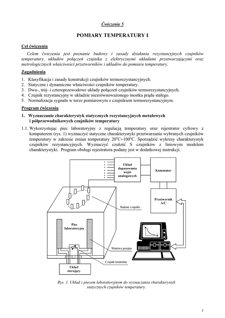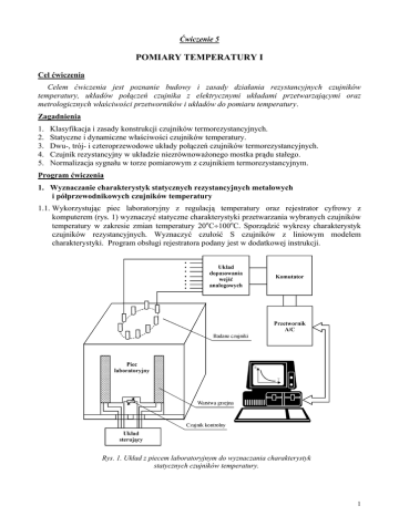 Ćwiczenie 5 POMIARY TEMPERATURY I Cel ćwiczenia Celem ćwiczenia jest poznanie budowy i zasady działania rezystancyjnych czujników temperatury, układów połączeń czujnika z elektrycznymi układami przetwarzającymi oraz metrologicznych właściwości przetworników i układów do pomiaru temperatury. Zagadnienia 1. 2. 3. 4. 5. Klasyfikacja i zasady konstrukcji czujników termorezystancyjnych. Statyczne i dynamiczne właściwości czujników temperatury. Dwu-, trój- i czteroprzewodowe układy połączeń czujników termorezystancyjnych. Czujnik rezystancyjny w układzie niezrównoważonego mostka prądu stałego. Normalizacja sygnału w torze pomiarowym z czujnikiem termorezystancyjnym. Program ćwiczenia 1. Wyznaczanie charakterystyk statycznych rezystancyjnych metalowych i półprzewodnikowych czujników temperatury 1.1. Wykorzystując piec laboratoryjny z regulacją temperatury oraz rejestrator cyfrowy z komputerem (rys. 1) wyznaczyć statyczne charakterystyki przetwarzania wybranych czujników temperatury w zakresie zmian temperatury 20oC÷100oC. Sporządzić wykresy charakterystyk czujników rezystancyjnych. Wyznaczyć czułość S czujników z liniowym modelem charakterystyki. Program obsługi rejestratora podany jest w dodatkowej instrukcji. Rys. 1. Układ z piecem laboratoryjnym do wyznaczania charakterystyk statycznych czujników temperatury. 1 1.2. Na podstawie wyznaczonej charakterystyki termistora RT = Aexp(B/T) sporządzić wykres zależności ln(RT) = f(1/T) i określić stałe materiałowe termistora A, B. Podać równanie charakterystyki przetwarzania termistora RT = f(T). Obliczyć TWR termistora w temperaturze ϑ = 25°C. 2. Linearyzacja charakterystyki statycznej termistora NTC 2.1. Dla termistora o stałych materiałowych A=1,8⋅10-2 Ω, B=3900 K, oraz charakterystyce statycznej podanej punktowo w tablicy ϑ [oC] RT [kΩ] 30 32 34 36 38 40 42 44 46 48 50 6,89 6,33 5,83 5,37 4,95 4,57 4,22 3,90 3,61 3,35 3,11 w celu linearyzacji charakterystyki dobrać wartości rezystora R1 (na podstawie wzoru 1) dołączonego równolegle z termistorem RT (rys. 2). Założyć linearyzację w przedziale 30 ÷ 50°C (Ta = 303 K, Tb=313 K, Tc = 323 K). Wyznaczyć doświadczalnie (zadając wartości RT=f(ϑ) za pomocą rezystora dekadowego) oraz narysować charakterystyki Uwy= f(T) (dla termistora RT oraz równoległego połączenia RT i R1) w przedziale 303 ÷ 323 K. Tc − Tb = Tb − Ta z warunku stałości przyrostów Wartość rezystancji R1 obliczona dla rezystancji układu zastępczego wynosi: R1 = Rb (Ra + Rc ) − 2 Ra Rc Ra + Rc − 2 Rb (1) 2.2. Wyznaczyć i porównać błędy liniowości dla obydwu badanych układów w zakresie 303÷323K. 2 Rys. 2. Zasada linearyzacji charakterystyki statycznej termistora: a) schemat linearyzacji w układzie równoległym; b) charakterystyki ilustrujące zasadę linearyzacji. 3. Sprawdzanie właściwości dwu- i trójprzewodowych układów połączeń czujnika z przetwornikiem temperatury APTR2 3.1. Sprawdzić wpływ zmian rezystancji linii na prądowy sygnał wyjściowy przetwornika w dwui trójprzewodowym układzie połączeń czujnika Pt100 z przetwornikiem temperatury (rys. 3). Przygotować przetwornik do pracy w układzie dwuprzewodowym. Wyznaczyć bezwzględne błędy wskazań ∆ϑ dla trzech temperatur czujnika ϑx (0oC, 100oC, 200oC) dla rezystancji linii RL=2Ω. Do symulacji rezystancji linii RL zastosować podwójne rezystory dekadowe. Do symulacji charakterystyki Rϑ(ϑ) czujnika Pt100 zastosować rezystor wielodekadowy. Wartość rezystancji dodatkowego obciążenia Ro ustawić równą zero. 3 Powtórzyć czynności dla układu trójprzewodowego. Ocenić właściwości obydwu układów. Rys.3. Schemat układu do badania przetwornika APTR2: a) połączenie czujnika linią dwuprzewodową; b) połączenie czujnika linią trójprzewodową 4. Badanie toru pomiarowego z transmisją prądową 4.1. Sprawdzić wpływ zmian rezystancji dwuprzewodowej linii transmisyjnej na błąd przetwarzania temperatury w sygnał prądowy z przedziału 4÷20 mA. W tym celu w układzie z rys. 3 dla linii trójprzewodowej łączącej czujnik z przetwornikiem temperatury (RL=2Ω) ustawić Rϑ=138,5 Ω (ϑ=100oC) a następnie zmieniając rezystancję dodatkowego obciążenia Ro od 0 do Rogr wyznaczyć Rogr odpowiadającą 1% wartości błędu wskazania miliamperomierza cyfrowego odniesionej do zakresu zmian prądu wyjściowego. 5. Pomiary właściwości metrologicznych przetwornika temperatura/napięcie 5.1. Dla mostkowego przetwornika ϑ/U z czujnikiem Pt100 i czteroprzewodowym układem połączeń (rys. 4) wyznaczyć charakterystykę Uwy=f(ϑ) w zakresie zmian temperatury 0÷100°C. Do symulacji zmian rezystancji czujnika Pt100 zastosować wzorcowy rezystor dekadowy. Sprawdzić wpływ zmian rezystancji przewodów łączeniowych na wartość wskazywanego napięcia. Ocenić błąd liniowości charakterystyki względem charakterystyki nominalnej Uwy [mV] = 1 [mV/°C] •ϑ [°C]. Scharakteryzować mostek użyty do budowy przetwornika. RL Uz = 15 V RL R2 U wy R 2 = 100 Ω R4 R 3 = 5.54 k Ω R 4 = 5.54 k Ω RL Rϑ R3 Uz Pt100 RL 4 Rys.4. Mostkowy przetwornik ϑ/U czujnikiem Pt100. 6. Ocena dokładności toru do pomiaru temperatury 6.1. Zapoznać się z elementami toru pomiarowego (rys. 5) składającego się z rezystora termometrycznego Pt100, przewodów łączeniowych (RL≈0), przetwornika Rϑ/U (APR 135),woltomierza cyfrowego. Zanotować dane znamionowe przetworników i woltomierza. Dokonać pomiaru temperatury ϑx w piecu laboratoryjnym. Zaobserwować zmiany mierzonej temperatury. Dla wykorzystywanego toru pomiarowego obliczyć graniczny błąd pomiaru temperatury ϑx. piec laboratoryjny 0 ÷200 °C 0 ÷ 10 V RL 2 ϑx 1 RL przetwornik Rϑ /U APR135 VC Un=10V Pt100 Rys. 5. Schemat blokowy toru pomiarowego z czujnikiem Pt100. 7. Badanie cyfrowego miernika temperatury 7.1. Objaśnić działanie cyfrowego miernika temperatury przedstawionego na rysunku 
