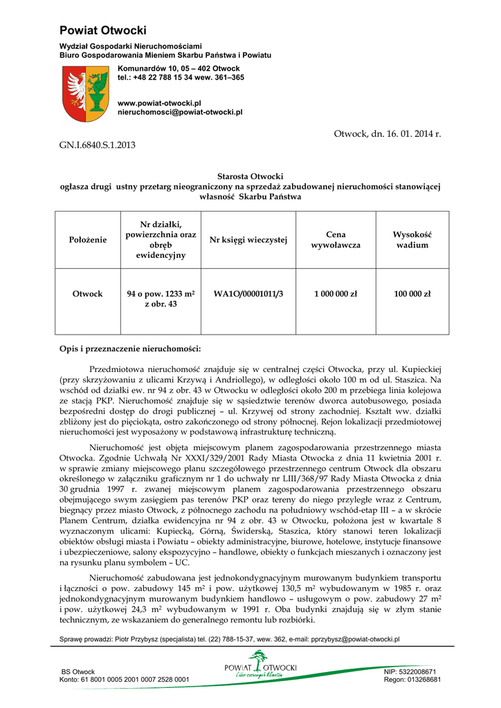 Powiat Otwocki Wydział Gospodarki Nieruchomościami Biuro Gospodarowania Mieniem Skarbu Państwa i Powiatu Komunardów 10, 05 – 402 Otwock tel.: +48 22 788 15 34 wew. 361–365 www.powiat-otwocki.pl [email protected] Otwock, dn. 16. 01. 2014 r. GN.I.6840.S.1.2013 Starosta Otwocki ogłasza drugi ustny przetarg nieograniczony na sprzedaż zabudowanej nieruchomości stanowiącej własność Skarbu Państwa Położenie Otwock Nr działki, powierzchnia oraz obręb ewidencyjny 94 o pow. 1233 m2 z obr. 43 Nr księgi wieczystej Cena wywoławcza Wysokość wadium WA1O/00001011/3 1 000 000 zł 100 000 zł Opis i przeznaczenie nieruchomości: Przedmiotowa nieruchomość znajduje się w centralnej części Otwocka, przy ul. Kupieckiej (przy skrzyżowaniu z ulicami Krzywą i Andriollego), w odległości około 100 m od ul. Staszica. Na wschód od działki ew. nr 94 z obr. 43 w Otwocku w odległości około 200 m przebiega linia kolejowa ze stacją PKP. Nieruchomość znajduje się w sąsiedztwie terenów dworca autobusowego, posiada bezpośredni dostęp do drogi publicznej – ul. Krzywej od strony zachodniej. Kształt ww. działki zbliżony jest do pięciokąta, ostro zakończonego od strony północnej. Rejon lokalizacji przedmiotowej nieruchomości jest wyposażony w podstawową infrastrukturę techniczną. Nieruchomość jest objęta miejscowym planem zagospodarowania przestrzennego miasta Otwocka. Zgodnie Uchwałą Nr XXXI/329/2001 Rady Miasta Otwocka z dnia 11 kwietnia 2001 r. w sprawie zmiany miejscowego planu szczegółowego przestrzennego centrum Otwock dla obszaru określonego w załączniku graficznym nr 1 do uchwały nr LIII/368/97 Rady Miasta Otwocka z dnia 30 grudnia 1997 r. zwanej miejscowym planem zagospodarowania przestrzennego obszaru obejmującego swym zasięgiem pas terenów PKP oraz tereny do niego przyległe wraz z Centrum, biegnący przez miasto Otwock, z północnego zachodu na południowy wschód-etap III – a w skrócie Planem Centrum, działka ewidencyjna nr 94 z obr. 43 w Otwocku, położona jest w kwartale 8 wyznaczonym ulicami: Kupiecką, Górną, Świderską, Staszica, który stanowi teren lokalizacji obiektów obsługi miasta i Powiatu – obiekty administracyjne, biurowe, hotelowe, instytucje finansowe i ubezpieczeniowe, salony ekspozycyjno – handlowe, obiekty o funkcjach mieszanych i oznaczony jest na rysunku planu symbolem – UC. Nieruchomość zabudowana jest jednokondygnacyjnym murowanym budynkiem transportu i łączności o pow. zabudowy 145 m2 i pow. użytkowej 130,5 m2 wybudowanym w 1985 r. oraz jednokondygnacyjnym murowanym budynkiem handlowo – usługowym o pow. zabudowy 27 m2 i pow. użytkowej 24,3 m2 wybudowanym w 1991 r. Oba budynki znajdują się w złym stanie technicznym, ze wskazaniem do generalnego remontu lub rozbiórki. Sprawę prowadzi: Piotr Przybysz (specjalista) tel. (22) 788-15-37, wew. 362, e-mail: [email protected] BS Otwock Konto: 61 8001 0005 2001 0007 2528 0001 NIP: 5322008671 Regon: 013268681 W stosunku do poczynionych nakładów w ww. budynkach prawa do ich zwrotu rości sobie Prezydent Miasta Otwocka. Zgodnie z umową sprzedaży z dnia 18 czerwca 2008 r. zawartą pomiędzy Przedsiębiorstwem Państwowej Komunikacji Samochodowej z siedzibą w Piasecznie a Gminą Otwock, Gmina Otwock nabyła od PPKS za kwotę 500 zł brutto tymczasowy pawilon pełniący funkcję dworca autobusowego, wolnostojący szalet, infrastrukturę związaną z funkcjonowaniem dworca usytuowane na działce ew. nr 94 z obr. 43 stanowiącej własność Skarbu Państwa oraz działkach ew. nr 89/2, 89/3, 100/9, 101/1, 101/2, 103/1, 103/2, 194/3 z obr. 43 stanowiących własność Gminy Otwock. Pierwszy ustny przetarg nieograniczony na sprzedaż ww. zabudowanej nieruchomości stanowiącej własność Skarbu Państwa, położonej w Otwocku przy ul. Kupieckiej, oznaczonej w ewidencji gruntów jako działka ew. nr 94 z obr. 43 odbył się w dniu 11 grudnia 2013 r. i zakończył się wynikiem negatywnym. Drugi ustny przetarg nieograniczony na sprzedaż nieruchomości odbędzie się w dniu 19 marca 2014 r. o godz. 12 00 w siedzibie Starostwa Powiatowego w Otwocku przy ul. Górnej 13 – pokój nr 121 (sala konferencyjna). Wadium należy wpłacić w pieniądzu w wysokości podanej w tabeli najpóźniej do dnia 13 marca 2014 r. na konto depozytowe Starostwa Powiatowego w Otwocku ul. Górna 13, nr 07 8001 0005 2001 0007 2528 0003. Wadium wpłacone przez osobę, która wygra przetarg zostaje zaliczone na poczet ceny nabycia. Wadium przepada na rzecz sprzedającego w przypadku uchylenia się przez tę osobę od zawarcia umowy lub nie stawienia się bez usprawiedliwienia w terminie i miejscu zawarcia umowy, o którym wcześniej zostanie powiadomiona przez organizatora przetargu. Zwrot wadium uczestnikowi, który przetargu nie wygrał, następuje niezwłocznie nie później niż w ciągu trzech dni od dnia rozstrzygnięcia przetargu. Przetarg będzie ważny bez względu na liczbę uczestników, jeżeli chociaż jeden uczestnik zaoferuje jedno postąpienie powyżej ceny wywoławczej. Zastrzega się prawo odwołania przetargu z uzasadnionej przyczyny. Informacja o odwołaniu przetargu zostanie ogłoszona w formie właściwej dla ogłoszenia o przetargu. Ogłoszenie o przetargu podano na stronie internetowej serwisu iMonitorUrzędowy.pl www.monitorurzedowy.pl oraz w Biuletynie Informacji Publicznej Powiatu Otwockiego www.bip.powiat-otwocki.pl, w zakładce Nieruchomości, jak również wywieszono na tablicy ogłoszeń tut. Starostwa przy ul. Górnej 13 oraz przy ul. Komunardów 10 oraz na stronie głównej Powiatu Otwockiego www.powiat-otwocki.pl. Dodatkowych informacji na temat przedstawionej nieruchomości oraz warunków przetargu uzyskać można w Wydziale Gospodarki Nieruchomościami z siedzibą w Otwocku – Świdrze, ul. Komunardów 10, wejście D, pok. 27 tel.: 22 788-15-37 lub 22 788-14-65 wew. 361, 362. Sprawę prowadzi: Piotr Przybysz (specjalista) tel. (22) 788-15-37, 