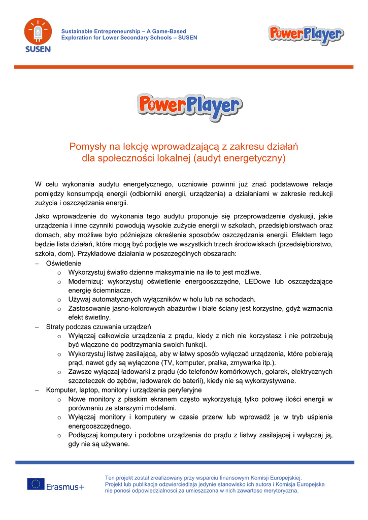 Sustainable Entrepreneurship – A Game-Based Exploration for Lower Secondary Schools – SUSEN Pomysły na lekcję wprowadzającą z zakresu działań dla społeczności lokalnej (audyt energetyczny) W celu wykonania audytu energetycznego, uczniowie powinni już znać podstawowe relacje pomiędzy konsumpcją energii (odbiorniki energii, urządzenia) a działaniami w zakresie redukcji zużycia i oszczędzania energii. Jako wprowadzenie do wykonania tego audytu proponuje się przeprowadzenie dyskusji, jakie urządzenia i inne czynniki powodują wysokie zużycie energii w szkołach, przedsiębiorstwach oraz domach, aby możliwe było późniejsze określenie sposobów oszczędzania energii. Efektem tego będzie lista działań, które mogą być podjęte we wszystkich trzech środowiskach (przedsiębiorstwo, szkoła, dom). Przykładowe działania w poszczególnych obszarach: Oświetlenie o Wykorzystuj światło dzienne maksymalnie na ile to jest możliwe. o Modernizuj: wykorzystuj oświetlenie energooszczędne, LEDowe lub oszczędzające energię ściemniacze. o Używaj automatycznych wyłączników w holu lub na schodach. o Zastosowanie jasno-kolorowych abażurów i białe ściany jest korzystne, gdyż wzmacnia efekt świetlny. Straty podczas czuwania urządzeń o Wyłączaj całkowicie urządzenia z prądu, kiedy z nich nie korzystasz i nie potrzebują być włączone do podtrzymania swoich funkcji. o Wykorzystuj listwę zasilającą, aby w łatwy sposób wyłączać urządzenia, które pobierają prąd, nawet gdy są wyłączone (TV, komputer, pralka, zmywarka itp.). o Zawsze wyłączaj ładowarki z prądu (do telefonów komórkowych, golarek, elektrycznych szczoteczek do zębów, ładowarek do baterii), kiedy nie są wykorzystywane. Komputer, laptop, monitory i urządzenia peryferyjne o Nowe monitory z płaskim ekranem często wykorzystują tylko połowę ilości energii w porównaniu ze starszymi modelami. o Wyłączaj monitory i komputery w czasie przerw lub wprowadź je w tryb uśpienia energooszczędnego. o Podłączaj komputery i podobne urządzenia do prądu z listwy zasilającej i wyłączaj ją, gdy nie są używane. Ten projekt został zrealizowany przy wsparciu finansowym Komisji Europejskiej. Projekt lub publikacja odzwierciedlaja jedynie stanowisko ich autora i Komisja Europejska nie ponosi odpowiedzialnosci za umieszczona w nich zawartosc merytoryczna. Sustainable Entrepreneurship – A Game-Based Exploration for Lower Secondary Schools – SUSEN Wyłącz monitory całkowicie (nadal zużywają one energię elektryczną w trybie standby). o Notebooki i tablety zużywają mniej energii niż komputery stacjonarne. o Wyłącz router WLAN, gdy nie jest w użyciu. Urządzenia kuchenne o Kupuj urządzenia z klasą energooszczędną A+++. o Zapewnij odpowiednią wentylację tylnych części urządzeń. o Używaj rozmiaru płyty grzewczej adekwatnej do rozmiaru naczynia podczas podgrzewania. o Gotuj z pokrywką – gotowanie bez przykrycia zużywa więcej energii. o Używaj szybkowara. o Używaj płyty indukcyjnej. o Nie umieszczaj lodówki w pobliżu źródeł ciepła, takich jak kaloryfer, kuchenka, zmywarka lub pralka. o Rozmrażaj regularnie lodówkę. o Małe chłodziarki są bardziej wydajne energetycznie niż większe. Pralki o Kupuj pralki wyłącznie z klasą energetyczną A+++ o Korzystaj tylko z pełnego załadunku pralki, przycisk “załadowane w połowie” nie daje znaczących oszczędności. o Podłączaj pralkę do głównego źródła wody. o Funkcja prania w zimnej wodzie jest z reguły nieefektywna. Ogrzewanie o Pompy w systemie ogrzewania zwiększają wykorzystanie energii elektrycznej – stara pompa grzewcza powoduje wzrost kosztów energii o co najmniej 400 zł rocznie. Nowoczesne pompy zwiększają koszt energii tylko o około 100 zł rocznie. o Modernizuj: wymień ogrzewanie na bardziej przyjazne środowisku i bardziej wydajne energetycznie. o Krótkie wietrzenie jest lepsze niż uchylanie okna na długo. o Odnawiaj stare budynki: wstawiaj podwójne szyby, ocieplaj zewnętrzne ściany i dachy. o Uczniowie otrzymują odpowiednie materiały do każdego z powyższych obszarów, a następnie pracują w grupach, aby zdobyć dodatkową wiedzę i opracować sposoby oszczędzania energii do swoich tematów. Ta "wiedza ekspercka" generowana przez każdą z grup później zostanie przedstawiona na forum klasy, tak aby wszyscy uczniowie ostatecznie dowiedzieli się o wszystkich możliwych działaniach dla każdego z obszarów. Efekt pracy grupy może mieć postać plakatu lub prezentacji. Będzie ona również tworzyć element koncepcji oszczędzania energii. Po przeprowadzeniu audytu energetycznego, zgodnie z instrukcją zadania i kwestionariuszami dostępnymi w osobnym dokumentach, uczniowie mogą następnie wybierać między różnymi elementami tej koncepcji i sposobami zwiększającymi oszczędność energii, aby następnie udzielać wskazówek i wytycznych dla adresatów badania (np. szkoły). Ten projekt został zrealizowany przy wsparciu finansowym Komisji Europejskiej. Projekt lub publikacja odzwierciedlaja jedynie stanowisko ich autora i Komisja Europejska nie ponosi odpowiedzialnosci za umieszczona w nich zawartosc merytoryczna.