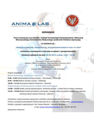 ZAPROSZENIE Firma AnimaLab oraz Katedra i Zakład Farmakologii Doświadczalnej i Klinicznej Warszawskiego Uniwersytetu Medycznego serdecznie Państwa zapraszają na szkolenie pt.: „Większa wydajność, standaryzacja, przyspieszenie badań in vivo i in vitro” modularne rozwiązania w zakresie urządzeń i oprogramowania. Szkolenie odbędzie się dnia 26.09.2013 w godz. 9:00 – 13:30 Adres: Warszawski Uniwersytet Medyczny Katedra i Zakład Farmakologii Doświadczalnej i Klinicznej, Aula C ul. Krakowskie Przedmieście 26/28 00-927 Warszawa (Kampus Główny Uniwersytetu Warszawskiego) Program prezentacji: Badania behawioralne, metaboliczne i motoryczne 9:00 – 9:45 Wysokowydajny skrining zwierząt – PhenoMaster i PhenoCage 9:45 – 10:30 Badania zwierząt w grupie – IntelliCage 10:30 – 11:15 Nowoczesne badania motoryczne – Motorater Modele zwierzęce, monitoring zdrowia, miografy, łaźnie oraz PowerLab 12:00 – 12:45 Modele zwierząt laboratoryjnych, monitoring zdrowia – Charles River & Jackson Laboratory 12:45 – 13:30 Badania tkanek pochodzenia zwierzęcego: miografy i łaźnie do badania organów oraz zbieranie i akwizycja danych poprzez PowerLab - LabChart Uczestnikom naszej prezentacji zapewniamy certyfikaty potwierdzające odbycie szkolenia. Prosimy o przesłanie potwierdzenie Państwa obecności do dn. 24.09.2013 na adres email: [email protected] Kontakt w sprawach organizacyjnych: Pan Tomasz Zahorski – Kierownik Sprzedaży e-mail: [email protected], tel. +48 698 903 997 Zapraszamy serdecznie!