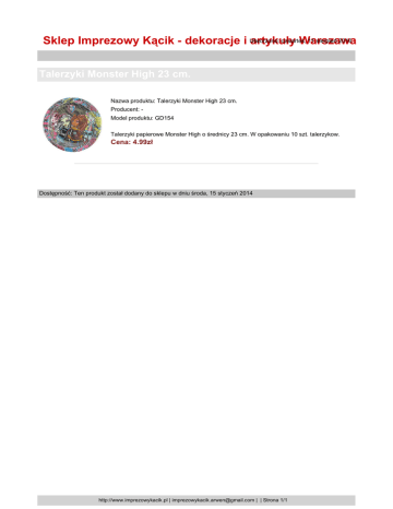 czwartek, 11 sierpień 2016 Sklep Imprezowy Kącik - dekoracje i Utworzono: artykuły Warszawa Talerzyki Monster High 23 cm. Nazwa produktu: Talerzyki Monster High 23 cm. Producent: Model produktu: GD154 Talerzyki papierowe Monster High o średnicy 23 cm. W opakowaniu 10 szt. talerzykow. Cena: 4.99zł Dostępność: Ten produkt został dodany do sklepu w dniu środa, 15 styczeń 2014 http://www.imprezowykacik.pl | [email protected] | | Strona 1/1
