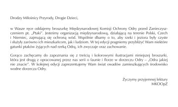 Drodzy Miłośnicy Przyrody, Drogie Dzieci, w Wasze ręce oddajemy broszurkę Międzynarodowej Komisji Ochrony Odry przed Zanieczyszczeniem pt. „Ptaki”. Jesteśmy organizacją międzynarodową, działającą na terenie Polski, Czech i Niemiec, zajmującą się ochroną wód. Wspólnie dbamy o to, aby rzeki i jeziora były czyste i służyły zarówno ich mieszkańcom, jak i ludziom. W tej edycji pragniemy przybliżyć Wam niektóre gatunki ptaków żyjących nad rzeką Odrą, ich zwyczaje oraz zachowanie. Gorąco zachęcamy do zapoznania się z treścią i kolorowymi ilustracjami niniejszej broszurki, która jest drugą z opracowanej przez nas serii o faunie i florze w dorzeczu Odry – „Odra jakiej nie znacie”. W kolejnej edycji zaprezentujemy Wam świat owadów zamieszkujących środowisko wodne dorzecza Odry. Życzymy przyjemnej lektury MKOOpZ Zimorodek Alcedo atthis* Długość ciała: 16–18 cm Masa ciała: 34–46 g Jeden z najbarwniejszych europejskich ptaków, o zielonkawo-niebieskim ubarwieniu wierzchu ciała i biało-rdzawym spodzie. Mimo jaskrawego upierzenia niełatwo go jednak zauważyć gdy siedzi nieruchomo na gałęzi czatując na swą zdobycz. Podstawą diety zimorodka są drobne ryby, na które poluje wbijając się z dużą prędkością z powietrza w lustro wody. Zimorodek gnieździ się w urwistych skarpach nad brzegami czystych rzek, w których wykopuje poziome nory o długości do 1 m, zakończone komorą gniazdową. Nora położona jest około pół metra nad lustrem wody, tak aby nie została zalana wodą i aby drapieżniki nie miały do niej łatwego dostępu. Jest to gatunek monogamiczny. Poza sezonem rozrodczym żyje samotnie przemieszczając się zimą z terenów lęgowych w miejsca z niezamarzniętą wodą. Część osobników wędruje na zachód lub południe. Właśnie takie niespodziewane pojawienie się tego ptaka w okresie zimowym w miejscach gdzie go wcześniej nie widywano (sugerujące, że ptak lęgnie się zimą) mogło być przyczyną nadania mu nazwy „zimorodek”. * nazwa łacińska w świecie nauki stosuje się ją dla zwierząt i roślin w celu ułatwienia identyfikacji monogamia łączenie się w parę jednego samca i jednej samicy w celu posiadania potomstwa, przy czym taki „związek” może trwać przez całe życie ptaka bądź tylko przez jeden okres lęgowy Rybitwa rzeczna Sterna hirundo Długość ciała: 30–39 cm Masa ciała: 100–175 g Wędrowny ptak z rodziny rybitw, o smukłej sylwetce, z wąskimi skrzydłami i dość długim, głęboko rozwidlonym ogonem. Ubarwienie obu płci jest biało-szare z czarnym wierzchem głowy. Jest gatunkiem towarzyskim, który zwykle gniazduje kolonijnie w dolinach rzek, a zwłaszcza tam gdzie dostępne są piaszczyste lub żwirowe wyspy oraz brzegi. Żywi się przeważnie drobnymi rybami, a także owadami, skorupiakami i mięczakami związanymi z środowiskiem wodnym. Ryby chwyta nurkując z powietrza do wody nawet na głębokość kilku metrów. Jaja składa w zagłębieniu w piasku, wysłanym kilkoma kamyczkami lub muszelkami. Istotnym zagrożeniem dla tych ptaków w okresie lęgowym może być niepokojenie przez ludzi i drapieżniki, bowiem jaja rybitw pozostają wówczas zbyt długo bez opieki, co naraża je na przegrzanie w nasłonecznionym piasku. Lęgi mogą zostać również zniszczone w wyniku powodzi lub nagłych zmian poziomu wody. lęg zbiór zachowań u ptaków obejmujący: wybór partnera, budowę gniazda, składanie jaj i ich wysiadywanie, opiekę nad młodymi aż do osiągnięcia przez nie samodzielności Czapla siwa Ardea cinerea Długość ciała: 85–100 cm Masa ciała: 1000–2100 g Ptak nieco mniejszy od bociana. Jego nazwa związana jest z szarym ubarwieniem ptaka. W czasie lotu można go łatwo rozpoznać po charakterystycznym zgięciu szyi w kształcie litery „S”. Występuje na terenach, gdzie rzeki i zbiorniki wodne sąsiadują z lasami. Często widywany jest również na łąkach i pastwiskach, a szczególnie licznie na stawach rybnych, gdzie wypatruje łatwej zdobyczy. Czapla siwa poluje głównie na ryby, a także płazy, gady, małe ssaki i większe owady. Jest bardzo żarłoczna. Swoją zdobycz – sięgającą nawet 20 cm – połyka w całości. Gniazda buduje w koronach wysokich drzew, rzadziej na krzewach lub w trzcinach. Przeważnie gniazduje w koloniach lęgowych zwanych „czaplińcami”. Czaple coraz częściej nie odlatują na zimę, gdyż znajdują liczne zbiorniki wodne przy elektrowniach lub ujściach ścieków, które nie zamarzają. kolonia lęgowa miejsce gromadnego gniazdowania ptaków, ptaki mogą zakładać kolonie jednogatunkowe, a także mieszane, w których występuje więcej niż jeden gatunek (np. czaple wspólnie z kormoranami) Bocian czarny Ciconia nigra Długość ciała: 90–105 cm Masa ciała: około 3 kg Jest nieznacznie mniejszy od bociana białego, od którego jak wskazuje nazwa różni się przede wszystkim czarnym ubarwieniem. U osobników dorosłych dziób i nogi mają intensywny czerwony kolor. Zamieszkuje podmokłe lasy obfitujące w zbiorniki wodne, moczary i łąki. Gniazda (o średnicy ponad 1 m) buduje w koronach dużych drzew. Odżywia się głównie rybami, płazami i owadami, na które poluje brodząc w płytkiej wodzie. W poszukiwaniu pokarmu może przemieszczać się nawet do 10 kilometrów od gniazda. W przeciwieństwie do bociana białego rzadko klekocze, częściej wydaje dźwięki zbliżone do pisku i syczenia. Bocian czarny prowadzi skryty tryb życia, dlatego trudniej go zaobserwować niż popularnego bociana białego. Do niedawna był to gatunek wybitnie unikający sąsiedztwa ludzi i bardzo płochliwy. W ostatnich latach obserwuje się słabnięcie strachu przed człowiekiem i przypadki gniazdowania w pobliżu osiedli ludzkich czy ruchliwych dróg. moczary obszar stale podmokły, okresowo zalewany lub zatapiany, porośnięty roślinnością przystosowaną do specyficznych warunków środowiska bagi