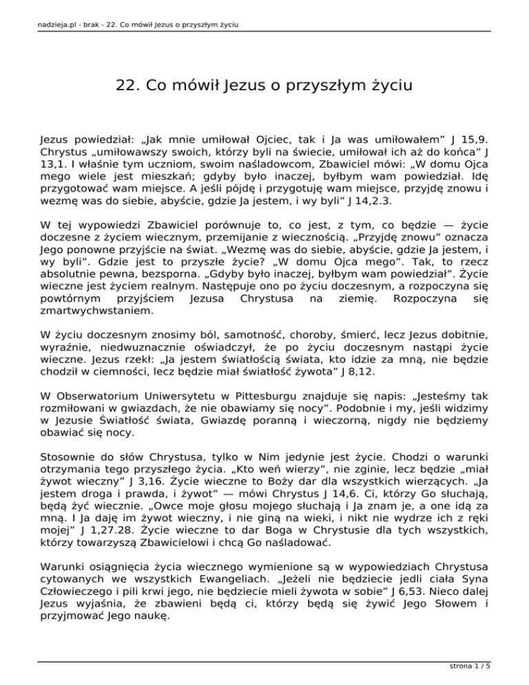 nadzieja.pl - brak - 22. Co mówił Jezus o przyszłym życiu 22. Co mówił Jezus o przyszłym życiu Jezus powiedział: „Jak mnie umiłował Ojciec, tak i Ja was umiłowałem” J 15,9. Chrystus „umiłowawszy swoich, którzy byli na świecie, umiłował ich aż do końca” J 13,1. I właśnie tym uczniom, swoim naśladowcom, Zbawiciel mówi: „W domu Ojca mego wiele jest mieszkań; gdyby było inaczej, byłbym wam powiedział. Idę przygotować wam miejsce. A jeśli pójdę i przygotuję wam miejsce, przyjdę znowu i wezmę was do siebie, abyście, gdzie Ja jestem, i wy byli” J 14,2.3. W tej wypowiedzi Zbawiciel porównuje to, co jest, z tym, co będzie — życie doczesne z życiem wiecznym, przemijanie z wiecznością. „Przyjdę znowu” oznacza Jego ponowne przyjście na świat. „Wezmę was do siebie, abyście, gdzie Ja jestem, i wy byli”. Gdzie jest to przyszłe życie? „W domu Ojca mego”. Tak, to rzecz absolutnie pewna, bezsporna. „Gdyby było inaczej, byłbym wam powiedział”. Życie wieczne jest życiem realnym. Następuje ono po życiu doczesnym, a rozpoczyna się powtórnym przyjściem Jezusa Chrystusa na ziemię. Rozpoczyna się zmartwychwstaniem. W życiu doczesnym znosimy ból, samotność, choroby, śmierć, lecz Jezus dobitnie, wyraźnie, niedwuznacznie oświadczył, że po życiu doczesnym nastąpi życie wieczne. Jezus rzekł: „Ja jestem światłością świata, kto idzie za mną, nie będzie chodził w ciemności, lecz będzie miał światłość żywota” J 8,12. W Obserwatorium Uniwersytetu w Pittesburgu znajduje się napis: „Jesteśmy tak rozmiłowani w gwiazdach, że nie obawiamy się nocy”. Podobnie i my, jeśli widzimy w Jezusie Światłość świata, Gwiazdę poranną i wieczorną, nigdy nie będziemy obawiać się nocy. Stosownie do słów Chrystusa, tylko w Nim jedynie jest życie. Chodzi o warunki otrzymania tego przyszłego życia. „Kto weń wierzy”, nie zginie, lecz będzie „miał żywot wieczny” J 3,16. Życie wieczne to Boży dar dla wszystkich wierzących. „Ja jestem droga i prawda, i żywot” — mówi Chrystus J 14,6. Ci, którzy Go słuchają, będą żyć wiecznie. „Owce moje głosu mojego słuchają i Ja znam je, a one idą za mną. I Ja daję im żywot wieczny, i nie giną na wieki, i nikt nie wydrze ich z ręki mojej” J 1,27.28. Życie wieczne to dar Boga w Chrystusie dla tych wszystkich, którzy towarzyszą Zbawicielowi i chcą Go naśladować. Warunki osiągnięcia życia wiecznego wymienione są w wypowiedziach Chrystusa cytowanych we wszystkich Ewangeliach. „Jeżeli nie będziecie jedli ciała Syna Człowieczego i pili krwi jego, nie będziecie mieli żywota w sobie” J 6,53. Nieco dalej Jezus wyjaśnia, że zbawieni będą ci, którzy będą się żywić Jego Słowem i przyjmować Jego naukę. strona 1 / 5 nadzieja.pl - brak - 22. Co mówił Jezus o przyszłym życiu Możemy i my zapytać: W kim jest życie wieczne?, a znajdziemy taką odpowiedź: „Żywot wieczny dał nam Bóg, a żywot ten jest w Synu jego. Kto ma syna, ma żywot; kto nie ma Syna Bożego, nie ma żywota” 1J 5,11.12. Słowa te harmonizują z innymi słowami, wypowiedzianymi przez Chrystusa: „Kto słucha słowa mego i wierzy temu, który mnie posłał, ma żywot wieczny i nie stanie przed sądem, lecz przeszedł z śmierci do żywota” J 5,24. Nic więc dziwnego, że Paweł napisał: „Gdy się Chrystus, który jest życiem naszym, ukaże, wtedy się i wy ukażecie razem z nim w chwale” Kol 3,4. Nie ma życia bez Chrystusa. W Chrystusie jest nasze przyszłe, wieczne życie, które osiągamy przez wiarę. W czasie powtórnego przyjścia Chrystusa, kiedy umarli powstaną z grobów, wszyscy, którzy zasnęli w Chrystusie, staną się nieśmiertelni. Ci zaś, którzy wtedy będą żyli na ziemi i czekali na Chrystusa, doznają przemienienia. „Otóż tajemnicę wam objawiam — pisał apostoł Paweł — Nie wszyscy zaśniemy, ale wszyscy będziemy przemienieni w jednej chwili, w oka mgnieniu, na odgłos trąby ostatecznej, bo trąba zabrzmi i umarli wzbudzeni zostaną jako nie skażeni, a my zostaniemy przemienieni. Albowiem to, co skażone, musi przyoblec się w to, co nieskażone, a to, co śmiertelne musi przyoblec się w nieśmiertelność” 1Kor 15,51-53. Jezus nauczał o zmartwychwstaniu umarłych, a kiedy saduceusze, którzy nie wierzyli w zmartwychwstanie, przyszli do Niego ze swymi argumentami, Jezus powiedział: „A że umarli wzbudzeni będą, to i Mojżesz zaznaczył przy krzaku gorejącym, gdy nazywa Pana Bogiem Abrahama i Bogiem Izaaka, i Bogiem Jakuba. Nie jest On przeto Bogiem umarłych, ale żywych. Dla niego bowiem wszyscy żyją” Łk 2,37.38. Zostało to powiedziane w tym znaczeniu, że nastąpi zmartwychwstanie wszystkich ludzi. Apostoł Paweł mówi o Bogu jako o Tym, który „ożywia umarłych i który to, czego nie ma, powołuje do bytu” Rz 4,17. Zarówno dobrzy, jak i źli ludzie powstaną w odpowiednim czasie z grobów. Jezus powiedział: „Nie dziwcie się temu, gdyż nadchodzi godzina, kiedy wszyscy w grobach usłyszą głos jego: Wtedy ci, którzy dobrze czynili, wyjdą na zmartwychwstanie żywota, ci, co źle czynili, by powstać na sąd” J 5,28.29. Tutaj Zbawiciel kładzie nacisk na rozróżnienie dwóch zmartwychwstań, jednego do życia wiecznego, a drugiego na potępienie. Zmartwychwstanie do życia wiecznego nazywa „zmartwychwstaniem sprawiedliwych” Łk 14,14. Apostoł Paweł rozważa myśl Zbawiciela, mówiąc: „Albowiem jak w Adamie wszyscy umierają, tak też w Chrystusie wszyscy zostaną ożywieni, a każdy w swoim porządku: jako pierwszy Chrystus, potem ci, którzy są Chrystusowi w czasie jego przyjścia” 1Kor 15,22.23. Na początku Listu do Tesaloniczan Paweł pisze, że Pan we własnej osobie zstąpi z niebios, a ci, którzy zmarli w Chrystusie, pierwsi powstaną z grobów (por. 1Tes 4,16). Mowa tu jest o pierwszym zmartwychwstaniu. W Księdze Objawienia Zbawicie