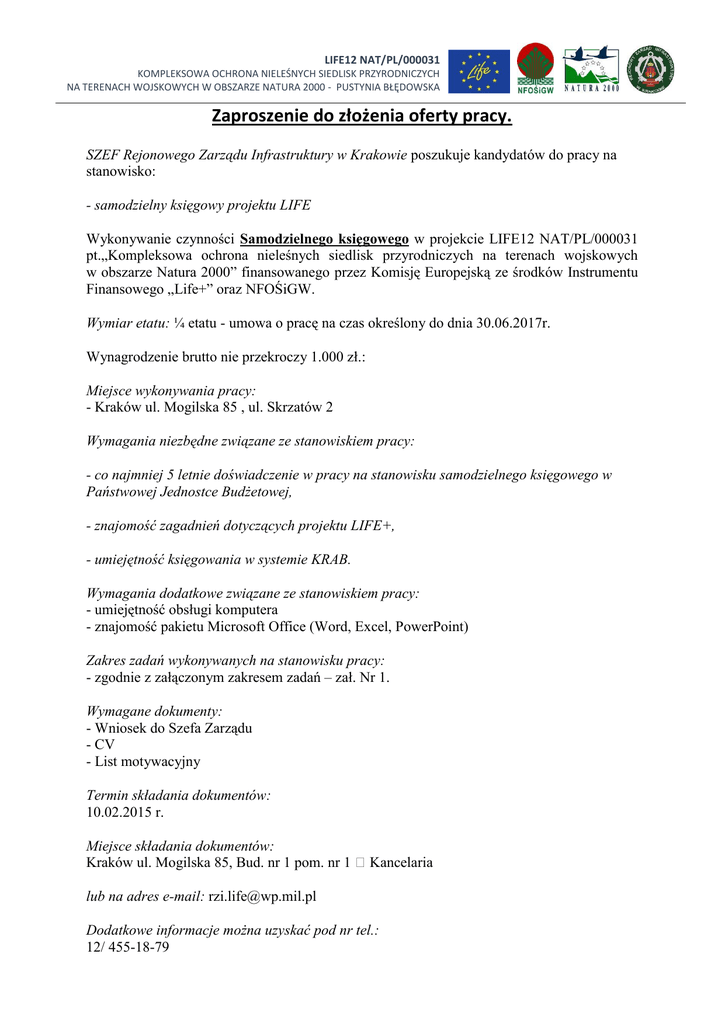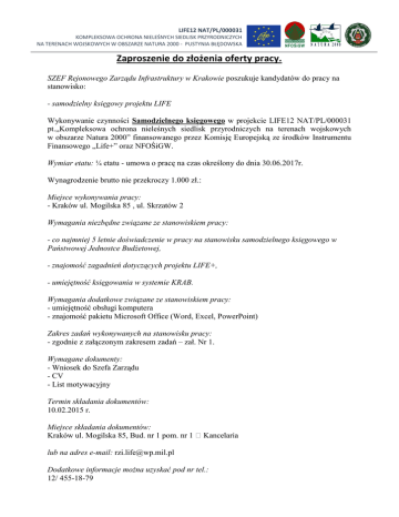 LIFE12 NAT/PL/000031 KOMPLEKSOWA OCHRONA NIELEŚNYCH SIEDLISK PRZYRODNICZYCH NA TERENACH WOJSKOWYCH W OBSZARZE NATURA 2000 - PUSTYNIA BŁĘDOWSKA Zaproszenie do złożenia oferty pracy. SZEF Rejonowego Zarządu Infrastruktury w Krakowie poszukuje kandydatów do pracy na stanowisko: - samodzielny księgowy projektu LIFE Wykonywanie czynności Samodzielnego księgowego w projekcie LIFE12 NAT/PL/000031 pt.„Kompleksowa ochrona nieleśnych siedlisk przyrodniczych na terenach wojskowych w obszarze Natura 2000” finansowanego przez Komisję Europejską ze środków Instrumentu Finansowego „Life+” oraz NFOŚiGW. Wymiar etatu: ¼ etatu - umowa o pracę na czas określony do dnia 30.06.2017r. Wynagrodzenie brutto nie przekroczy 1.000 zł.: Miejsce wykonywania pracy: - Kraków ul. Mogilska 85 , ul. Skrzatów 2 Wymagania niezbędne związane ze stanowiskiem pracy: - co najmniej 5 letnie doświadczenie w pracy na stanowisku samodzielnego księgowego w Państwowej Jednostce Budżetowej, - znajomość zagadnień dotyczących projektu LIFE+, - umiejętność księgowania w systemie KRAB. Wymagania dodatkowe związane ze stanowiskiem pracy: - umiejętność obsługi komputera - znajomość pakietu Microsoft Office (Word, Excel, PowerPoint) Zakres zadań wykonywanych na stanowisku pracy: - zgodnie z załączonym zakresem zadań – zał. Nr 1. Wymagane dokumenty: - Wniosek do Szefa Zarządu - CV - List motywacyjny Termin składania dokumentów: 10.02.2015 r. Miejsce składania dokumentów: Kraków ul. Mogilska 85, Bud. nr 1 pom. nr 1 Kancelaria lub na adres e-mail: [email protected] Dodatkowe informacje można uzyskać pod nr tel.: 12/ 455-18-79 LIFE12 NAT/PL/000031 KOMPLEKSOWA OCHRONA NIELEŚNYCH SIEDLISK PRZYRODNICZYCH NA TERENACH WOJSKOWYCH W OBSZARZE NATURA 2000 - PUSTYNIA BŁĘDOWSKA Zakres zadań: 1. Wykonywanie czynności Samodzielnego księgowego w projekcie LIFE12 NAT/PL/000031 „Kompleksowa ochrona nieleśnych siedlisk przyrodniczych na terenach wojskowych w obszarze Natura 2000” (dalej Projekt) finansowanego przez Unię Europejską ze środków Instrumentu Finansowego „Life+” oraz NFOŚiGW. Miejscem wykonywanych zadań jest biuro projektu life + przy ul. Skrzatów 2 (średnio 6 godzin tygodniowo), oraz Pion Głównego Księgowego przy ul. Mogilskiej 85 (średnio 4 godziny tygodniowo) – zależnie od potrzeb. Łącznie liczba godzin przewidzianych do pracy przy projekcie – 10 godz. Tygodniowo. a) Zakres zadań, które mogą być wykonywane w biurze projektu: 1) Opracowanie korekt planu rzeczowo-finansowego dla Projektu Life12 NAT/PL/000031 oraz korekt do planu. 2) Przygotowywanie korespondencji związanej z gospodarką finansową Projektu. 3) Pozyskiwanie opinii Głównego Księgowego w kwestiach spornych i przedstawienie rozwiązania problemu Monitor Projektu z ramienia KE. 4) Prowadzenie ewidencji księgowej operacji gospodarczych dotyczących realizacji projektu „LIFE +” w ramach odrębnej księgi pomocniczej prowadzonej w systemie informatycznym SI KRAB zgodnie z : a. „Zasadami ( polityką) rachunkowości RZI w Krakowie”, b. Ogólnymi i szczegółowymi zasadami określonymi dla ewidencji środków zagranicznych przez Komisję Europejską oraz zasadami określonymi przez NFOŚiGW dla środków pochodzących z rezerwy celowej. 5) W zakres ewidencji księgowej , o której mowa w ppkt.3 wchodzi ewidencja: a. obrotów na rachunkach bankowych środków finansowych projektu, b. rozrachunków : z dostawcami, z pracownikami, publiczno-prawnych oraz pozostałych rozrachunków, c. kosztów według rodzajów, kosztów i przychodów finansowych, pozostałych kosztów i przychodów operacyjnych, d. nakładów na środki trwałe w budowie oraz ich rozliczenie. 6) Bieżąca i zgodna z przepisami (w tym przepisami szczegółowymi dot. projektu) dekretacja źródłowych dokumentów księgowych. 7) Wstępna oraz następcza kontrola dokumentów księgowych w zakresie ich kompletności, poprawności kwalifikacji wydatków i kosztów oraz zgodności wydatków z harmonogramem rzeczowo-finansowym. 8) Sporządzanie rozliczenia środków z rezerwy celowej 9) Sporządzanie wniosków o zmianę harmonogramu rzeczowo-finansowego 10) Opracowywanie części finansowej do sprawozdań i dokumentów, o których mowa w § 8, 9 i10 umowy z NFOŚIGW oraz Przepisach wspólnych z 2012r. stanowiących załącznik do umowy z UE nr LIFE12 NAT/Pl/000031 LIFE12 NAT/PL/000031 KOMPLEKSOWA OCHRONA NIELEŚNYCH SIEDLISK PRZYRODNICZYCH NA TERENACH WOJSKOWYCH W OBSZARZE NATURA 2000 - PUSTYNIA BŁĘDOWSKA (na 10 dni przed terminem przekazania (papierowo + elektronicznie) do KE, Monitora i NFOŚiGW): a. Inception report (sprawozdanie wstępne) b. Progress report (raport postępu) c. Midterm report (sprawozdanie śródokresowe) d. Final report (sprawozdanie końcowe) e. Sprawozdanie z postępów realizacji przedsięwzięcia f. Stan zaawansowania realizacji całości projektu (sprawozdanie techniczne) + inf. o działalności promocyjnej Life KE + adres str. Internetowej (13,4PW) 11) Sporządzanie zbiorczego dowodu memoriałowego PK za dany dzień celem ujęcia danych z księgi pomocniczej Projektu w księdze głównej (za wyjątkiem wynagrodzeń i pochodnych od wynagrodzeń księgowanych uprzednio w księdze głównej). 12) Prowadzenie pozaksięgowej ewidencji (rejestr) otrzymanych faktur obcych dla Projektu. Sporządzanie (zgodnie z załącznikami do umów z UE i NFOŚiGW) oraz przedkładanie do NFOŚiGW i KE dokumentów wskazanych w warunkach Ogólnych lub Szczególnych, tj.: a. Rozliczenie wniosku - dokumenty rozliczeniowe (zestawienie faktur i innych dowodów księgowych) b. Faktur, protokołów odbioru robót lub innych dokumentów (potwierdzonych za zgodność z oryginałem w przypadku przekazywania kserokopii). 13) Udział w komisjach i kontrolach dotyczących Projektu organizowanych przez jednostki nadrzędne i RZI. 14) Prowadzenie wszelkich zestawień w Excelu lub Word niezbędnych do sporządzania finansowej cz