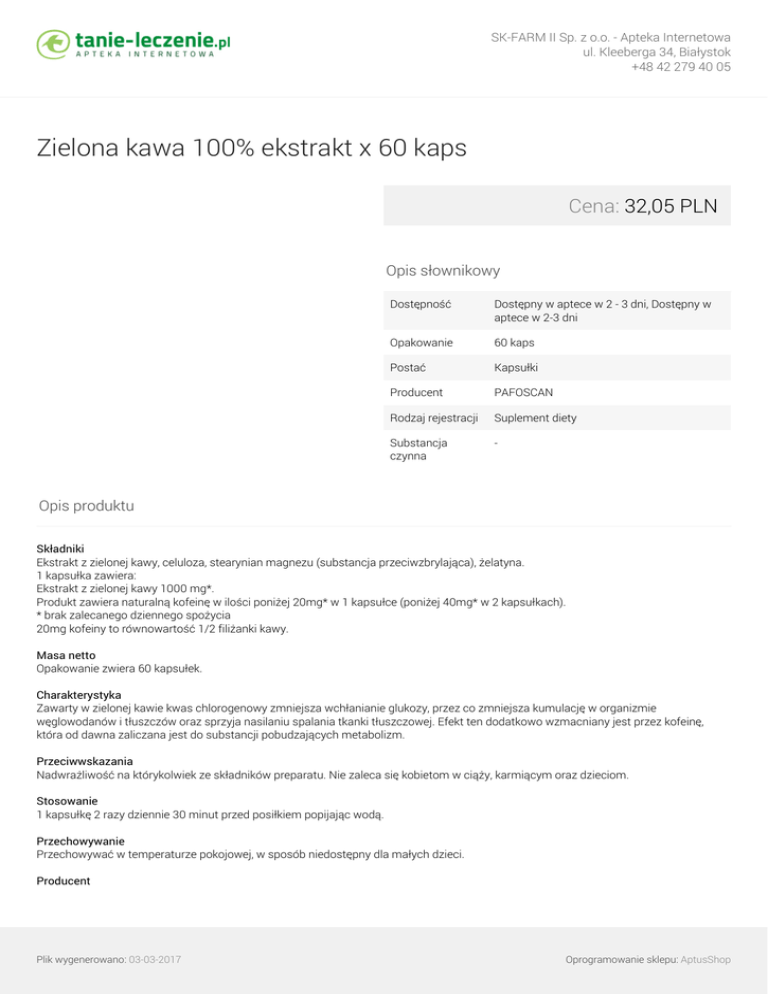 SK-FARM II Sp. z o.o. - Apteka Internetowa ul. Kleeberga 34, Białystok +48 42 279 40 05 Zielona kawa 100% ekstrakt x 60 kaps Cena: 32,05 PLN Opis słownikowy Dostępność Dostępny w aptece w 2 - 3 dni, Dostępny w aptece w 2-3 dni Opakowanie 60 kaps Postać Kapsułki Producent PAFOSCAN Rodzaj rejestracji Suplement diety Substancja czynna - Opis produktu Składniki Ekstrakt z zielonej kawy, celuloza, stearynian magnezu (substancja przeciwzbrylająca), żelatyna. 1 kapsułka zawiera: Ekstrakt z zielonej kawy 1000 mg*. Produkt zawiera naturalną kofeinę w ilości poniżej 20mg* w 1 kapsułce (poniżej 40mg* w 2 kapsułkach). * brak zalecanego dziennego spożycia 20mg kofeiny to równowartość 1/2 filiżanki kawy. Masa netto Opakowanie zwiera 60 kapsułek. Charakterystyka Zawarty w zielonej kawie kwas chlorogenowy zmniejsza wchłanianie glukozy, przez co zmniejsza kumulację w organizmie węglowodanów i tłuszczów oraz sprzyja nasilaniu spalania tkanki tłuszczowej. Efekt ten dodatkowo wzmacniany jest przez kofeinę, która od dawna zaliczana jest do substancji pobudzających metabolizm. Przeciwwskazania Nadwrażliwość na którykolwiek ze składników preparatu. Nie zaleca się kobietom w ciąży, karmiącym oraz dzieciom. Stosowanie 1 kapsułkę 2 razy dziennie 30 minut przed posiłkiem popijając wodą. Przechowywanie Przechowywać w temperaturze pokojowej, w sposób niedostępny dla małych dzieci. Producent Plik wygenerowano: 03-03-2017 Oprogramowanie sklepu: AptusShop SK-FARM II Sp. z o.o. - Apteka Internetowa ul. Kleeberga 34, Białystok +48 42 279 40 05 MyVita Informacje dodatkowe Suplementy diety nie mogą być stosowane jako substytut (zamiennik) zróżnicowanej diety ani zdrowego trybu życia. Nie należy przekraczać zalecanej porcji produktu do spożycia w ciągu dnia. Suplementy diety powinny być przechowywane w sposób niedostępny dla małych dzieci. Przed zastosowaniem produktu sugerujemy zapoznanie się z dokładnymi informacjami podanymi na opakowaniu lub załączonej ulotce. Służymy Państwu pomocą pod adresem [email protected]. Plik wygenerowano: 03-03-2017 Powered by TCPDF (www.tcpdf.org) Oprogramowanie sklepu: AptusShop