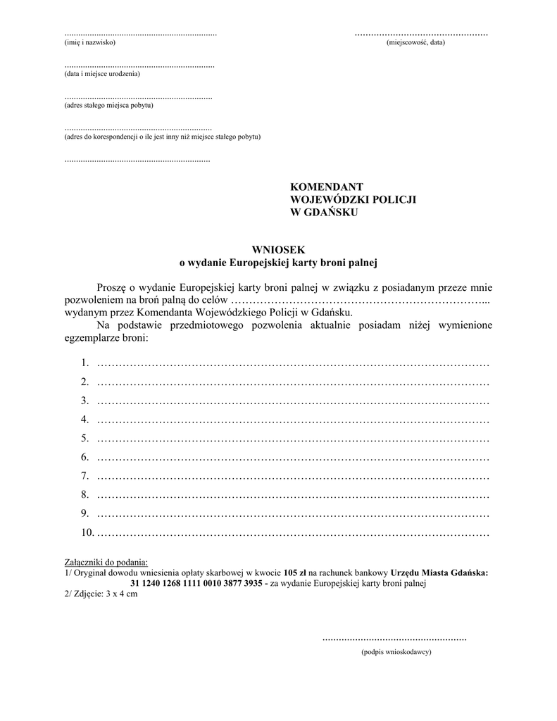 ................................................................... ................................................. (imię i nazwisko) (miejscowość, data) .................................................................. (data i miejsce urodzenia) ................................................................. (adres stałego miejsca pobytu) ................................................................. (adres do korespondencji o ile jest inny niż miejsce stałego pobytu) ................................................................ KOMENDANT WOJEWÓDZKI POLICJI W GDAŃSKU WNIOSEK o wydanie Europejskiej karty broni palnej Proszę o wydanie Europejskiej karty broni palnej w związku z posiadanym przeze mnie pozwoleniem na broń palną do celów ……………………………………………………………... wydanym przez Komendanta Wojewódzkiego Policji w Gdańsku. Na podstawie przedmiotowego pozwolenia aktualnie posiadam niżej wymienione egzemplarze broni: 1. ……………………………………………………………………………………………… 2. ……………………………………………………………………………………………… 3. ……………………………………………………………………………………………… 4. ……………………………………………………………………………………………… 5. ……………………………………………………………………………………………… 6. ……………………………………………………………………………………………… 7. ……………………………………………………………………………………………… 8. ……………………………………………………………………………………………… 9. ……………………………………………………………………………………………… 10. ……………………………………………………………………………………………… Załączniki do podania: 1/ Oryginał dowodu wniesienia opłaty skarbowej w kwocie 105 zł na rachunek bankowy Urzędu Miasta Gdańska: 31 1240 1268 1111 0010 3877 3935 - za wydanie Europejskiej karty broni palnej 2/ Zdjęcie: 3 x 4 cm ..................................................... (podpis wnioskodawcy)