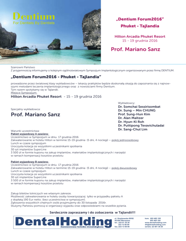 „Dentium Forum2016” Phuket - Tajlandia Hilton Arcadia Phuket Resort 15 - 19 grudnia 2016 Prof. Mariano Sanz Szanowni Państwo Z przyjemnością informujemy o kolejnym ogólnoświatowym Sympozjum Implantologicznym organizowanym przez firmę DENTIUM. „Dentium Forum2016 - Phuket - Tajlandia” prowadzone przez światowej klasy wykładowców – lekarzy praktyków będzie doskonałą okazją do zapoznania się z najnowszymi metodami leczenia implantologicznego oraz z nowościami firmy Dentium. Tym razem spotykamy się w Tajlandii. Miejsce Sympozjum: Hilton Arcadia Phuket Resort - 15 - 19 grudnia 2016 Wykładowcy: Specjalny wykładowca: Prof. Mariano Sanz Dr. Somchai Sessirisombat Dr. Sung – Min CHUNG Prof. Sung-Hun Kim Dr. Alan Maltzer Dr. Hyun-Ki Roh Dr. Puttipong Tevavichuladai Dr. Sang-Chul Lim Warunki uczestnictwa: Pakiet wyjazdowy A zawiera: Uczestnictwo w Sympozjum w dniu 17 grudnia 2016 Zakwaterowanie w hotelu Hilton w terminie 15-19 grudnia (5 dni, 4 noclegi) – pokój jednoosobowy Lunch w czasie sympozjum Uroczysta kolacja ze wszystkimi uczestnikami spotkania 30 szt implantów SuperLine 3 500 zł w formie kuponu na zakup implantów, materiałów implantologicznych i narzędzi w ramach kompensacji kosztów przelotu Pakiet wyjazdowy B zawiera: Uczestnictwo w Sympozjum w dniu 17 grudnia 2016 Zakwaterowanie w hotelu Hilton w terminie 15-19 grudnia (5 dni, 4 noclegi) – pokój dwuosobowy Lunch w czasie sympozjum Uroczysta kolacja ze wszystkimi uczestnikami spotkania 30 szt implantów SuperLine 3 500 zł w formie kuponu na zakup implantów, materiałów implantologicznych i narzędzi w ramach kompensacji kosztów przelotu Zakup biletów lotniczych we własnym zakresie. Możliwość zakwaterowania w hotelu osoby towarzyszącej tylko w przypadku pakietu A z dopłatą 190 Eur netto. (bez uczestnictwa w sympozjum). Zgłoszenia wszystkich chętnych osób przyjmujemy do 30 listopada 2016r. Służymy Państwu pomocą w organizacji wyjazdu oraz odpowiedziami na wszelkie pytania. Serdecznie zapraszamy i do zobaczenia w Tajlandii!!! ul. Grzybowska 80/82 00-844 Warszawa tel.: 225 01 38 38 223 13 08 80 fax.:223 13 08 90 kom. 693 465 185 693 465 184 www.dentalholding.com [email protected] serwis: 22 501 38 28