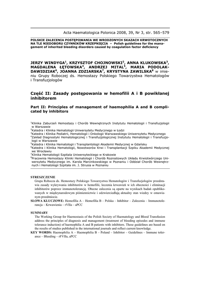 Acta Haematologica Polonica 2008, 39, Nr 3, str. 565–579 POLSKIE ZALECENIA POSTĘPOWANIA WE WRODZONYCH SKAZACH KRWOTOCZNYCH NA TLE NIEDOBORU CZYNNIKÓW KRZEPNIĘCIA – Polish guidelines for the management of inherited bleeding disorders caused by coagulation factor deficiency JERZY WINDYGA1, KRZYSZTOF CHOJNOWSKI2, ANNA KLUKOWSKA3, MAGDALENA ŁĘTOWSKA4, ANDRZEJ MITAL5, MARIA PODOLAKDAWIDZIAK6, JOANNA ZDZIARSKA7, KRYSTYNA ZAWILSKA8 w imieniu Grupy Roboczej ds. Hemostazy Polskiego Towarzystwa Hematologów i Transfuzjologów Część II: Zasady postępowania w hemofilii A i B powikłanej inhibitorem Part II: Principles of management of haemophilia A and B complicated by inhibitors 1 Klinika Zaburzeń Hemostazy i Chorób Wewnętrznych Instytutu Hematologii i Transfuzjologii w Warszawie 2 Katedra i Klinika Hematologii Uniwersytetu Medycznego w Łodzi 3 Katedra i Klinika Pediatrii, Hematologii i Onkologii Warszawskiego Uniwersytetu Medycznego 4 Zakład Diagnostyki Hematologicznej i Transfuzjologicznej Instytutu Hematologii i Transfuzjologii w Warszawie 5 Katedra i Klinika Hematologii i Transplantologii Akademii Medycznej w Gdańsku 6 Katedra i Klinika Hematologii, Nowotworów Krwi i Transplantacji Szpiku Akademii Medycznej we Wrocławiu 7 Klinika Hematologii Szpitala Uniwersyteckiego w Krakowie 8 Pracownia Hemostazy Kliniki Hematologii i Chorób Rozrostowych Układu Krwiotwórczego Uniwersytetu Medycznego im. Karola Marcinkowskiego w Poznaniu i Oddział Chorób Wewnętrznych i Hematologii Szpitala im. J. Strusia w Poznaniu STRESZCZENIE Grupa Robocza ds. Hemostazy Polskiego Towarzystwa Hematologów i Transfuzjologów przedstawia zasady wykrywania inhibitorów w hemofilii, leczenia krwawień w ich obecności i eliminacji inhibitorów poprzez immunotolerancję. Obecne zalecenia są oparte na wynikach badań opublikowanych w międzynarodowym piśmiennictwie i odzwierciedlają aktualny stan wiedzy w omawianym przedmiocie. SŁOWA KLUCZOWE: Hemofilia A – Hemofilia B – Polska – Inhibitor – Zalecenia – Immunotolerancja – Krwawienia – rVIIa – aPCC SUMMARY The Working Group for Haemostasis of the Polish Society of Haematology and Blood Transfusion address the principles of diagnosis and management (treatment of bleeding episodes and immune tolerance induction) of haemophilia A and B patients with inhibitors. These guidelines are based on the results of studies published in the international journals and reflect current knowledge. KEY WORDS: Haemophilia A – Haemophilia B – Poland – Inhibitor – Guidelines – Immune tolerance – Bleeding – rFVIIa, aPCC 566 J. WINDYGA i wsp. CEL ZALECEŃ Przedstawienie zasad rozpoznawania i leczenia hemofilii A i B powikłanej inhibitorem czynnika VIII (cz. VIII) lub czynnika IX (cz. IX). Niniejsze zalecenia są kontynuacją części I zaleceń, w których omówiono zasady diagnostyki i leczenia hemofilii A i B. WPROWADZENIE Inhibitory cz. VIII i cz. IX stanowią jedno z najpowaŜniejszych powikłań hemofilii. W ich obecności krwawienia na ogół nie poddają się leczeniu substytucyjnemu z zastosowaniem koncentratów niedoborowego czynnika krzepnięcia krwi. Najczęściej leczenie krwawień w tej grupie chorych opiera się na stosowaniu koncentratów czynników krzepnięcia omijających inhibitor (ang. by passing agents), których koszt wielokrotnie przewyŜsza cenę koncentratów czynników VIII i IX, a skuteczność jest mimo to mniejsza niŜ tych ostatnich w leczeniu krwawień u pacjentów z hemofilią bez inhibitora (1). Obecne zalecenia są pierwszymi w piśmiennictwie polskim, które obszernie opisują zasady wykrywania inhibitorów w hemofilii, leczenia krwawień w ich obecności i eliminacji inhibitorów poprzez immunotolerancję. Definicja Mianem inhibitora lub krąŜącego antykoagulantu czynnika VIII lub czynnika IX określa się poliklonalne alloprzeciwciała, pojawiające się u części chorych na hemofilię A lub B w odpowiedzi na podawany doŜylnie koncentrat cz. VIII lub cz. IX. Zatem inhibitor cz. VIII lub cz. IX u chorego na wrodzoną hemofilię nie jest powikłaniem samej choroby, lecz jej leczenia. Zagadnienie nabytej hemofilii, która jest odrębną jednostką chorobową, spowodowaną pojawieniem się autoprzeciwciał przeciwko czynnikowi krzepnięcia VIII u osoby nie obarczonej wrodzoną hemofilią, zostało ostatnio obszernie omówione w pracy poglądowej opublikowanej w polskim piśmiennictwie (2). Etiologia i patogeneza Większość alloprzeciwciał przeciwko cz. VIII i cz. IX naleŜy do immunoglobulin (Ig) klasy G4, których charakterystyczną cechą jest brak wiązania dopełniacza (3). Przeciwciała znoszą aktywność koagulacyjną cz. VIII poprzez zablokowanie jego miejsc oddziaływania z czynnikami IIa (trombiną), IXa, X, czynnikiem von Willebranda (cz. vW) lub z fosfolipidami (4). Rzadziej inhibitory cz. VIII wykazują aktywność katalityczną, hydrolizując białko (3). Niektóre przeciwciała przeciwko cz. VIII nie wykazują zdolności inaktywacji białka i są określane mianem nieneutralizujących. Ich rola nie została do końca poznana (5). Upośledzenie działania koagulacyjnego cz. IX przez przeciwciała polega na blokowaniu wiązania z czynnikiem VIII i fosfolipidami. Część II: Zasady postępowania w hemofilii A i B powikłanej inhibitorem 567 Zarówno czynniki genetyczne jak i środowiskowe wpływają na pojawienie się inhibitorów w hemofilii. Ryzyko wystąpienia inhibitorów w hemofilii A i B jest największe w przypadkach mutacji genu cz. VIII lub cz. IX całkowicie znoszących syntezę białka. Do innych czynników genetycznych zwiększających ryzyko wystąpienia inhibitora zalicza się niektóre polimorfizmy genów odpowiedzialnych za nadzór nad układem odpornościowym, występowanie inhibitorów u innych członków rodziny obarczonych hemofilią oraz rasę inną niŜ biała (6). Wśród potencjalnych środowiskowych czynników ryzyka wystąpienia inhibitora wymienia się przede wszyst