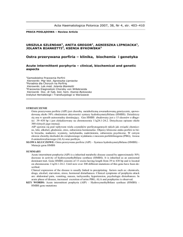 Acta Haematologica Polonica 2007, 38, Nr 4, str. 403–410 PRACA POGLĄDOWA – Review Article URSZULA SZLENDAK1, ANITA GREGOR1, AGNIESZKA LIPNIACKA1, JOLANTA BIANKETTI2, KSENIA BYKOWSKA3 Ostra przerywana porfiria – klinika, biochemia i genetyka Acute intermittent porphyria – clinical, biochemical and genetic aspects 1 Samodzielna Pracownia Porfirii Kierownik: Mgr biol. Agnieszka Lipniacka 2 Poradnia dla Chorych na Porfirię Kierownik: Lek.med. Jolanta Bianketti 3 Pracownia Diagnostyki Choroby von Willebranda Kierownik Doc. dr hab. biol. hem. Ksenia Bykowska Instytut Hematologii i Transfuzjologii w Warszawie STRESZCZENIE Ostra przerywana porfiria (AIP) jest chorobą metaboliczną uwarunkowaną genetycznie, spowodowaną około 50% obniŜeniem aktywności syntazy hydroksymetylbilanu (HMBS). Dziedziczy się ona w sposób autosomalny dominujący. Gen HMBS zbudowany jest z 15 eksonów o długości 39–438 bp i jest zlokalizowany na chromosomie 11q24.1-24.2. Dotychczas opisano około 300 róŜnych jego mutacji. AIP ujawnia się pod wpływem wielu czynników porfirynogennych takich jak związki chemiczne, leki, alkohol, głodzenie, stres, zaburzenia hormonalne. Objawy kliniczne ataku porfirii to bóle brzucha, nudności, wymioty, tachykardia, nadciśnienie, zaburzenia psychiczne. W ostrym okresie choroby dochodzi do zwiększonego wydalania z moczem porfobilinogenu (PBG), kwasu ð-aminolewulinowego (ALA) oraz porfiryn. SŁOWA KLUCZOWE: Ostra przerywana porfiria (AIP) – Syntaza hydroksymetylbilanu (HMBS) – Mutacje genu HMBS SUMMARY Acute intermittent porphyria (AIP) is a inherited metabolic disease caused by approximately 50% decrease in activity of hydroxymethylbilane synthase (HMBS). It is inherited as an autosomal dominant trait. Gene HMBS consists of 15 exons having length from 39 to 438 bp and is located on chromosome 11q24.1-24.2. Until now over 300 different mutations of this gene have been described. Clinical expression of the disease is usually linked to precipitating factors such as: chemicals, drugs, alcohol, starvation, stress, hormonal disturbances. Clinical symptoms of porphyria attack are: abdominal pain, vomiting, nausea, tachycardia, hypertension, psychologic disturbances. In acute phase of disease, increased excretion of urine PBG, ALA and porphyrins is observed. KEY WORDS: Acute intermittent porphyria (AIP) – Hydroxymethylbilane synthase (HMBS) – HMBS gene mutations 404 U. SZLENDAK i wsp. WSTĘP Porfirie to grupa genetycznie uwarunkowanych chorób metabolicznych, spowodowanych częściowym niedoborem enzymów biorących udział w biosyntezie hemu (23). Większość z nich dziedziczy się w sposób autosomalny dominujący z niepełną penetracją kliniczną. Hem jest grupą prostetyczną hemoprotein i bierze udział w wielu waŜnych dla Ŝycia procesach: w wiązaniu i przenoszeniu tlenu (hemoglobina, mioglobina), w transporcie elektronów (cytochrom mitochondrialny), w metaboliźmie sterydów i wielu leków (mikrosomalny cytochrom P-450), w metaboliźmie nadtlenku wodoru (katalaza i peroksydaza), utlenianiu tryptofanu (pyrolaza tryptofanu) (28). Głównym miejscem syntezy hemu jest wątroba i szpik kostny. Enzymem regulującym szybkość biosyntezy hemu w wątrobie jest syntaza kwasu δ-aminolewulinowego (ALAS). Aktywność ALAS jest regulowana na drodze ujemnego sprzęŜenia zwrotnego przez produkt końcowy biosyntezy – hem. W układzie erytropoetycznym mechanizm regulacji syntezy hemu jest inny niŜ w wątrobie i nie jest do końca poznany. W biosyntezie hemu bierze udział osiem róŜnych enzymów (Ryc. 1). ObniŜenie aktywności co najmniej jednego z nich powoduje powstanie bloku enzymatycznego, gromadzenie się pośrednich metabolitów, głównie występujących bezpośrednio przed blokiem enzymatycznym i zmniejszenie ilości wytwarzanego hemu. Niedobór hemu powoduje wzrost aktywności ALAS i dalsze zwiększone wytwarzanie i gromadzenie poszczególnych metabolitów (14). W zaleŜności od tkanki w której dominuje zaburzenie biosyntezy hemu, porfirie dzieli się na wątrobowe i erytropoetyczne, klinicznie natomiast rozróŜnia się porfirie ostre i nieostre. Wśród ostrych porfirii wątrobowych wyróŜniamy: ostrą przerywaną porfirię (AIP-acute intermittent porphyria), porfirię mieszaną (VP-variegate porphyria), dziedziczną koproporfirię (HC-hereditary coproporphyria) i porfirię z niedoboru dehydratazy kwasu δ-aminolewulinowego (ALADP – ALA dehydratase deficiency porphyria). Wśród porfirii nieostrych wyróŜniamy wrodzoną porfirię erytropoetyczną (CEP – congenital erythropoietic porphyria), protoporfirię erytropoetyczną (EPP – erythropoietic protoporphyria) i porfirię skórną późną (PCT – porphyria cutanea tarda) (23). W Europie najczęściej występuje ostra przerywana porfiria. W Polsce liczba rodzin z AIP zarejestrowanych w Samodzielnej Pracowni Porfirii IHiT (338 rodzin ) jest czterokrotnie większa od liczby rodzin z porfirią mieszaną. Koproporfiria dziedziczna występuje w Polsce rzadko, w IHiT zarejestrowanych jest tylko 7 rodzin. Częstość AIP liczona na podstawie przypadków jawnych w Europie wynosi 1–2/ 100 000 mieszkańców, w Finlandii 2,4/100 000, w całej Szwecji 1/10 000 a w północnej Szwecji 1 na 1000 osób. Częstość występowania AIP oceniana na podstawie obniŜonej aktywności PBGD wynosi w Finlandii 1/500, a we Francji 0,6/1000 mieszkańców (4,8,20,25). W Samodzielnej Pracowni Porfirii IHiT, jedynym ośrodku w Polsce gdzie diagnozuje się i leczy wszystkie rodzaje porfirii, zarejestrowane są 554 osoby z jawną postacią AIP, co daje częstość około 1,5 na 100 000 mieszkańców. Ostra przerywana porfiria 405 Glicyna + Bursztynylo-CoA Syntaza kwasu δ-aminolewulinowego Kwas δ-aminolewulinowy ∗ Porfiria z niedoboru ALA-dehydratazy Dehydrataza kwasu δ-aminolewulinowego Porfobilinogen ∗ Ostra przerywana porfiria Deaminaza porfobilinogenu Hydroksymetylbilan ∗ Wrodzona porfiria erytropoetyczna