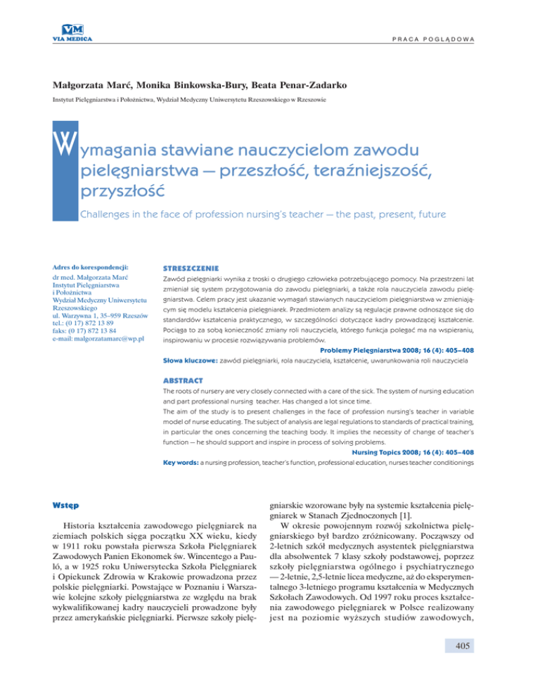 PRACA POGLĄDOWA Małgorzata Marć, Monika Binkowska-Bury, Beata Penar-Zadarko Instytut Pielęgniarstwa i Położnictwa, Wydział Medyczny Uniwersytetu Rzeszowskiego w Rzeszowie W ymagania stawiane nauczycielom zawodu pielęgniarstwa — przeszłość, teraźniejszość, przyszłość Challenges in the face of profession nursing’s teacher — the past, present, future Adres do korespondencji: STRESZCZENIE dr med. Małgorzata Marć Instytut Pielęgniarstwa i Położnictwa Wydział Medyczny Uniwersytetu Rzeszowskiego ul. Warzywna 1, 35–959 Rzeszów tel.: (0 17) 872 13 89 faks: (0 17) 872 13 84 e-mail: [email protected] Zawód pielęgniarki wynika z troski o drugiego człowieka potrzebującego pomocy. Na przestrzeni lat zmieniał się system przygotowania do zawodu pielęgniarki, a także rola nauczyciela zawodu pielęgniarstwa. Celem pracy jest ukazanie wymagań stawianych nauczycielom pielęgniarstwa w zmieniającym się modelu kształcenia pielęgniarek. Przedmiotem analizy są regulacje prawne odnoszące się do standardów kształcenia praktycznego, w szczególności dotyczące kadry prowadzącej kształcenie. Pociąga to za sobą konieczność zmiany roli nauczyciela, którego funkcja polegać ma na wspieraniu, inspirowaniu w procesie rozwiązywania problemów. Problemy Pielęgniarstwa 2008; 16 (4): 405–408 Słowa kluczowe: zawód pielęgniarki, rola nauczyciela, kształcenie, uwarunkowania roli nauczyciela ABSTRACT The roots of nursery are very closely connected with a care of the sick. The system of nursing education and part professional nursing teacher. Has changed a lot since time. The aim of the study is to present challenges in the face of profession nursing’s teacher in variable model of nurse educating. The subject of analysis are legal regulations to standards of practical training, in particular the ones concerning the teaching body. It implies the necessity of change of teacher’s function — he should support and inspire in process of solving problems. Nursing Topics 2008; 16 (4): 405–408 Key words: a nursing profession, teacher’s function, professional education, nurses teacher conditionings Wstęp Historia kształcenia zawodowego pielęgniarek na ziemiach polskich sięga początku XX wieku, kiedy w 1911 roku powstała pierwsza Szkoła Pielęgniarek Zawodowych Panien Ekonomek św. Wincentego a Pauló, a w 1925 roku Uniwersytecka Szkoła Pielęgniarek i Opiekunek Zdrowia w Krakowie prowadzona przez polskie pielęgniarki. Powstające w Poznaniu i Warszawie kolejne szkoły pielęgniarstwa ze względu na brak wykwalifikowanej kadry nauczycieli prowadzone były przez amerykańskie pielęgniarki. Pierwsze szkoły pielę- gniarskie wzorowane były na systemie kształcenia pielęgniarek w Stanach Zjednoczonych [1]. W okresie powojennym rozwój szkolnictwa pielęgniarskiego był bardzo zróżnicowany. Począwszy od 2-letnich szkół medycznych asystentek pielęgniarstwa dla absolwentek 7 klasy szkoły podstawowej, poprzez szkoły pielęgniarstwa ogólnego i psychiatrycznego — 2-letnie, 2,5-letnie licea medyczne, aż do eksperymentalnego 3-letniego programu kształcenia w Medycznych Szkołach Zawodowych. Od 1997 roku proces kształcenia zawodowego pielęgniarek w Polsce realizowany jest na poziomie wyższych studiów zawodowych, 405 PROBLEMY PIELĘGNIARSTWA 2008, tom 16, zeszyt nr 4 a obecnie na studiach I i II stopnia. Wraz ze zmianami w systemie ochrony zdrowia i kształcenia przeddyplomowego pielęgniarek zmieniały się kwalifikacje i kompetencje nauczyciela szkoły pielęgniarskiej, a zatem zmieniał się również model nauczyciela zawodu — nauczyciela pielęgniarstwa [2]. Celem niniejszej pracy jest ukazanie wymagań stawianych nauczycielom pielęgniarstwa w zmieniającym się modelu kształcenia pielęgniarek. Przedmiotem analizy jest zmieniający się model nauczyciela zawodu — nauczyciela pielęgniarstwa, w polskim systemie kształcenia pielęgniarek na przestrzeni dziejów, ze szczególnym zwróceniem uwagi na uwarunkowania wpływające na wypełnianie roli nauczyciela. Uwarunkowania współczesnego modelu nauczyciela pielęgniarstwa w Polsce Zmiany w kwalifikacjach nauczycieli zawodu w okresie powojennym W okresie powojennym w 1949 roku dzięki inicjatywie Racheli Hutner i Jadwidze Kaniewskiej-Iżyckiej powołano pierwszy w Polsce Ośrodek Kształcenia Instruktorek Pielęgniarstwa. Pilna potrzeba powołania Ośrodka była podyktowana faktem uruchamiania średnich szkół medycznych oraz brakiem zorganizowanego kształcenia nauczycieli tych szkół. Początkowo prowadzono tylko półroczne przeszkolenie dla pielęgniarek podejmujących pracę w szkolnictwie pielęgniarskim, głównie z zakresu metodyki nauczania pielęgniarstwa. W 1956 roku Ośrodek został przekształcony w Studium Nauczycieli Średnich Szkół Medycznych. Kilka lat później, bo w 1962 roku powołano Rachelę Hutner do zorganizowania i prowadzenia Centralnego Ośrodka Doskonalenia Kadr Medycznych. W późniejszych latach funkcjonował on pod nazwą: Centralny Ośrodek Doskonalenia Nauczycieli Średnich Kadr Medycznych. Jednym z jego zadań było doskonalenie zawodowe, czyli specjalizacje, w tym również specjalizacje dla nauczycieli szkół medycznych [3]. W latach 50. i 60. szczególnym problemem w kształceniu pielęgniarek był brak nauczycieli zawodu posiadających właściwe kwalifikacje. I tak w roku 1960 tylko co 4 nauczyciel zawodu miał wykształcenie wyższe lub niepełne wyższe, co 2 — wykształcenie średnie, a co 3 niepełne średnie. W celu podnoszenia poziomu wykształcenia zobowiązano wszystkich nauczycieli zawodu, którzy nie ukończyli szkoły średniej do uzupełnienia wykształcenia [4]. Przełomem w przygotowywaniu nauczycieli zawodu było powołanie w 1969 roku 3-letniego Studium Pielęgniarstwa w Akademii Medycznej w Lublinie, które 3 lata później zostało przekształcone w Wydział Pielęgniarstwa. Studia na Wydziale trwały 4 lata i kończyły się 