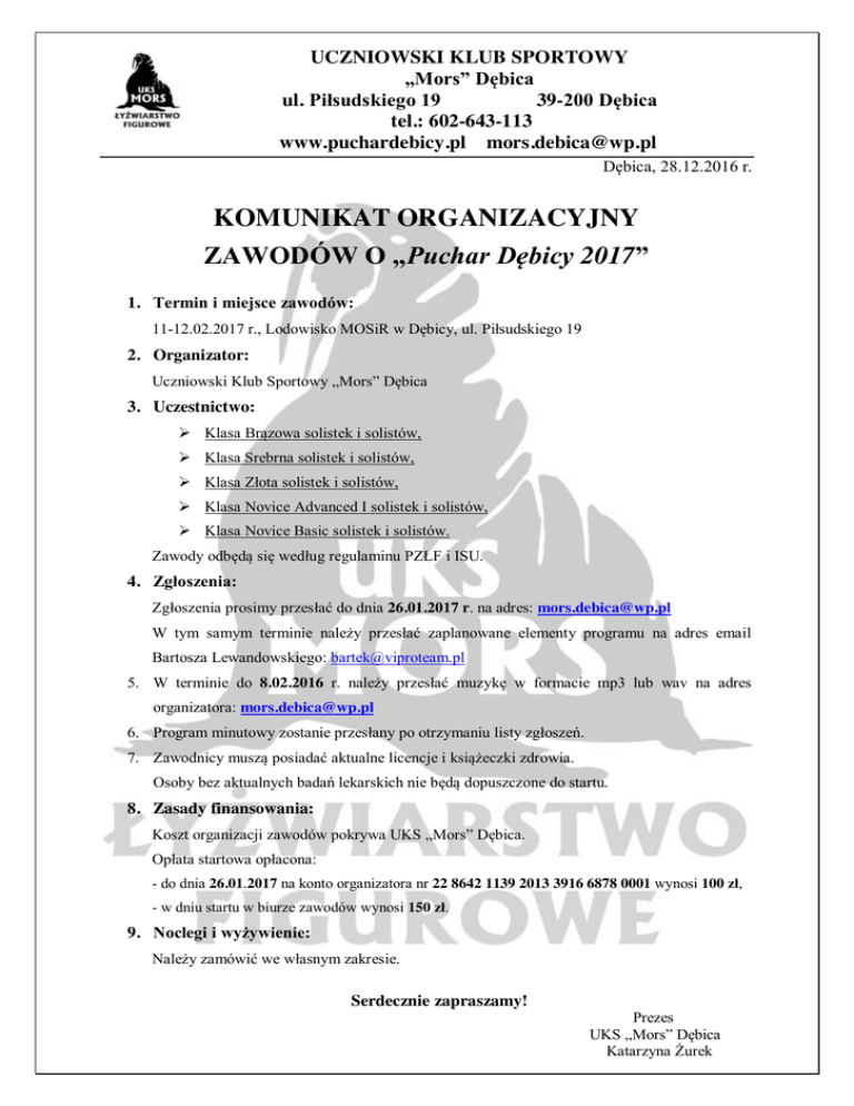 UCZNIOWSKI KLUB SPORTOWY „Mors” Dębica ul. Piłsudskiego 19 39-200 Dębica tel.: 602-643-113 www.puchardebicy.pl [email protected] Dębica, 28.12.2016 r. KOMUNIKAT ORGANIZACYJNY ZAWODÓW O „Puchar Dębicy 2017” 1. Termin i miejsce zawodów: 11-12.02.2017 r., Lodowisko MOSiR w Dębicy, ul. Piłsudskiego 19 2. Organizator: Uczniowski Klub Sportowy „Mors” Dębica 3. Uczestnictwo: Klasa Brązowa solistek i solistów, Klasa Srebrna solistek i solistów, Klasa Złota solistek i solistów, Klasa Novice Advanced I solistek i solistów, Klasa Novice Basic solistek i solistów. Zawody odbędą się według regulaminu PZŁF i ISU. 4. Zgłoszenia: Zgłoszenia prosimy przesłać do dnia 26.01.2017 r. na adres: [email protected] W tym samym terminie należy przesłać zaplanowane elementy programu na adres email Bartosza Lewandowskiego: [email protected] 5. W terminie do 8.02.2016 r. należy przesłać muzykę w formacie mp3 lub wav na adres organizatora: [email protected] 6. Program minutowy zostanie przesłany po otrzymaniu listy zgłoszeń. 7. Zawodnicy muszą posiadać aktualne licencje i książeczki zdrowia. Osoby bez aktualnych badań lekarskich nie będą dopuszczone do startu. 8. Zasady finansowania: Koszt organizacji zawodów pokrywa UKS „Mors” Dębica. Opłata startowa opłacona: - do dnia 26.01.2017 na konto organizatora nr 22 8642 1139 2013 3916 6878 0001 wynosi 100 zł, - w dniu startu w biurze zawodów wynosi 150 zł. 9. Noclegi i wyżywienie: Należy zamówić we własnym zakresie. Serdecznie zapraszamy! Prezes UKS „Mors” Dębica Katarzyna Żurek
