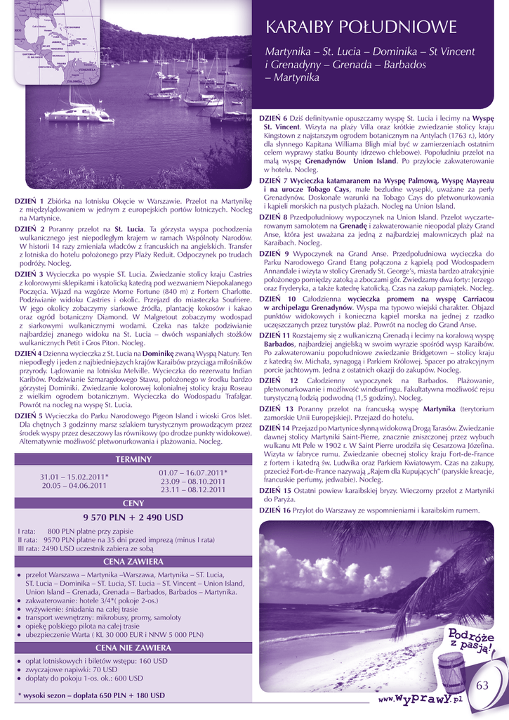 KARAIBY Południowe Martynika – St. Lucia – Dominika – st vincent i grenadyny – grenada – barbados – Martynika DZIEŃ 6 Dziś definitywnie opuszczamy wyspę St. Lucia i lecimy na Wyspę St. Vincent. Wizyta na plaży Villa oraz krótkie zwiedzanie stolicy kraju Kingstown z najstarszym ogrodem botanicznym na Antylach (1763 r.), który dla słynnego Kapitana Williama Bligh miał być w zamierzeniach ostatnim celem wyprawy statku Bounty (drzewo chlebowe). Popołudniu przelot na małą wyspę Grenadynów Union Island. Po przylocie zakwaterowanie w hotelu. Nocleg. DZIEŃ 7 Wycieczka katamaranem na Wyspę Palmową, Wyspę Mayreau i na urocze Tobago Cays, małe bezludne wysepki, uważane za perły Grenadynów. Doskonałe warunki na Tobago Cays do płetwonurkowania DZIEŃ 1 Zbiórka na lotnisku Okęcie w Warszawie. Przelot na Martynikę i kąpieli morskich na pustych plażach. Nocleg na Union Island. z międzylądowaniem w jednym z europejskich portów lotniczych. Nocleg DZIEŃ 8 Przedpołudniowy wypoczynek na Union Island. Przelot wyczartena Martynice. rowanym samolotem na Grenadę i zakwaterowanie nieopodal plaży Grand DZIEŃ 2 Poranny przelot na St. Lucia. Ta górzysta wyspa pochodzenia Anse, która jest uważana za jedną z najbardziej malowniczych plaż na wulkanicznego jest niepodległym krajem w ramach Wspólnoty Narodów. Karaibach. Nocleg. W historii 14 razy zmieniała władców z francuskich na angielskich. Transfer z lotniska do hotelu położonego przy Plaży Reduit. Odpoczynek po trudach DZIEŃ 9 Wypoczynek na Grand Anse. Przedpołudniowa wycieczka do Parku Narodowego Grand Etang połączona z kąpielą pod Wodospadem podróży. Nocleg. Annandale i wizyta w stolicy Grenady St. George’s, miasta bardzo atrakcyjnie DZIEŃ 3 Wycieczka po wyspie ST. Lucia. Zwiedzanie stolicy kraju Castries położonego pomiędzy zatoką a zboczami gór. Zwiedzamy dwa forty: Jerzego z kolorowymi sklepikami i katolicką katedrą pod wezwaniem Niepokalanego oraz Fryderyka, a także katedrę katolicką. Czas na zakup pamiątek. Nocleg. Poczęcia. Wjazd na wzgórze Morne Fortune (840 m) z Fortem Charlotte. Podziwianie widoku Castries i okolic. Przejazd do miasteczka Soufriere. DZIEŃ 10 Całodzienna wycieczka promem na wyspę Carriacou w archipelagu Grenadynów. Wyspa ma typowo wiejski charakter. Objazd W jego okolicy zobaczymy siarkowe źródła, plantację kokosów i kakao punktów widokowych i konieczna kąpiel morska na jednej z rzadko oraz ogród botaniczny Diamond. W Malgretout zobaczymy wodospad uczęszczanych przez turystów plaż. Powrót na nocleg do Grand Anse. z siarkowymi wulkanicznymi wodami. Czeka nas także podziwianie najbardziej znanego widoku na St. Lucia – dwóch wspaniałych stożków Dzień 11 Rozstajemy się z wulkaniczną Grenadą i lecimy na koralową wyspę wulkanicznych Petit i Gros Piton. Nocleg. Barbados, najbardziej angielską w swoim wyrazie spośród wysp Karaibów. Po zakwaterowaniu popołudniowe zwiedzanie Bridgetown – stolicy kraju Dzień 4 Dzienna wycieczka z St. Lucia na Dominikę zwaną Wyspą Natury. Ten z katedrą św. Michała, synagogą i Parkiem Królowej. Spacer po atrakcyjnym niepodległy i jeden z najbiedniejszych krajów Karaibów przyciąga miłośników porcie jachtowym. Jedna z ostatnich okazji do zakupów. Nocleg. przyrody. Lądowanie na lotnisku Melville. Wycieczka do rezerwatu Indian Karibów. Podziwianie Szmaragdowego Stawu, położonego w środku bardzo DZIEŃ 12 Całodzienny wypoczynek na Barbados. Plażowanie, górzystej Dominiki. Zwiedzanie kolorowej kolonialnej stolicy kraju Roseau płetwonurkowanie i możliwość windsurfingu. Fakultatywna możliwość rejsu z wielkim ogrodem botanicznym. Wycieczka do Wodospadu Trafalgar. turystyczną łodzią podwodną (1,5 godziny). Nocleg. Powrót na nocleg na wyspę St. Lucia. DZIEŃ 13 Poranny przelot na francuską wyspę Martynika (terytorium DZIEŃ 5 Wycieczka do Parku Narodowego Pigeon Island i wioski Gros Islet. zamorskie Unii Europejskiej). Przejazd do hotelu. Dla chętnych 3 godzinny marsz szlakiem turystycznym prowadzącym przez DZIEŃ 14 Przejazd po Martynice słynną widokową Drogą Tarasów. Zwiedzanie środek wyspy przez deszczowy las równikowy (po drodze punkty widokowe). dawnej stolicy Martyniki Saint-Pierre, znacznie zniszczonej przez wybuch Alternatywnie możliwość płetwonurkowania i plażowania. Nocleg. wulkanu Mt Pele w 1902 r. W Saint Pierre urodziła się Cesarzowa Józefina. Wizyta w fabryce rumu. Zwiedzanie obecnej stolicy kraju Fort-de-France TERMINY z fortem i katedrą św. Ludwika oraz Parkiem Kwiatowym. Czas na zakupy, przecież Fort-de-France nazywają „Rajem dla Kupujących” (paryskie kreacje, 01.07 – 16.07.2011* 31.01 – 15.02.2011* francuskie perfumy, jedwabie). Nocleg. 23.09 – 08.10.2011 20.05 – 04.06.2011 23.11 – 08.12.2011 CENY 9 570 PLN + 2 490 USD DZIEŃ 15 Ostatni powiew karaibskiej bryzy. Wieczorny przelot z Martyniki do Paryża. DZIEŃ 16 Przylot do Warszawy ze wspomnieniami i karaibskim rumem. I rata: 800 PLN płatne przy zapisie II rata: 9570 PLN płatne na 35 dni przed imprezą (minus I rata) III rata: 2490 USD uczestnik zabiera ze sobą CENA ZAWIERA · przelot Warszawa – Martynika –Warszawa, Martynika – ST. Lucia, ST. Lucia – Dominika – ST. Lucia, ST. Lucia – ST. Vincent – Union Island, Union Island – Grenada, Grenada – Barbados, Barbados – Martynika. · zakwaterowanie: hotele 3/4*( pokoje 2-os.) · wyżywienie: śniadania na całej trasie · transport wewnętrzny: mikrobusy, promy, samoloty · opiekę polskiego pilota na całej trasie · ubezpieczenie Warta ( KL 30 000 EUR i NNW 5 000 PLN) CENA NIE ZAWIERA · opłat lotniskowych i biletów wstępu: 160 USD · zwyczajowe napiwki: 70 USD · dopłaty do pokoju 1-os. ok.: 600 USD * wysoki sezon – dopłata 650 PLN + 180 USD 63