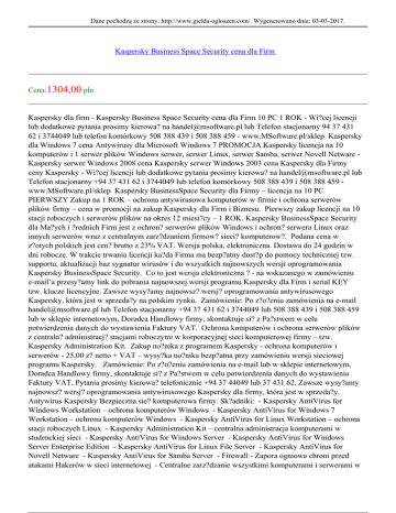 Dane pochodzą ze strony: http://www.gielda-ogloszen.com/. Wygenerowano dnia: 03-03-2017. Kaspersky Business Space Security cena dla Firm Cena:1304,00 pln Kaspersky dla firm - Kaspersky Business Space Security cena dla Firm 10 PC 1 ROK - Wi?cej licencji lub dodatkowe pytania prosimy kierowa? na [email protected] lub Telefon stacjonarny 94 37 431 62 i 3744049 lub telefon komórkowy 508 388 439 i 508 388 459 - www.MSoftware.pl/sklep Kaspersky dla Windows 7 cena Antywirusy dla Microsoft Windows 7 PROMOCJA Kaspersky licencja na 10 komputerów i 1 serwer plików Windows serwer, serwer Linux, serwer Samba, serwer Novell Netware Kaspersky serwer Windows 2008 cena Kaspersky serwer Windows 2003 cena Kaspersky dla Firmy ceny Kaspersky - Wi?cej licencji lub dodatkowe pytania prosimy kierowa? na [email protected] lub Telefon stacjonarny +94 37 431 62 i 3744049 lub telefon komórkowy 508 388 439 i 508 388 459 www.MSoftware.pl/sklep Kaspersky BusinessSpace Security dla Firmy – licencja na 10 PC PIERWSZY Zakup na 1 ROK – ochrona antywirusowa komputerów w firmie i ochrona serwerów plików firmy – cena w promocji na zakup Kaspersky dla Firm i Biznesu. Pierwszy zakup licencji na 10 stacji roboczych i serwerów plików na okres 12 miesi?cy – 1 ROK. Kaspersky BusinessSpace Security dla Ma?ych i ?rednich Firm jest z ochron? serwerów plików Windows i ochron? serwera Linux oraz innych serwerów wraz z centralnym zarz?dzaniem firmow? sieci? komputerow?. Podana cena w z?otych polskich jest cen? brutto z 23% VAT. Wersja polska, elektroniczna. Dostawa do 24 godzin w dni robocze. W trakcie trwania licencji ka?da Firma ma bezp?atny dost?p do pomocy technicznej tzw. supportu, aktualizacji baz sygnatur wirusów i do wszystkich najnowszych wersji oprogramowania Kaspersky BusinessSpace Security. Co to jest wersja elektroniczna ? - na wskazanego w zamówieniu e-mail’a przesy?amy link do pobrania najnowszej wersji programu Kaspersky dla Firm i serial KEY tzw. klucze licencyjne. Zawsze wysy?amy najnowsz? wersj? oprogramowania antywirusowego Kaspersky, która jest w sprzeda?y na polskim rynku. Zamówienie: Po z?o?eniu zamówienia na e-mail [email protected] lub Telefon stacjonarny +94 37 431 62 i 3744049 lub 508 388 439 i 508 388 459 lub w sklepie internetowym, Doradca Handlowy firmy, skontaktuje si? z Pa?stwem w celu potwierdzenia danych do wystawienia Faktury VAT. Ochrona komputerów i ochrona serwerów plików z centraln? administracj? stacjami roboczymi w korporacyjnej sieci komputerowej firmy – tzw. Kaspersky Administration Kit. Zakup no?nika z programem Kaspersky - ochrona komputerów i serwerów - 25,00 z? netto + VAT – wysy?ka no?nika bezp?atna przy zamówieniu wersji sieciowej programu Kaspersky. Zamówienie: Po z?o?eniu zamówienia na e-mail lub w sklepie internetowym, Doradca Handlowy firmy, skontaktuje si? z Pa?stwem w celu potwierdzenia danych do wystawienia Faktury VAT. Pytania prosimy kierowa? telefonicznie +94 37 44049 lub 37 431 62. Zawsze wysy?amy najnowsz? wersj? oprogramowania antywirusowego Kaspersky dla firmy, która jest w sprzeda?y. Antywirus Kaspersky Bezpieczna sie? komputerowa firmy. Sk?adniki: - Kaspersky AntiVirus for Windows Workstation – ochrona komputerów Windows - Kaspersky AntiVirus for Windows 7 Workstation – ochrona komputerów Windows - Kaspersky AntiVirus for Linux Workstation – ochrona stacji roboczych Linux - Kaspersky Administration Kit – centralna administracja komputerami w studenckiej sieci - Kaspersky AntiVirus for Windows Server - Kaspersky AntiVirus for Windows Server Enterprise Edition - Kaspersky AntiVirus for Linux File Server - Kaspersky AntiVirus for Novell Netware - Kaspersky AntiVirus for Samba Server - Firewall - Zapora ogniowa chroni przed atakami Hakerów w sieci internetowej - Centralne zarz?dzanie wszystkimi komputerami i serwerami w Dane pochodzą ze strony: http://www.gielda-ogloszen.com/. Wygenerowano dnia: 03-03-2017. sieci komputerowej - Kaspersky Kontrola rodzicielska pracowników Kaspersky dla firm - Kaspersky Business Space Security cena dla Firm 10 PC 1 ROK - Wi?cej licencji lub pytania na [email protected] lub Telefon stacjonarny +94 37 431 62 i 3744049 lub telefon komórkowy 508 388 439 i 508 388 459 - www.MSoftware.pl/sklep Dane: Dzia? Handlowy MSoftware email: [email protected] Strona www: http://www.MSoftware.pl/sklep Gadu-gadu: 31294584 telefon: 943743162 i 508 388 439 Miejscowość: Szczecinek ulica: Mickiewicza 2 Region: zachodniopomorskie