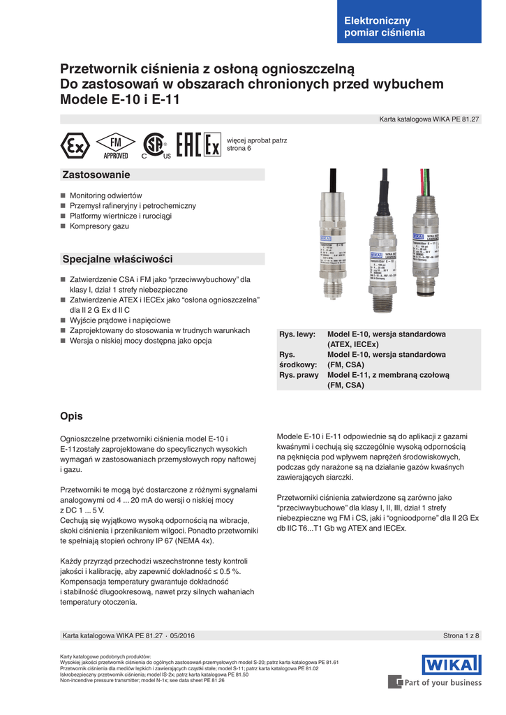 Elektroniczny pomiar ciśnienia Przetwornik ciśnienia z osłoną ognioszczelną Do zastosowań w obszarach chronionych przed wybuchem Modele E-10 i E-11 Karta katalogowa WIKA PE 81.27 więcej aprobat patrz strona 6 Zastosowanie ■■ Monitoring odwiertów ■■ Przemysł rafineryjny i petrochemiczny ■■ Platformy wiertnicze i rurociągi ■■ Kompresory gazu Specjalne właściwości ■■ Zatwierdzenie CSA i FM jako “przeciwwybuchowy” dla klasy I, dział 1 strefy niebezpieczne ■■ Zatwierdzenie ATEX i IECEx jako “osłona ognioszczelna” dla II 2 G Ex d II C ■■ Wyjście prądowe i napięciowe ■■ Zaprojektowany do stosowania w trudnych warunkach ■■ Wersja o niskiej mocy dostępna jako opcja Rys. lewy: Rys. środkowy: Rys. prawy Model E-10, wersja standardowa (ATEX, IECEx) Model E-10, wersja standardowa (FM, CSA) Model E-11, z membraną czołową (FM, CSA) Opis Ognioszczelne przetworniki ciśnienia model E-10 i E-11zostały zaprojektowane do specyficznych wysokich wymagań w zastosowaniach przemysłowych ropy naftowej i gazu. Przetworniki te mogą być dostarczone z różnymi sygnałami analogowymi od 4 ... 20 mA do wersji o niskiej mocy z DC 1 ... 5 V. Cechują się wyjątkowo wysoką odpornością na wibracje, skoki ciśnienia i przenikaniem wilgoci. Ponadto przetworniki te spełniają stopień ochrony IP 67 (NEMA 4x). Modele E-10 i E-11 odpowiednie są do aplikacji z gazami kwaśnymi i cechują się szczególnie wysoką odpornością na pęknięcia pod wpływem naprężeń środowiskowych, podczas gdy narażone są na działanie gazów kwaśnych zawierających siarczki. Przetworniki ciśnienia zatwierdzone są zarówno jako “przeciwwybuchowe” dla klasy I, II, III, dział 1 strefy niebezpieczne wg FM i CS, jaki i “ognioodporne” dla II 2G Ex db IIC T6...T1 Gb wg ATEX and IECEx. Każdy przyrząd przechodzi wszechstronne testy kontroli jakości i kalibrację, aby zapewnić dokładność ≤ 0.5 %. Kompensacja temperatury gwarantuje dokładność i stabilność długookresową, nawet przy silnych wahaniach temperatury otoczenia. Karta katalogowa WIKA PE 81.27 ∙ 05/2016 Karty katalogowe podobnych produktów: Wysokiej jakości przetwornik ciśnienia do ogólnych zastosowań przemysłowych model S-20; patrz karta katalogowa PE 81.61 Przetwornik ciśnienia dla mediów lepkich i zawierających cząstki stałe; model S-11; patrz karta katalogowa PE 81.02 Iskrobezpieczny przetwornik ciśnienia; model IS-2x; patrz karta katalogowa PE 81.50 Non-incendive pressure transmitter; model N-1x; see data sheet PE 81.26 Strona 1 z 8 Zakresy pomiarowe Ciśnienie względne bar Zakres pomiarowy 0 ... 0.4 0 ... 0.6 0 ... 1 0 ... 1.6 0 ... 2.5 0 ... 4 Zakres pomiarowy 0 ... 6 0 ... 10 0 ... 16 0 ... 25 0 ... 40 0 ... 60 Zakres pomiarowy 0 ... 100 0 ... 160 0 ... 250 0 ... 400 0 ... 600 Dopuszczalne przeciążenie Dopuszczalne przeciążenie psi 3.1 31 62 14 80 120 0 ... 1,000 1) 2) 500 800 1,200 Zakres pomiarowy 0 ... 5 0 ... 10 0 ... 15 0 ... 25 0 ... 30 0 ... 60 Zakres pomiarowy 0 ... 100 0 .. 160 0 ... 200 0 ... 250 0 ... 300 0 ... 500 Zakres pomiarowy 0 ... 600 0 ... 750 0 ... 1,000 0 ... 1,500 0 ... 2,000 0 ... 3,000 Zakres pomiarowy 0 ... 5,000 0 ... 8,000 2) 0 ... 10,000 1) 0 ... 15,000 1) Dopuszczalne przeciążenie Dopuszczalne przeciążenie Ciśnienie absolutne Zakres pomiarowy Dopuszczalne przeciążenie Zakres pomiarowy 45 449 1,160 11,600 45 899 1,740 17,400 0 ... 0.4 2 89 899 1,740 17,400 0 ... 0.6 4 899 2,900 0 ... 1 0 ... 1.6 5 10 0 ... 16 Zakres pomiarowy 0 ... 15 0 ... 25 0 ... 30 0 ... 60 -1 ... 0 -1 ... +0.6 145 240 -1 ... +1.5 -1 ... +3 2 4 5 Zakres pomiarowy -1 ... +9 -1 ... +15 -1 ... +25 Zakres pomiarowy -30 inHg ... 0 -30 inHg ... +30 -30 inHg ... +60 35 Dopuszczalne przeciążenie 29 Zakres pomiarowy -30 inHg ... +300 Dopuszczalne przeciążenie 35 145 0 ... 2.5 10 80 Dopuszczalne przeciążenie Dopuszczalne przeciążenie 7,200 21,750 0 ... 10 Zakres pomiarowy 1,160 4,600 35 145 203 899 35 72 0 ... 6 1,500 89 17 Dopuszczalne przeciążenie 0 ... 4 45 Dopuszczalne przeciążenie Zakresy pomiarowe +/- psi 62 6.2 320 1) Zakres pomiarowy nie dla modelu E-11. 2) Zakres pomiarowy nie dla modelu E-11 z aprobatą FM i CSA. bar 6.2 200 Dopuszczalne przeciążenie psi 31 3.1 Dopuszczalne przeciążenie Dopuszczalne przeciążenie bar 3.1 0 ... 100 500 -1 ... +5 10 17 -30 inHg ... +100 -30 inHg ... +200 50 240 500 1,160 1,160 Podane zakresy pomiarowe dostępne są także w mbar, MPa, kPa, kg/cm2 i innych jednostkach. Szczelność próżniowa Tak Strona 2 z 8 Karta katalogowa WIKA PE 81.27 ∙ 05/2016 Sygnały wyjściowe Wersje do wyboru Rodzaj sygnału Specyfikacje dokładności Sygnał Prądowy (2-przewodowy) 4 ... 20 mA Napięciowy (3-przewodowy) DC 0 ... 5 V DC 0.5 ... 4.5 V: DC 1 ... 5 V (niska moc) DC 0 ... 10 V Obciążenie w Ω 4 ... 20 mA: ≤ (zasilanie - 10 V) / 0.02 A DC 0 ... 5 V: > max. sygnał wyjściowy / 1 mA DC 0.5 ... 4.5 V: > 100k DC 1 ... 5 V > 100k DC 0 ... 10 V: > max. sygnał wyjściowy / 1 mA Zasilanie napięciowe Zasilanie Zasilanie zależy od rodzaju wybranego sygnału wyjściowego. 4 ... 20 mA: DC 10 ... 30 V DC 0 ... 5 V: DC 10 ... 30 V DC 0.5 ... 4.5 V: DC 5 ... 30 V DC 1 ... 5 V: DC 6 ... 30 V DC 0 ... 10 V: DC 14 ... 30 V Dokładność w warunkach odniesienia 0.5 % zakresu bejmuje nieliniowość, histerezę, zero offset i odchylenie O końcowej wartości (odpowiada błędowi pomiarowemu wg IEC 61298-2). Nieliniowość (wg IEC 61298-2) ≤ 0.2 % zakresu BFSL Niepowtarzalność ≤ 0.1 % zakresu Błąd temperaturowy w zakresie 0 ... 80 °C (32 ... 176 °F) Średni współczynnik temperatury punktu zero: ≤ 0.2 % zakresu/10 K Średni współczynnik temperatury zakresu: ≤ 0.2 % zakresu/10 K Czas ustalania ≤ 2 ms ≤ 10 ms (przy temperaturze medium < -30 °C i zakresie pomiarowym ≤ 0 ... 25 bar; dla modelu E-11) Stabilność długookresowa ≤ 0.2 % zakresu/rok Max. pobór prądu 1W Warunki odniesienia (wg IEC 61298-1) Tempera