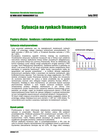 Komentarz Doradców Inwestycyjnych BZ WBK ASSET MANAGEMENT S.A. Luty 2012 Sytuacja na rynkach finansowych Papiery dłuŜne : fundusze z udziałem papierów dłuŜnych Sytuacja międzynarodowa Rynek polski Publikowane w lutym informacje statystyczne potwierdzają poprawę sytuacji w przemyśle. Styczeń był bardzo udany dla polskich przedsiębiorstw. Wielkość produkcji firm przetwórczych wzrosła o 9% w stosunku do stycznia 2011. Jeszcze większa była dynamika budownictwa: +32%. NaleŜy jednak zauwaŜyć, Ŝe pogoda w styczniu wyjątkowo sprzyjała produkcji, zwłaszcza budowlanej. Wzrost wielkości funduszu płac w przedsiębiorstwach o 9% (rok do roku) w duŜym stopniu spowodowany był wypłatami premii w górnictwie. Dynamika zatrudnienia obniŜyła się do 0,9%. W ciągu kilku miesięcy strona 1 z 5 rentowność obligacji Obl. USA 2012-02 2011-12 2011-10 2011-08 2011-06 2011-04 4,0% 3,5% 3,0% 2,5% 2,0% 1,5% 1,0% 2011-02 Luty przyniósł osłabienie cen na największych światowych rynkach długu. W przeciągu całego miesiąca rentowność amerykańskich 10latek wzrosła z 1,80% do 1,94%, a 10-letnich Bundów wzrosła z 1,79% do 1,82%. Europejscy inwestorzy spędzili miniony miesiąc na oczekiwaniu. Oczekiwania dotyczyły wydarzeń toczących się w Grecji czyli ustalenia warunków redukcji zadłuŜenia Grecji wobec prywatnych obligatariuszy oraz przyznania Grecji tury pomocy finansowej. Wraz ze zbliŜaniem się końca miesiąca coraz więcej uwagi poświęcano drugiej operacji LTRO (Longer Term Refinancing Operations). Zasilenie banków w gotówkę na okres 3 lat przez ECB po raz drugi przyniosło istotne zwiększenie ilości pieniądza w systemie bankowym. Jakie kwoty rzeczywiście trafią do gospodarki nie sposób przewidzieć – w krótkim okresie większość poŜyczonych pieniędzy trafia z powrotem do banków centralnych, jako krótkoterminowy depozyt. Tym niemniej nie ulega wątpliwości, Ŝe LTRO istotnie zmniejsza ryzyko finansowe banków (nie będą one zmuszone do szukania płynności na rynku) a takŜe przekłada się na spadek rentowności (wzrost cen) obligacji krajów południa Europy (Włoch i Hiszpanii). Działają tu dwa mechanizmy: po pierwsze lepsza sytuacja płynnościowa banków z tych krajów oznacza mniejsze ryzyko zmasowanej podaŜy obligacji skarbowych z ich strony oraz zmniejszenie ryzyka konieczności wsparcia sektora finansowego przez państwa, po drugie, część ze środków poŜyczonych (tanio) z ECB jest wykorzystywana przez banki do zakupu obligacji o wyŜszej rentowności (w tym szczególnie wspomnianych wcześniej włoskich i hiszpańskich). W lutym miało miejsce umocnienie wspólnej waluty względem dolara. W przeciągu całego miesiąca kurs euro wzrósł z 1,307 do 1,336 dolara. To umocnienie euro wynika z poprawy nastrojów na światowych rynkach. Bund Komentarz Doradców Inwestycyjnych BZ WBK Asset Management SA Inflacja (CPI) 2011-09 2012-01 2011-12 2012-02 2011-12 2012-02 2011-05 2011-01 2010-09 2010-05 2010-01 6% 5% 4% 3% 2% 1% 0% kurs EUR 2011-10 2011-08 2011-06 2011-04 4,50 4,40 4,30 4,20 4,10 4,00 3,90 3,80 2011-02 okaŜe się w jaki sposób przedsiębiorstwa zareagują na wzrost składki rentowej. Oczekujemy dalszego spadku dynamiki zatrudnienia. Inflacja roczna CPI w styczniu wyniosła 4,1% rok do roku, wobec 4,6% w grudniu. Jednak w skali miesiąca ceny wzrosły o 0,7%. Spadek rocznej dynamiki cen wynika z efektu bazy. W styczniu 2011 r. ceny wzrosły aŜ o 1,2% w skali miesiąca za sprawą podwyŜki podatku VAT. Nadal nie mamy podstaw, aby oczekiwać zmian polityki pienięŜnej RPP. Dopóki inflacja utrzymuje się na podwyŜszonym poziomie nie moŜna spodziewać się obniŜki stóp. Rachityczny wzrost gospodarczy w strefie euro, który przekłada się teŜ na koniunkturę w Polsce wyklucza ewentualność podwyŜki. Utrzymanie wysokiej skłonności do ryzyka i związany z tym napływ kapitału do rynków wschodzących (w tym Polski) przełoŜył się na wzrost kursu polskiej waluty. W stosunku do złotego dolar amerykański stracił 4%, a euro 2,1%. Czynniki lokalne miały drugorzędne znaczenie. Luty przyniósł takŜe dalsze umocnienie obligacji na polskim rynku. Rentowność obligacji 10-letnich spadła z 5,56% do 5,46%, pięciolatek z 4,98% do 4,89%, a dwulatek z 4,69% do 4,65%. Nadal głównym czynnikiem wspierającym popyt była poprawa nastrojów na globalnych rynkach finansowych i poszukiwanie inwestycji o wyŜszym poziomie ryzyka i potencjalnie wyŜszej dochodowości. Podobnie jak w poprzednim miesiącu, popyt koncentrował się na obligacjach o terminie zapadalności bliskim 10 lat – są to instrumenty szczególnie „lubiane” przez inwestorów zagranicznych. kurs USD 3,40 3,20 3,00 2,80 2011-10 2011-08 2011-06 2011-04 2011-02 2,60 rentowność obligacji 6,0% 5,5% 5,0% 4,5% 4,0% 2-letnie 5-letnie 10-letnie 2011-01-31 Rynek akcji: fundusze z udziałem akcji Sytuacja międzynarodowa Luty by kolejnym dobrym miesiącem na giełdach, aczkolwiek nie tak mocnym jak styczeń. Indeks globalny MSCI World wzrósł o 4,8%, Europejski Stoxx50 4,0%, S&P500 o 4,1%. Indeks krajów rozwijających się MSCI Emerging Markets w lutym wzrósł nieco silniej, bo o 5,9%. Najsilniejszy był japoński Nikkei 225, który wzrósł o 10,5%, ale strona 2 z 5 2011-02-29 Komentarz Doradców Inwestycyjnych BZ WBK Asset Management SA MSCI AC World 350 330 310 290 2012-02 2011-12 2011-10 2011-08 2011-06 2011-04 2011-02 270 S&P 500 1 350 1 250 1 150 2012-02 2011-12 2011-10 2011-08 2011-06 2011-04 1 050 2011-02 tylko w lokalnej walucie (w ujęciu dolarowym wynik był porównywalny z S&P 500). Luty zdominowały informacje na temat drugiego pakietu pomocowego dla Grecji, w kwocie 130 mld EUR, który ostatecznie przyjęto pod koniec miesiąca. Istotnym elementem w rozwiązywaniu problemu Grecji, oprócz reform strukturalnych, jest program redukcji zadłuŜenia. Kluczowy jest udział sektora prywatnego. Pod koniec miesiąca Grecja złoŜyła obligatariu
