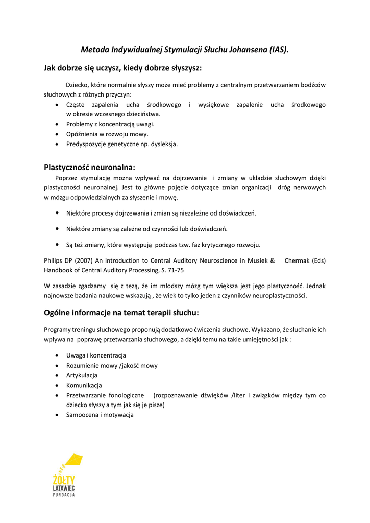 Metoda Indywidualnej Stymulacji Słuchu Johansena (IAS). Jak dobrze się uczysz, kiedy dobrze słyszysz: Dziecko, które normalnie słyszy może mieć problemy z centralnym przetwarzaniem bodźców słuchowych z różnych przyczyn: Częste zapalenia ucha środkowego i wysiękowe zapalenie ucha środkowego w okresie wczesnego dzieciństwa. Problemy z koncentracją uwagi. Opóźnienia w rozwoju mowy. Predyspozycje genetyczne np. dysleksja. Plastyczność neuronalna: Poprzez stymulację można wpływać na dojrzewanie i zmiany w układzie słuchowym dzięki plastyczności neuronalnej. Jest to główne pojęcie dotyczące zmian organizacji dróg nerwowych w mózgu odpowiedzialnych za słyszenie i mowę. Niektóre procesy dojrzewania i zmian są niezależne od doświadczeń. Niektóre zmiany są zależne od czynności lub doświadczeń. Są też zmiany, które występują podczas tzw. faz krytycznego rozwoju. Philips DP (2007) An introduction to Central Auditory Neuroscience in Musiek & Handbook of Central Auditory Processing, S. 71-75 Chermak (Eds) W zasadzie zgadzamy się z tezą, że im młodszy mózg tym większa jest jego plastyczność. Jednak najnowsze badania naukowe wskazują , że wiek to tylko jeden z czynników neuroplastyczności. Ogólne informacje na temat terapii słuchu: Programy treningu słuchowego proponują dodatkowo ćwiczenia słuchowe. Wykazano, że słuchanie ich wpływa na poprawę przetwarzania słuchowego, a dzięki temu na takie umiejętności jak : Uwaga i koncentracja Rozumienie mowy /jakość mowy Artykulacja Komunikacja Przetwarzanie fonologiczne (rozpoznawanie dźwięków /liter i związków między tym co dziecko słyszy a tym jak się je pisze) Samoocena i motywacja Metoda Indywidualnej Stymulacji Słuchu Johansena (IAS): Stworzona przez dr Kjelda Johansena – duńskiego nauczyciela i psychologa. Oparta na specjalnie skomponowanej i wykonywanej na syntetyzatorze muzyce. Słuchana w domu lub w szkole poprzez słuchawki przez 10 minut dziennie. Postępy są kontrolowane co 4-10 tygodni (w zależności od wieku ), wtedy podejmowane są decyzje o przejściu na następny etap terapii w formie kolejnej płyty CD. Cały program stymulacji trwa 6-18 miesięcy – dzieci najczęściej potrzebują 9-10 miesięcy. Cechy charakterystyczne dla Indywidualnej Stymulacji Słuchu Johansena (IAS): Muzyka w metodzie Johansena IAS jest specjalnie skomponowana, aby obejmować swoim zakresem różne częstotliwości potrzebne do stymulacji. Dla pacjenta tworzy się indywidualną płytę CD, która będzie odpowiadała wyłącznie jego profilowi słuchowemu. Każde dziecko otrzymuje indywidualny program , który będzie najlepiej pasował do jego możliwości słuchowych i możliwości do nauki. Można to uzyskać poprzez wybór odpowiedniego CD lub indywidualnie przygotowanej CD. Metoda Indywidualnej Stymulacji Słuchu Johansena (IAS)- muzyka: Mowa i muzyka składają się z szerokiego zakresu częstotliwości dźwięków. W metodzie Indywidualnej Stymulacji Słuchu Johansena (IAS) – muzyka jest specjalnie skomponowana, aby stymulować po kolei różne częstotliwości. Stosuje się 7 bazowych płyt CD, nazwanych Waves CD. Indywidualne płyty CD nagrywane są z muzyki znajdującej się na Waves CD w różnych kombinacjach. Mogą być dodatkowo wzbogacone o specjalne efekty, o których wiemy, że stymulują różne aspekty słuchania. Waves 1- 7 od 100Hz do 8000Hz:Waves 1 © Johansen IAS 2008 © Hansen-Lauff & Sanne Deutschland 2008 © Rychetsky, Poland 2009 Terapeuci - Johansen IAS są szkoleni tak, aby mogli wykonać badanie słuchu i słuchania. Do nich należy badanie jak pacjent reaguje na poszczególne częstotliwości, jak wygląda współpraca obu uszu i określenie z której strony dziecko słyszy dźwięk. Kiedy występuje podejrzenie niedosłuchu należy skierować pacjenta do odpowiedniego specjalisty. Jeśli u osoby badanej stwierdzono, że niektóre częstotliwości są słabiej lub szybciej odbierane niż inne, jest to wykorzystane, aby stworzyć indywidualną muzykę na CD. Badanie słuchu -jeśli krzywa słuchowa przebiega zdecydowanie poniżej 20 dB, należy pacjenta skierować do specjalisty. © Johansen IAS 2008 © Hansen-Lauff & Sanne Deutschland 2008 © Rychetsky, Poland 2009 Decyzja o terapii Johansen IAS opiera się na obserwacjach, które spodziewamy się osiągnąć podczas trwania terapii. Informacje z badania audiometrycznego umożliwiają opracowanie precyzyjnego programu stymulacji, który jest bardzo dokładnie wymierzony na konkretne problemy z przetwarzaniem słuchowym. Johansen IAS - CD są ukierunkowane na poszczególne częstotliwości krok po kroku, aby uniknąć przeciążenia i błędów. Johansen Indywidualna Stymulacja Słuchu (IAS) program stymulacji: Johansen CD są słuchane za pomocą słuchawek . Normalnie ,jeśli prawe ucho jest dominujące, to sygnał do prawego ucha jest mocniejszy . W ten sposób można wywoływać preferencje i dominacje prawego ucha, która jest prawie u wszystkich praworęcznych i u większości leworęcznych stwierdzona . Dokładne badanie lateralizacji to bardzo ważny element diagnozy Johansen IAS. Wzmocnienie prawego ucha można cofnąć aby jednakowy sygnał skierować do obu uszu zwłaszcza u młodszych dzieci i u niektórych leworęcznych . Dalsze informacje: www.hoertraining-ias.de i www.johansen-ias.pl Provider Elżbieta Wilczyńska