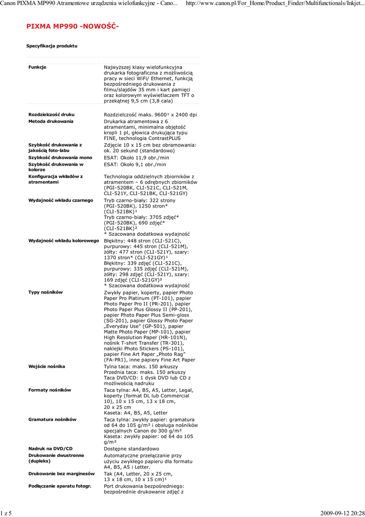 Canon PIXMA MP990 Atramentowe urządzenia wielofunkcyjne - Cano... 1z5 http://www.canon.pl/For_Home/Product_Finder/Multifunctionals/Inkjet... PIXMA MP990 -NOWOŚĆSpecyfikacja produktu Funkcje Najwyższej klasy wielofunkcyjna drukarka fotograficzna z możliwością pracy w sieci WiFi/ Ethernet, funkcją bezpośredniego drukowania z filmu/slajdów 35 mm i kart pamięci oraz kolorowym wyświetlaczem TFT o przekątnej 9,5 cm (3,8 cala) Rozdzielczość druku Rozdzielczość maks. 9600¹ x 2400 dpi Drukarka atramentowa z 6 atramentami, minimalna objętość kropli 1 pl, głowica drukująca typu FINE, technologia ContrastPLUS Zdjęcie 10 x 15 cm bez obramowania: ok. 20 sekund (standardowo) ESAT: Około 11,9 obr./min ESAT: Około 9,1 obr./min Metoda drukowania Szybkość drukowania z jakością foto-labu Szybkość drukowania mono Szybkość drukowania w kolorze Konfiguracja wkładów z atramentami Wydajność wkładu czarnego Wydajność wkładu kolorowego Typy nośników Wejście nośnika Formaty nośników Gramatura nośników Nadruk na DVD/CD Drukowanie dwustronne (dupleks) Drukowanie bez marginesów Podłączanie aparatu fotogr. Technologia oddzielnych zbiorników z atramentem – 6 odrębnych zbiorników (PGI-520BK, CLI-521C, CLI-521M, CLI-521Y, CLI-521BK, CLI-521GY) Tryb czarno-biały: 322 strony (PGI-520BK), 1250 stron* (CLI-521BK)¹ Tryb czarno-biały: 3705 zdjęć* (PGI-520BK), 690 zdjęć* (CLI-521BK)² * Szacowana dodatkowa wydajność Błękitny: 448 stron (CLI-521C), purpurowy: 445 stron (CLI-521M), żółty: 477 stron (CLI-521Y), szary: 1370 stron* (CLI-521GY)¹ Błękitny: 339 zdjęć (CLI-521C), purpurowy: 335 zdjęć (CLI-521M), żółty: 298 zdjęć (CLI-521Y), szary: 169 zdjęć (CLI-521GY)² * Szacowana dodatkowa wydajność Zwykły papier, koperty, papier Photo Paper Pro Platinum (PT-101), papier Photo Paper Pro II (PR-201), papier Photo Paper Plus Glossy II (PP-201), papier Photo Paper Plus Semi-gloss (SG-201), papier Glossy Photo Paper „Everyday Use” (GP-501), papier Matte Photo Paper (MP-101), papier High Resolution Paper (HR-101N), nośnik T-shirt Transfer (TR-301), naklejki Photo Stickers (PS-101), papier Fine Art Paper „Photo Rag” (FA-PR1), inne papiery Fine Art Paper Tylna taca: maks. 150 arkuszy Przednia taca: maks. 150 arkuszy Taca DVD/CD: 1 dysk DVD lub CD z możliwością nadruku Taca tylna: A4, B5, A5, Letter, Legal, koperty (format DL lub Commercial 10), 10 x 15 cm, 13 x 18 cm, 20 x 25 cm Kaseta: A4, B5, A5, Letter Taca tylna: zwykły papier: gramatura od 64 do 105 g/m² i obsługa nośników specjalnych Canon do 300 g/m² Kaseta: zwykły papier: od 64 do 105 g/m² Dostępne standardowo Automatyczne przełączanie przy użyciu zwykłego papieru dla formatu A4, B5, A5 i Letter. Tak (A4, Letter, 20 x 25 cm, 13 x 18 cm, 10 x 15 cm)¹ Port drukowania bezpośredniego: bezpośrednie drukowanie zdjęć z aparatów i kamer zgodnych ze 2009-09-12 20:28 Canon PIXMA MP990 Atramentowe urządzenia wielofunkcyjne - Cano... 2z5 Drukowanie z karty pamięciowej Inne Funkcje Typ skanera Skanowanie filmu Optyczna rozdzielczość skanowania Rozdzielczość interpolowana Głębia koloru Półtony/Odcienie szarości Kompatybilność Efektywna szerokość skanowania http://www.canon.pl/For_Home/Product_Finder/Multifunctionals/Inkjet... aparatów i kamer zgodnych ze standardem PictBridge Pamięć USB Flash, CompactFlash, Microdrive, Memory Stick, Memory Stick Pro, Memory Stick Duo, Memory Stick PRO Duo, SD Memory Card, SDHC Memory Card, MultiMedia Card (wersja 4.1) i MultiMedia Card Plus (wersja 4.1). xD-PictureCard¹, xD-PictureCard Type M¹, xD-PictureCard Type H¹, Memory Stick Micro¹, RS-MMC¹, mini SD Card¹, micro SD¹, mini SDHC Card¹ i micro SDHC¹. Funkcje: Drukowanie z wielokrotnym wyborem (wybór wielu obrazów i określonej liczby poszczególnych obrazów), drukowanie indeksu zdjęć, drukowanie wszystkich zdjęć, drukowanie DPOF, drukowanie układu, drukowanie naklejek, drukowanie informacji o zdjęciu, arkusz indeksu zdjęć, drukowanie kalendarzy, drukowanie zdjęć legitymacyjnych, wyszukiwanie według daty, pokaz slajdów, drukowanie numeru pliku i daty, drukowanie bez obramowania Poprawa obrazów w przypadku bezpośredniego drukowania z karty: funkcja Auto Photo Fix II, funkcja Vivid Photo, funkcja Photo Optimizer PRO, redukcja szumów, rozjaśnianie twarzy, jasność, kontrast, barwy (barwy skóry), sepia/symulacja ilustracji, redukcja efektu czerwonych oczu, funkcja Image Optimizer, kadrowanie Photo Optimizer PRO (tylko system Windows), Image Optimizer (tylko system Windows), Photo Noise Reduction, Vivid Photo, symulacja ilustracji, efekty monochromatyczne, szablony Płaski skaner kolorowy CCD z przystawką do skanowania filmów. Przystawka do skanowania filmów (FAU) na klisze 6 x 35 mm (neg./poz.), slajdy 4 x 35 mm w ramce Rozdzielczość do 4800 x 9600 dpi Do 19200 x 19200 dpi 48/24 bity (RGB, każdy 16/8 bitów) (skanowanie filmu 48 bitów/48 bitów lub 24 bity) 48 bitów/8 bitów (zeskanowany film 48 bitów/16 lub 8 bitów) TWAIN/WIA (Windows XP/Windows Vista) A4/LTR Program OCR w komplecie dostawy Tak (MP Navigator EX) Inne Funkcje Skanowanie z przesyłaniem danych, automatyczny tryb skanowania, skanowanie do pamięci USB, tryb drukowania filmu, skanowanie do karty pamięci, skanowanie wielokrotne, tworzenie/edycja /zabezpieczenie hasłem pliku PDF*, usunięcie rastra, maskowanie nieostrości, panorama*, właściwa orientacja dokumentu, zapobieganie przebijaniu kolorów, właściwe nachylenie dokumentów, korekcje fotograficzne (korekcja wyblaknięcia, korekcja ziarna, redukcja kurzu i zarysowań, korekcja tylnego oświetlenia, automatyka tonacji), korekcja cienia, tekst (OCR) * Funkcja z programem MP Navigator 2009-09-12 20:28 Canon PIXMA MP990 Atramentowe urządzenia wielofunkcyjne - Cano... 3z5 http://www.canon.pl/For_Home/Product_Finder/Multifunctionals/Inkjet... * Funkcja z programem MP Navigator EX Kopie kolorowe/foto Szybkość kopiowania d