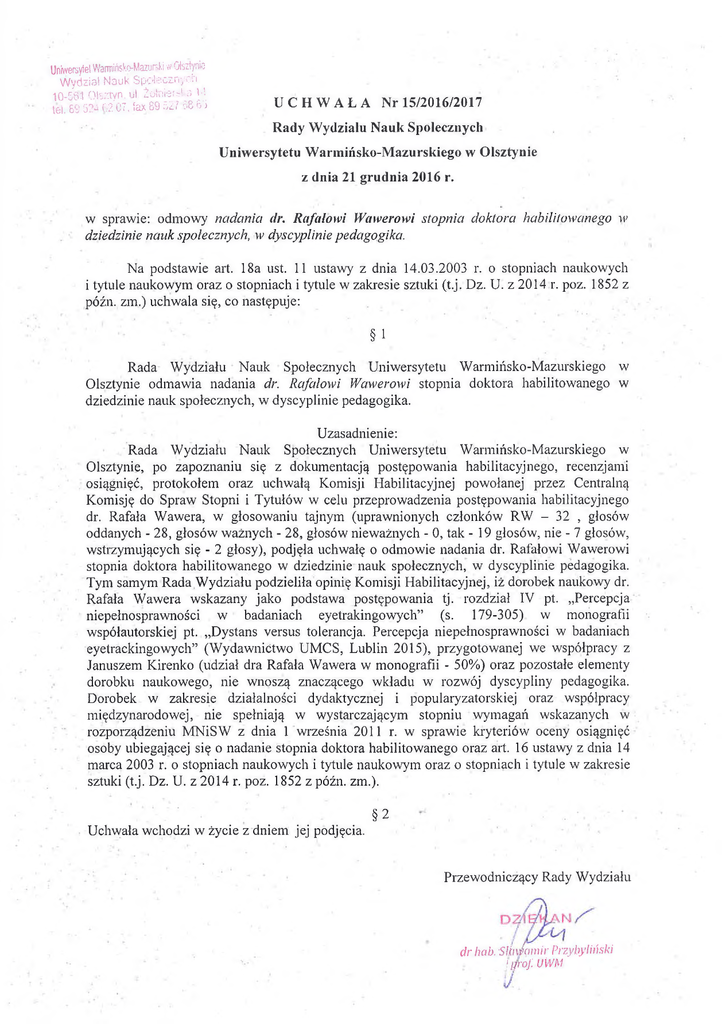 Uniwersytet Warmińsko-Mazurski wOlsztynie Wydział Nauk Społecznych 10-561 Olsztyn, ul. Źołnieri! a V! tel. 69 524 G2 07, fax 69 527 68 6'i U C H W A Ł A Nr 15/2016/2017 Rady Wydziału Nauk Społecznych Uniwersytetu Warmińsko-Mazurskiego w Olsztynie z dnia 21 grudnia 2016 r. w sprawie: odmowy nadania dr. Rafałowi Wawerowi stopnia doktora habilitowanego w dziedzinie nauk społecznych, w dyscyplinie pedagogika. Na podstawie art. 18a ust. 11 ustawy z dnia 14.03.2003 r. o stopniach naukowych i tytule naukowym oraz o stopniach i tytule w zakresie sztuki (t.j. Dz. U. z 2014 r. poz. 1852 z późn. zm.) uchwala się, co następuje: § 1 Rada Wydziału Nauk Społecznych Uniwersytetu Warmińsko-Mazurskiego w Olsztynie odmawia nadania dr. Rafałowi Wawerowi stopnia doktora habilitowanego w dziedzinie nauk społecznych, w dyscyplinie pedagogika. Uzasadnienie: Rada Wydziału Nauk Społecznych Uniwersytetu Warmińsko-Mazurskiego w Olsztynie, po zapoznaniu się z dokumentacją postępowania habilitacyjnego, recenzjami osiągnięć, protokołem oraz uchwałą Komisji Habilitacyjnej powołanej przez Centralną Komisję do Spraw Stopni i Tytułów w celu przeprowadzenia postępowania habilitacyjnego dr. Rafała Wawera, w głosowaniu tajnym (uprawnionych członków RW - 32 , głosów oddanych - 28, głosów ważnych - 28, głosów nieważnych - 0, tak - 19 głosów, nie - 7 głosów, wstrzymujących się - 2 głosy), podjęła uchwałę o odmowie nadania dr. Rafałowi Wawerowi stopnia doktora habilitowanego w dziedzinie nauk społecznych, w dyscyplinie pedagogika. Tym samym Rada Wydziału podzieliła opinię Komisji Habilitacyjnej, iż dorobek naukowy dr. Rafała Wawera wskazany jako podstawa postępowania tj. rozdział IV pt. „Percepcja niepełnosprawności w badaniach eyetrakingowych” (s. 179-305) w monografii współautorskiej pt. „Dystans versus tolerancja. Percepcja niepełnosprawności w badaniach eyetrackingowych” (Wydawnictwo UMCS, Lublin 2015), przygotowanej we współpracy z Januszem Kirenko (udział dra Rafała Wawera w monografii - 50%) oraz pozostałe elementy dorobku naukowego, nie wnoszą znaczącego wkładu w rozwój dyscypliny pedagogika. Dorobek w zakresie działalności dydaktycznej i popularyzatorskiej oraz współpracy międzynarodowej, nie spełniają w wystarczającym stopniu wymagań wskazanych w rozporządzeniu MNiSW z dnia 1 września 2011 r. w sprawie kryteriów oceny osiągnięć osoby ubiegającej się o nadanie stopnia doktora habilitowanego oraz art. 16 ustawy z dnia 14 marca 2003 r. o stopniach naukowych i tytule naukowym oraz o stopniach i tytule w zakresie sztuki (t.j. Dz. U. z 2014 r. poz. 1852 z późn. zm.). §2 Uchwała wchodzi w życie z dniem jej podjęcia. Przewodniczący Rady Wydziału drhab. SłhJomir Przybyliński }prof. UWM