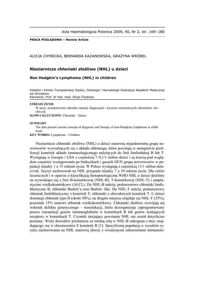Acta Haematologica Polonica 2009, 40, Nr 2, str. 169–180 PRACA POGLĄDOWA – Review Article ALICJA CHYBICKA, BERNARDA KAZANOWSKA, GRAśYNA WRÓBEL Nieziarnicze chłoniaki złośliwe (NHL) u dzieci Non Hodgkin’s Lymphoma (NHL) in children Katedra i Klinika Transplantacji Szpiku, Onkologii i Hematologii Dziecięcej Akademii Medycznej we Wrocławiu Kierownik: Prof. dr hab. med. Alicja Chybicka STRESZCZENIE W pracy przedstawiono aktualne metody diagnostyki i leczenia nieziarniczych chłoniaków złośliwych. SŁOWA KLUCZOWE: Chłoniaki – Dzieci SUMMARY The data prasent current concept of diagnosis and therapy of non-Hodgkins lymphoma in childhood. KEY WORDS: Lymphoma – Children Nieziarnicze chłoniaki złośliwe (NHL) u dzieci stanowią niejednorodną grupę nowotworów wywodzących się z układu chłonnego, które powstają w następstwie proliferacji komórek układu immunologicznego naleŜących do linii limfoidalnej B lub T. Występują w Europie i USA z częstością 7–9,1/1 milion dzieci i są trzecią pod względem częstości występowania po białaczkach i guzach OUN grupą nowotworów w populacji między 1 a 15 rokiem Ŝycia. W Polsce występują z częstością 11/1 milion dzieci/rok. Szczyt zachorowań na NHL przypada między 7 a 10 rokiem Ŝycia. Dla celów leczniczych i w oparciu o klasyfikację histopatologiczną WHO NHL u dzieci dzielimy na wywodzące się z linii B-komórkowej (NHL-B), T-komórkowej (NHL-T) i anaplastyczne wielkokomórkowe (ALCL). Do NHL-B naleŜą: prekursorowe chłoniaki limfoblastyczne B, chłoniaki Burkitt’a oraz Burkitt- like. Do NHL-T naleŜą: prekursorowy chłoniak limfoblastyczny z komórek T, chłoniaki z obwodowych komórek T. U dzieci dominuje chłoniak typu B (około 50%), na drugim miejscu znajduje się NHL-T (35%), pozostałe 15% stanowi chłoniak wielkokomórkowy. Chłoniaki złośliwe rozwijają się wskutek defektu genetycznego – translokacji, która dezorganizuje zaprogramowany proces rearanŜacji genów immunoglobulin w komórkach B lub genów kodujących receptory w komórkach T. Czynnik inicjujący powstanie NHL nie został dotychczas poznany. Wiele dowodów przemawia za istotną rolą w NHL-B onkogenu c-myc znajdującego się w chromosomie 8 komórek B [1]. Specyficzną populację o wysokim ryzyku zachorowania na NHL stanowią chorzy z wrodzonymi zaburzeniami immunolo- 170 A. CHYBICKA i wsp. gicznymi np. ataksja-teleangiektazja, zespół Wiskott-Aldricha oraz z nabytymi zespołami niedoborów odporności w następstwie immunosupresji potransplantacyjnej. Do czynników ryzyka naleŜy: leczenie dwufenylhydantoiną, napromienianie, chemioterapia stosowana w chorobie Hodgkina oraz zakaŜenia HIV i EBV. Podstawą rozpoznania NHL u dzieci jest badanie histopatologiczne fragmentu tkanki nowotworowej pobranej drogą biopsji operacyjnej z guza węzłowego lub pozawęzłowego. System klasyfikacji klinicznej nieziarniczego chłoniaka złośliwego opiera się na badaniu klinicznym, badaniach obrazowych i badaniach laboratoryjnych. Jego celem jest ocena stopnia zaawansowania nowotworu dla celów rokowniczych. Powszechnie przyjęty system klasyfikacji S. Murphy opiera się na dwóch kryteriach: miejscu pierwotnej lokalizacji guza i wielkości jego masy. Szczegóły klasyfikacji klinicznej zawarto w Tabeli 2. W chłoniakach typu B-komórkowego wyróŜniono następujące czynniki ryzyka: wstępna wartość stęŜenia dehydrogenazy mleczajowej (LDH), stopień zaawansowania klinicznego, zajęcie ośrodkowego układu nerwowego, zakres resekcji pierwotnego ogniska chorobowego. Na tej podstawie dzieci z NHL-B kwalifikuje się do 4 ramion terapeutycznych R1, R2, R3 i R4 wg Tabeli 3. W anaplastycznych chłoniakach wielkokomórkowych czynnikami wysokiego ryzyka są: zajęcie skóry, zmiany węzłowe w śródpiersiu, zajęcie wątroby, śledziony i/lub nacieki w tkance płucnej. Strategia leczenia chłoniaków u dzieci opiera się głównie na wielolekowej chemioterapii dostosowanej do postaci histopatologicznej, immunofenotypu, stopnia zaawansowania klinicznego oraz grupy ryzyka. Przy określaniu grupy ryzyka wykorzystuje się dotychczas poznane cechy kliniczne i biologiczne chłoniaków, np. wiek chorych, wstępną wartość LDH, zajęcie ośrodkowego układu nerwowego, liczbę blastów w szpiku, szybkość odpowiedzi na leczenie. Najlepsze wyniki w leczeniu NHL u dzieci uzyskuje się w chłoniakach z linii B-komórkowej, gdyŜ prawdopodobieństwo przeŜycia wolnego od choroby (EFS) szacuje się na 72–99%. W chłoniakach limfoblastycznych wartości EFS są niŜsze 70–80%, a główną przyczyną niepowodzeń są wczesne i lekooporne nawroty choroby. Tabela 1. Rodzaje rekomendowanych przeciwciał monoklonalnych dla poszczególnych podtypów NHL. Chłoniaki limfoblastyczny z linii T-komórkowej Podtyp Wszystkie pro T pre-T intermediate T dojrzały α/β + T δ/γ + T Marker Cytoplazmatyczny lub błonowy CD3 (+)., TdT (+), HLA-DR (–). i CD34 (–). CD7 (+). CD2 (+). I/lub CD5 (+). I/lub CD8 (+). CD1a (+). Błonowy CD3 (+)., CD1a (–). anti TCR α/β (+). anti TCR δ/γ (+). 2. Prekursorowy chłoniak limfoblastyczny z linii B Nieziarnicze chłoniaki złośliwe u dzieci Podtyp Wszystkie: 171 Marker CD19 (+). I/lub CD79a (+). I/lub CD22 (+). (co najmniej 2 z 3 +) TdT (+). i HLA-DR (+). Pro-B common-ALL type pre-B wszystkie: niektóre niektóre: na linię T w indywidualnych przypadkach wszystkie: Pierwotny chłoniak śródpiersia z linii B p-ciała pomocnicze: CD10 (+). Cytoplazmatyczne IgM (+), powierzchniowe -Ig (–) 1. Chłoniak wielkokomórkowy anaplastyczny: Marker CD 30 (+), EMA (+), ALK-1 (+), CD 15 (+,-), LCA(+), LMP-1 (–) lub EBER (–) CD 79A (+/-)i CD20 (+,-), CD3 (+) i CD43 (+) perforin, TIA1 i granzyme B CD2, CD4, CD5, CD7, CD8 i CD43/CBF78 MIB1 lub Ki-67 przeciwciało, BNH.9 Przeciwciało przeciwko komórkom dendrytycznym (CNA 42) 1. Chłoniak z dojrzałych komórek B: Marker Tdt(-), CD10(+), CD 20(+), IgM(+) CD 79a (+), CD 19