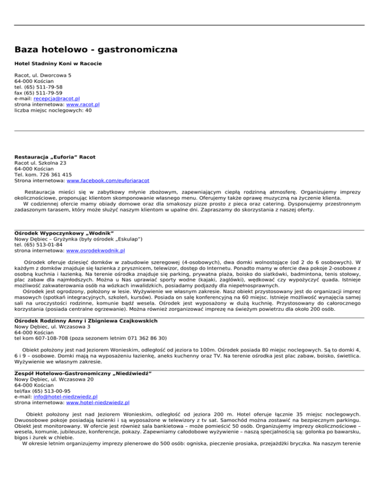 Baza hotelowo - gastronomiczna Hotel Stadniny Koni w Racocie Racot, ul. Dworcowa 5 64-000 Kościan tel. (65) 511-79-58 fax (65) 511-79-59 e-mail: [email protected] strona internetowa: www.racot.pl liczba miejsc noclegowych: 40 Restauracja „Euforia” Racot Racot ul. Szkolna 23 64-000 Kościan Tel. kom. 726 361 415 Strona internetowa: www.facebook.com/euforiaracot Restauracja mieści się w zabytkowy młynie zbożowym, zapewniającym ciepłą rodzinną atmosferę. Organizujemy imprezy okolicznościowe, proponując klientom skomponowanie własnego menu. Oferujemy także oprawę muzyczną na życzenie klienta. W codziennej ofercie mamy obiady domowe oraz dla smakoszy pizze prosto z pieca oraz catering. Dysponujemy przestronnym zadaszonym tarasem, który może służyć naszym klientom w upalne dni. Zapraszamy do skorzystania z naszej oferty. Ośrodek Wypoczynkowy „Wodnik” Nowy Dębiec – Gryżynka (były ośrodek „Eskulap”) tel. (65) 513-01-84 strona internetowa: www.osrodekwodnik.pl Ośrodek oferuje dziesięć domków w zabudowie szeregowej (4-osobowych), dwa domki wolnostojące (od 2 do 6 osobowych). W każdym z domków znajduje się łazienka z prysznicem, telewizor, dostęp do Internetu. Ponadto mamy w ofercie dwa pokoje 2-osobowe z osobną kuchnia i łazienką. Na terenie ośrodka znajduje się parking, prywatna plaża, boisko do siatkówki, badmintona, tenis stołowy, plac zabaw dla najmłodszych. Można u Nas uprawiać sporty wodne (kajaki, żaglówki), wędkować czy wypożyczyć quada. Istnieje możliwość zakwaterowania osób na wózkach inwalidzkich, posiadamy podjazdy dla niepełnosprawnych. Ośrodek jest ogrodzony, położony w lesie. Wyżywienie we własnym zakresie. Nasz obiekt przystosowany jest do organizacji imprez masowych (spotkań integracyjnych, szkoleń, kursów). Posiada on salę konferencyjną na 60 miejsc. Istnieje możliwość wynajęcia samej sali na uroczystości rodzinne, komunie bądź wesela. Ośrodek jest wyposażony w dużą kuchnię. Przystosowany do całorocznego korzystania (posiada centralne ogrzewanie). Można również zorganizować imprezę na świeżym powietrzu dla około 200 osób. Ośrodek Rodzinny Anny i Zbigniewa Czajkowskich Nowy Dębiec, ul. Wczasowa 3 64-000 Kościan tel kom 607-108-708 (poza sezonem letnim 071 362 86 30) Obiekt położony jest nad Jeziorem Wonieskim, odległość od jeziora to 100m. Ośrodek posiada 80 miejsc noclegowych. Są to domki 4, 6 i 9 – osobowe. Domki mają na wyposażeniu łazienkę, aneks kuchenny oraz TV. Na terenie ośrodka jest plac zabaw, boisko, świetlica. Wyżywienie we własnym zakresie. Zespół Hotelowo-Gastronomiczny „Niedźwiedź” Nowy Dębiec, ul. Wczasowa 20 64-000 Kościan tel/fax (65) 513-00-95 e-mail: [email protected] strona internetowa: www.hotel-niedzwiedz.pl Obiekt położony jest nad Jeziorem Wonieskim, odległość od jeziora 200 m. Hotel oferuje łącznie 35 miejsc noclegowych. Dwuosobowe pokoje posiadają łazienki i są wyposażone w telewizory z tv sat. Samochód można zostawić na bezpiecznym parkingu. Obiekt jest monitorowany. W ofercie jest również sala bankietowa – może pomieścić 50 osób. Organizujemy imprezy okolicznościowe – wesela, komunie, jubileusze, konferencje, pokazy. Zapewniamy całodobowe wyżywienie – naszą specjalnością są: golonka po bawarsku, bigos i żurek w chlebie. W okresie letnim organizujemy imprezy plenerowe do 500 osób: ogniska, pieczenie prosiaka, przejażdżki bryczka. Na naszym terenie posiadamy także pole namiotowe i campingowe z około 300 miejscami. Agroturystyka "Amazonka" Racot, ul. Kościańska 42 64-000 Kościan tel/fax (65) 513 14 22 tel. kom. 693 785 956 e-mail: [email protected] strona internetowa: www.reges.pl/agroamazonka.htm Powered by TCPDF (www.tcpdf.org)