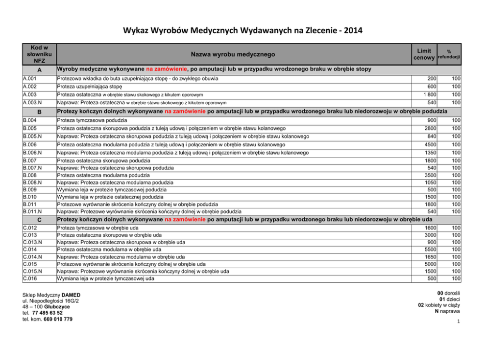 Wykaz Wyrobów Medycznych Wydawanych na Zlecenie - 2014 Kod w słowniku NFZ A Nazwa wyrobu medycznego % refundacji Wyroby medyczne wykonywane na zamówienie, po amputacji lub w przypadku wrodzonego braku w obrębie stopy A.001 Protezowa wkładka do buta uzupełniająca stopę - do zwykłego obuwia A.002 Proteza uzupełniająca stopę A.003 Proteza ostateczna w obrębie stawu skokowego z kikutem oporowym A.003.N Naprawa: Proteza ostateczna w obrębie stawu skokowego z kikutem oporowym B Limit cenowy 200 100 600 100 1 800 100 540 100 Protezy kończyn dolnych wykonywane na zamówienie po amputacji lub w przypadku wrodzonego braku lub niedorozwoju w obrębie podudzia B.004 Proteza tymczasowa podudzia 900 100 B.005 Proteza ostateczna skorupowa podudzia z tuleją udową i połączeniem w obrębie stawu kolanowego B.005.N Naprawa: Proteza ostateczna skorupowa podudzia z tuleją udową i połączeniem w obrębie stawu kolanowego 2800 100 840 100 B.006 Proteza ostateczna modularna podudzia z tuleją udową i połączeniem w obrębie stawu kolanowego 4500 100 B.006.N Naprawa: Proteza ostateczna modularna podudzia z tuleją udową i połączeniem w obrębie stawu kolanowego 1350 100 B.007 B.007.N B.008 B.008.N B.009 B.010 B.011 B.011.N Proteza ostateczna skorupowa podudzia Naprawa: Proteza ostateczna skorupowa podudzia Proteza ostateczna modularna podudzia Naprawa: Proteza ostateczna modularna podudzia Wymiana leja w protezie tymczasowej podudzia Wymiana leja w protezie ostatecznej podudzia Protezowe wyrównanie skrócenia kończyny dolnej w obrębie podudzia Naprawa: Protezowe wyrównanie skrócenia kończyny dolnej w obrębie podudzia 1800 540 3500 1050 500 1500 1800 540 100 100 100 100 100 100 100 100 C C.012 C.013 C.013.N C.014 C.014.N C.015 C.015.N C.016 Protezy kończyn dolnych wykonywane na zamówienie po amputacji lub w przypadku wrodzonego braku lub niedorozwoju w obrębie uda Proteza tymczasowa w obrębie uda Proteza ostateczna skorupowa w obrębie uda Naprawa: Proteza ostateczna skorupowa w obrębie uda Proteza ostateczna modularna w obrębie uda Naprawa: Proteza ostateczna modularna w obrębie uda Protezowe wyrównanie skrócenia kończyny dolnej w obrębie uda Naprawa: Protezowe wyrównanie skrócenia kończyny dolnej w obrębie uda Wymiana leja w protezie tymczasowej uda Sklep Medyczny DAMED ul. Niepodległości 16G/2 48 – 100 Głubczyce tel. 77 485 63 52 tel. kom. 669 010 779 1600 3000 900 5500 1650 5000 1500 500 100 100 100 100 100 100 100 100 00 dorośli 01 dzieci 02 kobiety w ciąży N naprawa 1 Wykaz Wyrobów Medycznych Wydawanych na Zlecenie - 2014 C.017 Wymiana leja w protezie ostatecznej uda 2000 100 D.020 E Protezy kończyn dolnych wykonywane na zamówienie po wyłuszczeniu w stawie biodrowym lub w przypadku wrodzonego braku lub niedorozwoju kończyny Proteza ostateczna skorupowa z koszem biodrowym po wyłuszczeniu w stawie biodrowym lub z krótkim kikutem wymagającym 6000 100 zaprotezowania z koszem biodrowym Naprawa: Proteza ostateczna skorupowa z koszem biodrowym po wyłuszczeniu w stawie biodrowym lub z krótkim kikutem wymagającym 1800 100 zaprotezowania z koszem biodrowym Proteza ostateczna modularna z koszem biodrowym po wyłuszczeniu w stawie biodrowym lub z krótkim kikutem wymagającym 7500 100 zaprotezowania z koszem biodrowym Naprawa: Proteza ostateczna modularna z koszem biodrowym po wyłuszczeniu w stawie biodrowym lub z krótkim kikutem wymagającym 2250 100 zaprotezowania z koszem biodrowym Wymiana kosza biodrowego po wyłuszczeniu w stawie biodrowym 2000 100 Protezy kończyn górnych wykonywane na zamówienie po amputacji lub w przypadku wrodzonego braku lub niedorozwoju w obrębie ręki E.021 E.021.N Proteza kosmetyczna w obrębie ręki Naprawa: Proteza kosmetyczna w obrębie ręki D D.018 D.018.N D.019 D.019.N F F.022 F.022.N F.023 F.023.N 800 240 100 100 Protezy kończyn górnych wykonywane na zamówienie po amputacji lub w przypadku wrodzonego braku lub niedorozwoju w obrębie przedramienia Proteza kosmetyczna w obrębie przedramienia 1200 Naprawa: Proteza kosmetyczna w obrębie przedramienia 360 Proteza robocza z końcówką roboczą w obrębie przedramienia 2800 Naprawa: Proteza robocza z końcówką roboczą w obrębie przedramienia 840 Protezy kończyn górnych wykonywane na zamówienie po amputacji lub w przypadku wrodzonego braku lub niedorozwoju w obrębie ramienia 100 100 100 100 G.024 G.024.N G.025 G.025.N G.026 G.026.N Proteza kosmetyczna w obrębie ramienia Naprawa: Proteza kosmetyczna w obrębie ramienia Proteza robocza z końcówką roboczą w obrębie ramienia Naprawa: Proteza robocza z końcówką roboczą w obrębie ramienia Proteza kosmetyczna całej kończyny górnej po wyłuszczeniu w obrębie stawu barkowego Naprawa: Proteza kosmetyczna całej kończyny górnej po wyłuszczeniu w obrębie stawu barkowego 2400 720 4000 1200 3000 900 100 100 100 100 100 100 G.027 Proteza robocza z końcówką roboczą całej kończyny górnej po wyłuszczeniu w obrębie stawu barkowego 4600 100 Naprawa: Proteza robocza z końcówką roboczą całej kończyny górnej po wyłuszczeniu w obrębie stawu barkowego 1380 100 400 90 G G.027.N H H.028.00 Ortezy kończyn dolnych wykonywane na zamówienie Orteza obejmująca goleń i stopę lub ze strzemieniem (typu AFO) - dla dorosłych Sklep Medyczny DAMED ul. Niepodległości 16G/2 48 – 100 Głubczyce tel. 77 485 63 52 tel. kom. 669 010 779 00 dorośli 01 dzieci 02 kobiety w ciąży N naprawa 2 Wykaz Wyrobów Medycznych Wydawanych na Zlecenie - 2014 H.028.00.N H.028.01 H.028.01.N H.029.00 Naprawa: Orteza obejmująca goleń i stopę lub ze strzemieniem (typu AFO) - dla dorosłych Orteza obejmująca goleń i stopę lub ze strzemieniem (typu AFO) - dla dzieci Naprawa: Orteza obejmująca goleń i stopę lub ze strzemieniem (typu AFO) - dla dzieci Orteza krótka korygująca zaburzenia osiowe w płaszczyźnie czołowej (typu DAFO lub GRAFO) -dorosłych 120 400 120 500 100 100 100 90 H.029.00.N H.029.01 Naprawa: O