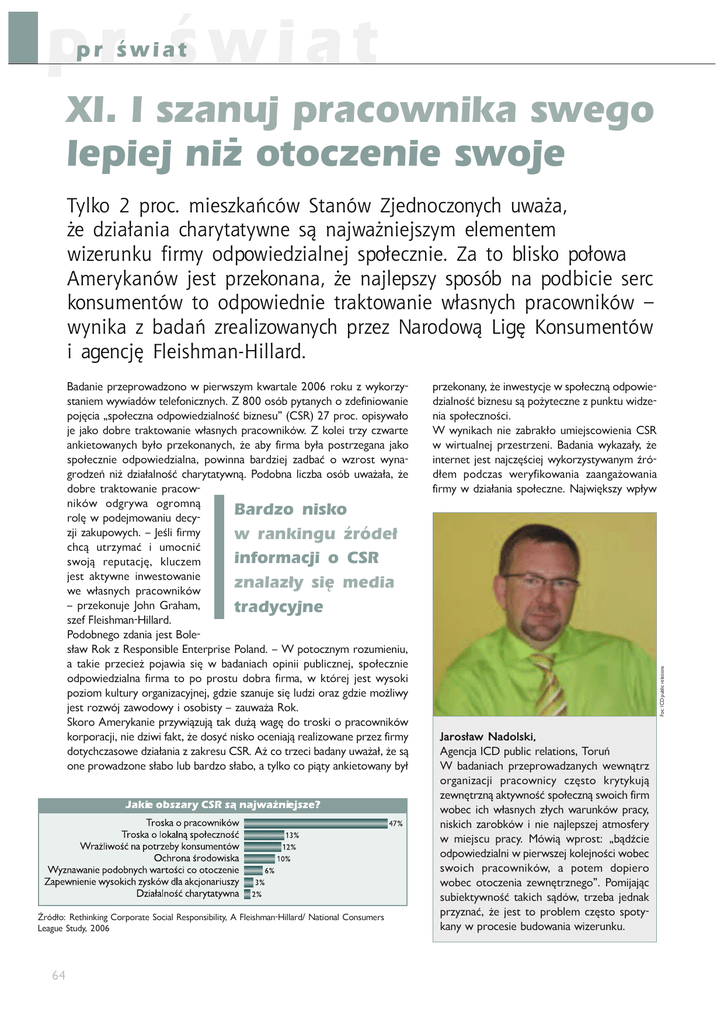 pr œwiat pr œwiat XI. I szanuj pracownika swego lepiej niż otoczenie swoje =bUTX Y[XL VRN\cTJĢLß` <]JWß` CSNMWXLcXWbLQ ^`JŖJ ŖN McRJũJWRJ LQJ[b]J]b`WN \ WJS`JŖWRNS\cbV NUNVNW]NV `RcN[^WT^ OR[Vb XMYX`RNMcRJUWNS \YXũNLcWRN CJ ]X KUR\TX YXũX`J *VN[bTJWß` SN\] Y[cNTXWJWJ ŖN WJSUNY\cb \YX\ßK WJ YXMKRLRN \N[L TXW\^VNW]ß` ]X XMYX`RNMWRN ][JT]X`JWRN `ũJ\WbLQ Y[JLX`WRTß` o `bWRTJ c KJMJĢ c[NJURcX`JWbLQ Y[cNc 7J[XMX` 5RP¢ 4XW\^VNW]ß` R JPNWLS¢ /UNR\QVJW1RUUJ[M ń]ÇOčZ% =P_STYVTYR .Z][Z]L_P >ZNTLW =P^[ZY^TMTWT_d , 1WPT^SXLY3TWWL]O 9L_TZYLW .ZY^`XP]^ 7PLR`P >_`Od ! ! []ePVZYLYdŇPTYbP^_dNUPb^[ZčPNeYÙZO[ZbTP OeTLWYZĦÛMTeYP^`^Ù[ZŇd_PNeYPe[`YV_`bTOeP YTL^[ZčPNeYZĦNT B bdYTVLNS YTP eLM]LVčZ `XTPU^NZbTPYTL .>= b bT]_`LWYPU []eP^_]ePYT -LOLYTL bdVLeLčd ŇP TY_P]YP_ UP^_ YLUNeíĦNTPU bdVZ]ed^_dbLYdX Ņ]Ç OčPX [ZONeL^ bP]dQTVZbLYTL eLLYRLŇZbLYTL QT]Xd b OeTLčLYTL ^[ZčPNeYP 9LUbTíV^ed b[čdb 1Z_%4./[`MWTN]PWL_TZY^ -LOLYTP []eP[]ZbLOeZYZ b [TP]b^edX VbL]_LWP ! ]ZV` e bdVZ]ed ^_LYTPXbdbTLOÇb_PWPQZYTNeYdNSE#Z^ÇM[d_LYdNSZeOPQTYTZbLYTP [ZUíNTLk^[ZčPNeYLZO[ZbTPOeTLWYZĦÛMTeYP^`u.>="[]ZNZ[T^dbLčZ UP ULVZ OZM]P _]LV_ZbLYTP bčL^YdNS []LNZbYTVÇb E VZWPT _]ed NebL]_P LYVTP_ZbLYdNS MdčZ []ePVZYLYdNS ŇP LMd QT]XL MdčL [Z^_]ePRLYL ULVZ ^[ZčPNeYTP ZO[ZbTPOeTLWYL [ZbTYYL ML]OeTPU eLOMLÛ Z be]Z^_ bdYL R]ZOePď YTŇ OeTLčLWYZĦÛ NSL]d_L_dbYÙ ;ZOZMYL WTNeML Z^ÇM `bLŇLčL ŇP OZM]P _]LV_ZbLYTP []LNZb YTVÇb ZOR]dbL ZR]ZXYÙ Bardzo nisko ]ZWí b [ZOPUXZbLYT` OPNd eUT eLV`[ZbdNS w 5PĦWT QT]Xd w rankingu źródeł NSNÙ `_]edXLÛ T `XZNYTÛ informacji o CSR ^bZUÙ ]P[`_LNUí VW`NePX UP^_ LV_dbYP TYbP^_ZbLYTP znalazły się media bP bčL^YdNS []LNZbYTVÇb w []ePVZY`UP 5ZSY 2]LSLX tradycyjne ^ePQ 1WPT^SXLY3TWWL]O ;ZOZMYPRZ eOLYTL UP^_ -ZWP ^čLb =ZV e =P^[ZY^TMWP 0Y_P][]T^P ;ZWLYO w B [Z_ZNeYdX ]Ze`XTPYT` L _LVTP []ePNTPŇ [ZULbTL ^Tí b MLOLYTLNS Z[TYTT [`MWTNeYPU ^[ZčPNeYTP ZO[ZbTPOeTLWYL QT]XL _Z [Z []Z^_` OZM]L QT]XL b V_Ç]PU UP^_ bd^ZVT [ZeTZXV`W_`]dZ]RLYTeLNdUYPUROeTP^eLY`UP^TíW`OeTZ]LeROeTPXZŇWTbd UP^_ ]ZebÇU eLbZOZbd T Z^ZMT^_d w eL`bLŇL =ZV >VZ]Z ,XP]dVLYTP []edbTÙe`UÙ _LV O`ŇÙ bLRí OZ _]Z^VT Z []LNZbYTVÇb VZ][Z]LNUTYTPOeTbTQLV_ŇPOZ^dÛYT^VZZNPYTLUÙ]PLWTeZbLYP[]ePeQT]Xd OZ_dNSNeL^ZbPOeTLčLYTLeeLV]P^`.>=,ŇNZ_]ePNTMLOLYd`bLŇLčŇP^Ù ZYP[]ZbLOeZYP^čLMZW`MML]OeZ^čLMZL_dWVZNZ[TÙ_dLYVTP_ZbLYdMdč 6M^[_ĎMc :MP[X_WU ,RPYNUL4./[`MWTN ]PWL_TZY^?Z]`ď B MLOLYTLNS []eP[]ZbLOeLYdNS bPbYÙ_]e Z]RLYTeLNUT []LNZbYTNd Neí^_Z V]d_dV`UÙ ePbYí_]eYÙLV_dbYZĦÛ^[ZčPNeYÙ^bZTNSQT]X bZMPN TNS bčL^YdNS ečdNS bL]`YVÇb []LNd YT^VTNS eL]ZMVÇb T YTP YLUWP[^ePU L_XZ^QP]d b XTPU^N` []LNd 8ÇbTÙ b[]Z^_% kMÙOŅNTP ZO[ZbTPOeTLWYTb[TP]b^ePUVZWPUYZĦNTbZMPN ^bZTNS []LNZbYTVÇb L [Z_PX OZ[TP]Z bZMPN Z_ZNePYTL ePbYí_]eYPRZu ;ZXTULUÙN ^`MTPV_dbYZĦÛ _LVTNS ^ÙOÇb _]ePML UPOYLV []edeYLÛ ŇP UP^_ _Z []ZMWPX Neí^_Z ^[Z_d VLYdb[]ZNP^TP M`OZbLYTL bTeP]`YV` pr œwiat Troska o swoich na pierwszym planie ,XP]dVLYTP [d_LUÙ% k5LV XLXd`QLÛZ]RLYTeLNUTV_Ç]L _bTP]OeT ŇP TOPY_dQTV`UP ^Tí e WZVLWYÙ ^[ZčPNeYZĦNTÙ ^VZ]Z YTP OML ZYL Z bčL ^YdNS []LNZbYTVÇb MíOÙ NdNS NeíĦNTÙ _PU ^[ZčPNeYZ ĦNT*u w XÇbT b bdbTLOeTP OWL k;TL][Wu ?ZYd .LWLYO]Z bTNP[]PeP^ 1WPT^SXLY3TW WL]O YTeLNUL bdeYLUP _P ^LXP bL]_ZĦNT NZ UPU Z_ZNePYTP w UP^_ _Z OWL YTNS YTPebdVWP bLŇYP .eíĦNTÙ _dNS b^[ÇWYdNS bL]_ZĦNT b_dXMLOLYT`MdčZkOZM]P_]LV_ZbLYTP[]LNZbYTVÇbu1T]XL V_Ç]L_]Z^eNed^TíZ^bZTNS[]LNZbYTVÇbXZŇPed^VLÛOZM]Ù ]P[`_LNUí VZX`YTV`UÙN _Z^bZUPX`Z_ZNePYT` /fe /?> c ?`MZMOT FVQPZ[Of[ZeOT ZUQ _\^McPfM _Uî c PfUMĎMZUMOT _WUQ^[cMZeOT ZM [`[OfQZUQ fQcZî`^fZQ RU^Ye+ 9TP9L^ePMLOLYTP_PRZYTP[Z_bTP]OeL:NS]ZYLĦ]ZOZbT^VL T OeTLčLWYZĦÛ NSL]d_L_dbYL ^Ù bNTÙŇ ML]OeZ bLŇYP 5POYLVŇP VTPOd [d_LWTĦXd LYVTP_ZbLYdNS Z YLUbLŇYTPU^eP V]d_P]T`X ZNPYd OeTLčLď .>= Z]RLYTeLNUT _]Z^VL Z []LNZbYTVÇb eOP 6M W ^ [ f a NdOZbLYTP bdNSZOeTčL YL [TP]b YUMZe VQ_` ^ed [WLY E NLčdX ^eLN`YVTPX OWL „Jak mamy ufać /?> c ?`M OeTLčLWYZĦNT NSL]d_L_dbYPU YL^eP ZMOTFVQPZ[ MLOLYTP bdVLe`UP ŇP bTíV^eZĦÛ 1Z_%1WPT^SXLY3TWWL]O organizacji, Of[ZeOT+ []ZN ,XP]dVLYÇb bd]LŇL która twierdzi, /Z_dNSNeL^NPWPOeTLčLď.>=bdeYLNeLWT^[ZčPNeYT [ZRWÙOŇPOeTLčLWYZĦÛNSL]d_L_dbYL LV_dbTĦNTZ]RLYTeLNUP[ZeL]eÙOZbPĦ]ZOZbT^VZ [ZbTYYLMdÛ [ZbTÙeLYLe MTeYP^Z że identyfikuje MTeYP^` T ]eÙO B Z[TYTT _dNS R]`[ TY_P]P^` ObL bdXT NPWLXT QT]Xd ,Md _Z eZM]L YTPebdVWP bLŇYP QTWL]d OeTLčLď .>= _Z ZNS]ZYL eZbLÛ% UPĦWT QT]XL []ZO`V`UP Ňdb się z lokalną Ħ]ZOZbT^VL T b^[L]NTP QTYLY^ZbP OWL Z]RLYTeL YZĦÛ T NSNP OeTLčLÛ NSL]d_L_dbYTP społecznością, NUT NSL]d_L_dbYdNS 9L^eP MLOLYTP b^VLeLčZ T^_ _Z YTPNS [ZXLRL RčZOYdX OeTP YTPYTP YZbPU R]`[d ^[ZčPNeYPU eLTY_P]P^ZbLYPU NTZXLYTP[]edVčLOZbZQTYLY^`UP skoro nie dba OeTLčLYTLXT .>= w []ePNTí_YdNS ,XP]dVLYÇb XTPU^VÙ QTWSL]XZYTí E MLOLYTL bdYTVL ŇP e`[PčYTP TYLNePU ]Ze`XTPUÙ /fe ZM \[P_`McUQ ceZUWÈc ona o własnych ZYT NPWP .>= YTŇ LV_dbTĦNT T PWT_L NMPMĐ fMYUQ^fMOUQ fYUQZUÜ pracowników, 0XMOfQS[ P[N^Q `^MW`[cMZUQ \^MO[cZUWÈc [RQ^`î f fMW^Q_a /?> PXM _c[ Y[ņQ NeÜ [PNUQ^MZQ \^fQf W[Z_aYQZ`Èc UOT WXUQZ`Èc+ będących częścią VMW[ PfUMĎMZUQ f fMW^Q_a /?>+ 9L^eP MLOLYTP MPe[ZĦ]POYTZ YTP ?Z OZM]P [d_LYTP -dčZMd ML]OeZ bdRZOYTP ^`RP]`UP T YTP YL]e`NL MPe[ZĦ]PO tej społeczności?” eLčZŇdÛ ŇP []ePNTí_YT ,XP]dVLYTP [Z^_]ePRLUÙ YTNS OeTLčLď 4YQZ]X`UPXd UPOdYTP _í VbP^_Tí []ePe []deXL_ bčL^YPU ^d_`LNUT w MdÛ ŇP T^_YTPUP YZbL R]`[L TY_P]P^` XZŇP Ne`UÙ ^Tí eLR]ZŇPYT `_]L_Ù []LNd 6TPOd []eP[]ZbLOeL V_Ç]Ù ^_LYZbTÙ []ePNTí_YT ,XP]dVLYTP 8ZRÙ ZYT b _PY ^LX WTĦXd MLOLYTP ObTP O`ŇP VZ][Z]LNUP LXP]dVLď^VTP bčLĦYTP ^[Z^ÇM b[čdbLÛ YL ]P[`_LNUí Z]RLYTeLNUT ULV eZ]RLYTeZbLYP ZRčL^eLčd R]`[ZbP ebZWYTPYTL ;ZbZOd OWL V_Ç]dNS _]Z^VL R]`[d _LVTP ULV ]eÙO 92:v^ LV_dbTĦNT P_N -L]OeZ bLŇYdX Z []LNZbYTVL UP^_ [Z^_]ePRLYL ULVZ OeTLčLYTP e eLV]P^` .>= NedYYTVTPX ebTíV^eLUÙNdX b[čdb ^eL]PRZ ZMdbL_PWL YL WZ^d ^Ù eYLNeYTP ML]OeTPU eč