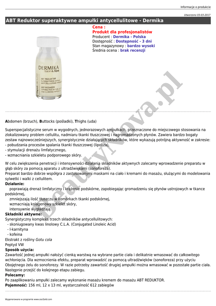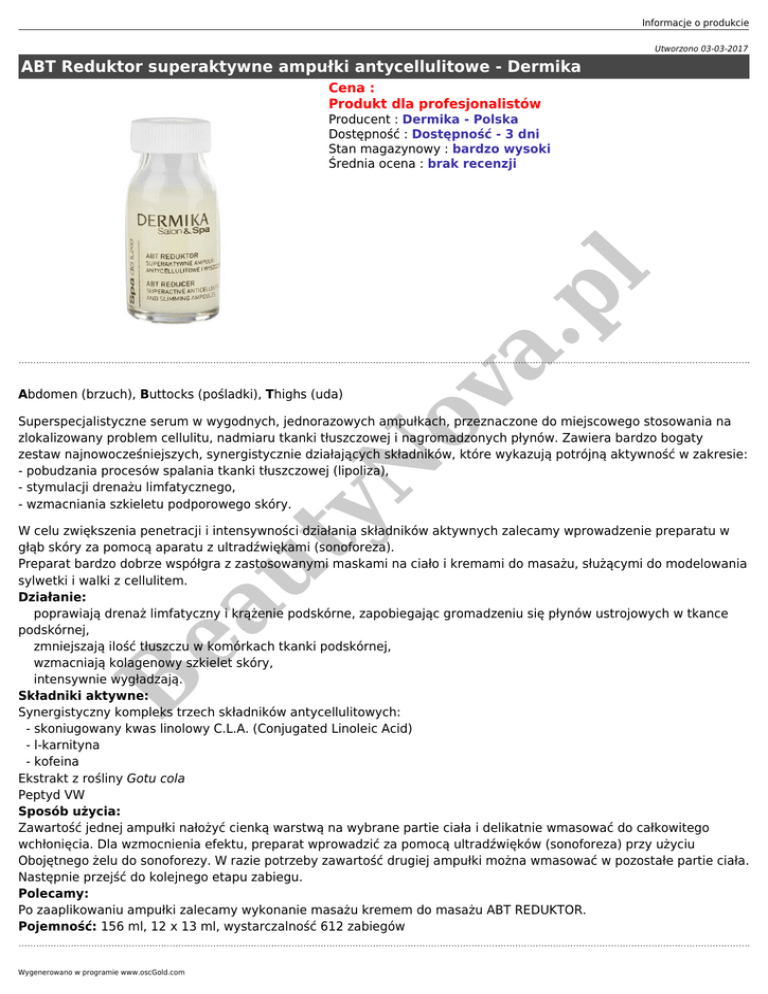 Informacje o produkcie Utworzono 03-03-2017 ABT Reduktor superaktywne ampułki antycellulitowe - Dermika Cena : Produkt dla profesjonalistów Abdomen (brzuch), Buttocks (pośladki), Thighs (uda) ov a. pl Producent : Dermika - Polska Dostępność : Dostępność - 3 dni Stan magazynowy : bardzo wysoki Średnia ocena : brak recenzji yN Superspecjalistyczne serum w wygodnych, jednorazowych ampułkach, przeznaczone do miejscowego stosowania na zlokalizowany problem cellulitu, nadmiaru tkanki tłuszczowej i nagromadzonych płynów. Zawiera bardzo bogaty zestaw najnowocześniejszych, synergistycznie działających składników, które wykazują potrójną aktywność w zakresie: - pobudzania procesów spalania tkanki tłuszczowej (lipoliza), - stymulacji drenażu limfatycznego, - wzmacniania szkieletu podporowego skóry. B ea ut W celu zwiększenia penetracji i intensywności działania składników aktywnych zalecamy wprowadzenie preparatu w głąb skóry za pomocą aparatu z ultradźwiękami (sonoforeza). Preparat bardzo dobrze współgra z zastosowanymi maskami na ciało i kremami do masażu, służącymi do modelowania sylwetki i walki z cellulitem. Działanie: poprawiają drenaż limfatyczny i krążenie podskórne, zapobiegając gromadzeniu się płynów ustrojowych w tkance podskórnej, zmniejszają ilość tłuszczu w komórkach tkanki podskórnej, wzmacniają kolagenowy szkielet skóry, intensywnie wygładzają. Składniki aktywne: Synergistyczny kompleks trzech składników antycellulitowych: - skoniugowany kwas linolowy C.L.A. (Conjugated Linoleic Acid) - l-karnityna - kofeina Ekstrakt z rośliny Gotu cola Peptyd VW Sposób użycia: Zawartość jednej ampułki nałożyć cienką warstwą na wybrane partie ciała i delikatnie wmasować do całkowitego wchłonięcia. Dla wzmocnienia efektu, preparat wprowadzić za pomocą ultradźwięków (sonoforeza) przy użyciu Obojętnego żelu do sonoforezy. W razie potrzeby zawartość drugiej ampułki można wmasować w pozostałe partie ciała. Następnie przejść do kolejnego etapu zabiegu. Polecamy: Po zaaplikowaniu ampułki zalecamy wykonanie masażu kremem do masażu ABT REDUKTOR. Pojemność: 156 ml, 12 x 13 ml, wystarczalność 612 zabiegów Wygenerowano w programie www.oscGold.com ut ea B ov yN a. pl