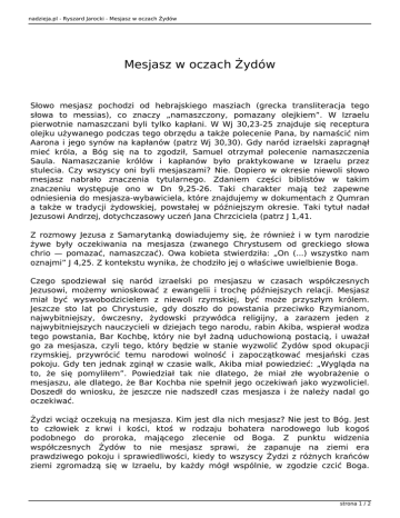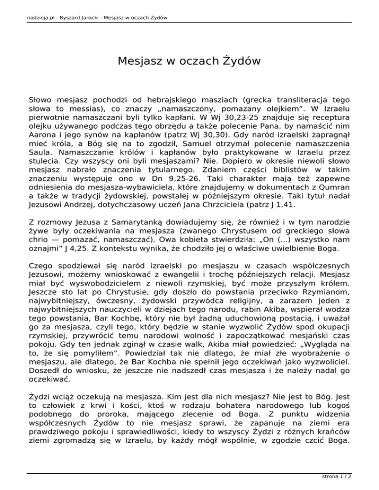 nadzieja.pl - Ryszard Jarocki - Mesjasz w oczach Żydów Mesjasz w oczach Żydów Słowo mesjasz pochodzi od hebrajskiego masziach (grecka transliteracja tego słowa to messias), co znaczy „namaszczony, pomazany olejkiem”. W Izraelu pierwotnie namaszczani byli tylko kapłani. W Wj 30,23-25 znajduje się receptura olejku używanego podczas tego obrzędu a także polecenie Pana, by namaścić nim Aarona i jego synów na kapłanów (patrz Wj 30,30). Gdy naród izraelski zapragnął mieć króla, a Bóg się na to zgodził, Samuel otrzymał polecenie namaszczenia Saula. Namaszczanie królów i kapłanów było praktykowane w Izraelu przez stulecia. Czy wszyscy oni byli mesjaszami? Nie. Dopiero w okresie niewoli słowo mesjasz nabrało znaczenia tytularnego. Zdaniem części biblistów w takim znaczeniu występuje ono w Dn 9,25-26. Taki charakter mają też zapewne odniesienia do mesjasza-wybawiciela, które znajdujemy w dokumentach z Qumran a także w tradycji żydowskiej, powstałej w późniejszym okresie. Taki tytuł nadał Jezusowi Andrzej, dotychczasowy uczeń Jana Chrzciciela (patrz J 1,41. Z rozmowy Jezusa z Samarytanką dowiadujemy się, że również i w tym narodzie żywe były oczekiwania na mesjasza (zwanego Chrystusem od greckiego słowa chrio — pomazać, namaszczać). Owa kobieta stwierdziła: „On (...) wszystko nam oznajmi” J 4,25. Z kontekstu wynika, że chodziło jej o właściwe uwielbienie Boga. Czego spodziewał się naród izraelski po mesjaszu w czasach współczesnych Jezusowi, możemy wnioskować z ewangelii i trochę późniejszych relacji. Mesjasz miał być wyswobodzicielem z niewoli rzymskiej, być może przyszłym królem. Jeszcze sto lat po Chrystusie, gdy doszło do powstania przeciwko Rzymianom, najwybitniejszy, ówczesny, żydowski przywódca religijny, a zarazem jeden z najwybitniejszych nauczycieli w dziejach tego narodu, rabin Akiba, wspierał wodza tego powstania, Bar Kochbę, który nie był żadną uduchowioną postacią, i uważał go za mesjasza, czyli tego, który będzie w stanie wyzwolić Żydów spod okupacji rzymskiej, przywrócić temu narodowi wolność i zapoczątkować mesjański czas pokoju. Gdy ten jednak zginął w czasie walk, Akiba miał powiedzieć: „Wygląda na to, że się pomyliłem”. Powiedział tak nie dlatego, że miał złe wyobrażenie o mesjaszu, ale dlatego, że Bar Kochba nie spełnił jego oczekiwań jako wyzwoliciel. Doszedł do wniosku, że jeszcze nie nadszedł czas mesjasza i że należy nadal go oczekiwać. Żydzi wciąż oczekują na mesjasza. Kim jest dla nich mesjasz? Nie jest to Bóg. Jest to człowiek z krwi i kości, ktoś w rodzaju bohatera narodowego lub kogoś podobnego do proroka, mającego zlecenie od Boga. Z punktu widzenia współczesnych Żydów to nie mesjasz sprawi, że zapanuje na ziemi era prawdziwego pokoju i sprawiedliwości, kiedy to wszyscy Żydzi z różnych krańców ziemi zgromadzą się w Izraelu, by każdy mógł wspólnie, w zgodzie czcić Boga. strona 1 / 2 nadzieja.pl - Ryszard Jarocki - Mesjasz w oczach Żydów Tego dzieła dokona Bóg. Ludzie czyniąc świat lepszym, mogą przyśpieszyć zapowiadające nową erę przyjście mesjasza, który dokończy dzieła zapoczątkowanego przez ludzi. Wielu też współczesnych Żydów nie myśli o przyjściu mesjasza jako o osobie, lecz o pewnej epoce mesjańskiej. Żydzi nie wyobrażali sobie tej nowej epoki jako czegoś duchowego. Wybitny rabin, Johan ben Zakkai, żyjący w pierwszym stuleciu naszej ery, twierdził, że gdy ktoś ci powie, że nadchodzi mesjasz, a ty w tym czasie pracować będziesz w sadzie, to najpierw dokończ rozpoczętą pracę, a później idź go powitać. Wypowiedź ta, która przetrwała stulecia, świadczy o tym, że przyjście mesjasza nie oznaczało dla nich końca świata i zaniechania dotychczasowej działalności. Mesjasz, czyli Chrystus, w tekstach nowotestamentowych to Syn Boży namaszczony nie olejkiem, lecz Duchem Świętym, a Jego królestwo ma dwa wymiary:pierwszy duchowy, odnoszący się głównie do charakteru jego obywateli, którzy doznają nowo narodzenia dzięki Jego ofierze (patrz Mt 5-6); drugi wymiar tego królestwa to fizyczny pobyt jego obywateli na odnowionej ziemi; dojdzie do tego po Jego ponownym przyjściu na ziemię; ten wymiar królestwa został opisany przede wszystkim w Objawieniu Jana, chociaż i w innych księgach nowotestamentowych znajdujemy o nim liczne wzmianki. strona 2 / 2 Powered by TCPDF (www.tcpdf.org)