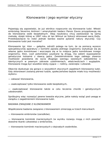 nadzieja.pl - Mirosław Chmiel* - Klonowanie i jego wymiar etyczny Klonowanie i jego wymiar etyczny Pojawiają się zapowiedzi, że już wkrótce rozpocznie się klonowanie ludzi. Włoski embriolog Severino Antinori i amerykański badacz Panos Zavos przygotowują się do klonowania osób bezpłodnych. Obaj naukowcy chcą zastosować tę samą metodę, dzięki której w 1997 roku dr Ian Wilmut ze Szkocji sklonował owcę Dolly. Przedsięwzięcie to rodzi jednak bardzo ważne pytanie natury etycznej: Czy klonowanie ludzi jest moralne? Klonowanie (gr. klon — gałązka, odrośl) polega na tym, że za pomocą wysoce specjalistycznej aparatury z komórki jajowej jednego organizmu wyłuskuje się jej własne jądro komórkowe i wszczepia się w to miejsce jądro komórkowe innego organizmu. Klon, czyli potomstwo uzyskane tą drogą, ma zatem wyposażenie genetyczne tożsame z dawcą jądra. Zwielokrotnienie tego zabiegu stwarza możliwość powołania do życia długiego szeregu swoistych sobowtórów o identycznych w pewnym zakresie uzdolnieniach, właściwościach i wyglądzie. Klonowane mogą być wszelkie istoty żyjące — rośliny, zwierzęta i człowiek. Obecnie dyskutuje się gorąco o wszystkich etycznych aspektach klonowania ludzi. Gdy sklonowani zostaną pierwsi ludzie, społeczeństwo będzie miało trzy możliwości wyboru: — zakazać klonowania, — zaakceptować tylko klonowanie osób bezpłodnych, — zaakceptować klonowanie także w celu leczenia chorób i genetycznych udoskonaleń. Spróbujmy więc rozważyć pewne kwestie etyczne, jakie należy wziąć pod uwagę w związku z zagadnieniem klonowania ludzi. BADANIA ZWIĄZANE Z KLONOWANIEM Współczesne badania związane z klonowaniem zmierzają w trzech kierunkach: — klonowanie embrionów (zarodków), — klonowanie komórek macierzystych (w wyniku rozwoju mogą z nich powstać dowolne tkanki człowieka) z embrionów, — klonowanie komórek macierzystych z dojrzałych osobników. strona 1 / 7 nadzieja.pl - Mirosław Chmiel* - Klonowanie i jego wymiar etyczny Klonowanie embrionów. Większość ludzi nie zdaje sobie sprawy, że klonowanie faktycznie nie jest niczym nowym. Od tysięcy lat bowiem w wyniku naturalnego klonowania rodzą się bliźnięta jednojajowe. Z powodów, które dotąd nie zostały wyjaśnione przez naukę, jedno z 75 zapłodnień komórki jajowej w organizmie kobiety wiąże się zrozpadem zapłodnionego jaja podczas jednej z kolejnych faz normalnego cyklu podziału komórki jajowej, co prowadzi do rozwoju dwóch niemal identycznych bliźniaków. To, co od tysięcy lat dzieje się w sposób naturalny, współczesna medycyna zaczyna przeprowadzać w laboratoriach. Sztuczne klonowanie embrionu ludzkiego zaczyna się stawać czymś normalnym podczas zapłodnienia in vitro, czyli poza organizmem matki. Po połączeniu komórek rozrodczych rozpoczyna się naturalny podział komórki jajowej — powstają dwie komórki, potem cztery, następnie osiem itd. W pewnym momencie ta masa komórek (embrion) jest sztucznie rozdzielana na kilka mniejszych grup, z których każda jest umieszczana w osobnym naczyniu i nadal rozwija się jako osobny organizm. To sztuczne rozmnażanie bliźniąt jest praktyką stosowaną w rozmnażaniu zwierząt od ponad dziesięciu lat. Klonowanie komórek macierzystych. Innym i zdecydowanie odmiennym sposobem klonowania jest wykorzystywanie identycznych komórek embrionu, które się jeszcze nie zróżnicowały (zwanych komórkami macierzystymi), w celu uzyskania tkanek do przeszczepu (transplantacji). Od czasu ich odkrycia w roku 1998 komórki macierzyste embrionu ludzkiego są przedmiotem wielkiego zainteresowania naukowców. Komórki te są doskonałym potencjalnym źródłem wyspecjalizowanych komórek, z których będzie można uzyskać dowolną tkankę, atym samym w razie potrzeby zastąpić niemal każdy organ w organizmie człowieka (np. mięsień serca, tkankę nerwową). W Londynie ma powstać pierwszy na świecie bank komórek macierzystych. Komórki macierzyste mogłyby posłużyć wyleczeniu wielu milionów ludzi, którzy są ofiarami wypadków, cukrzycy, raka, chorób serca, uszkodzenia rdzenia kręgowego, stwardnienia rozsianego, białaczki itd. Leczenie tą metodą chorób systemu nerwowego, takich jak choroba Alzheimera i Parkinsona, rokuje wielkie nadzieje. Naukowcom z Instytutu Centrum Medycyny Doświadczalnej i Klinicznej PAN w Warszawie jako pierwszym w świecie udało się wyhodować w laboratorium wszystkie potrzebne komórki nerwowe. Zespół prof. Krystyny Domańskiej-Janik ma nadzieję, że w przyszłości będą one zastępowały zniszczone tkanki mózgu osób cierpiących na parkinsonizm, pląsawicę Huntingtona czy inne choroby neurodegeneracyjne. Klonowanie komórek macierzystych embrionu może być kluczem do rozwoju medycyny XXI wieku, gdyż komórki nerwowe mózgu i rdzenia kręgowego — w przeciwieństwie do innych komórek ciała — mają bardzo ograniczone zdolności odtwórcze, a komórki macierzyste mogą się rozwijać zastępując neurony. Jednak z uwagi na dużą liczbę komórek potrzebnych do transplantacji, konieczne byłoby klonowanie embrionów ludzkich, aby uzyskane z nich tkanki wykorzystywać do leczenia chorób. Produkowanie komórek macierzystych z tkanek płodów pochodzących z usuniętych ciąż wiąże się ze znaczącą kwestią etyczną. Na szczęście naukowcy odkrywają inne źródła tych komórek. strona 2 / 7 nadzieja.pl - Mirosław Chmiel* - Klonowanie i jego wymiar etyczny Klonowanie komórek macierzystych z dojrzałych osobników. Ta metoda także zdecydowanie różni się od klonowania embrionu. Polega na sklonowaniu nowego organizmu z jednej komórki ciała dorosłego organizmu, przy czym komórka ta nie jest komórką rozrodczą. Klonowanie komórek ciała dorosłego organizmu jest dość nowym odkryciem. Owca Dolly — pierwsze sklonowane zwierzę — ma dopiero cztery lata. Przed Dolly nie sklonowano żadnego zwi
