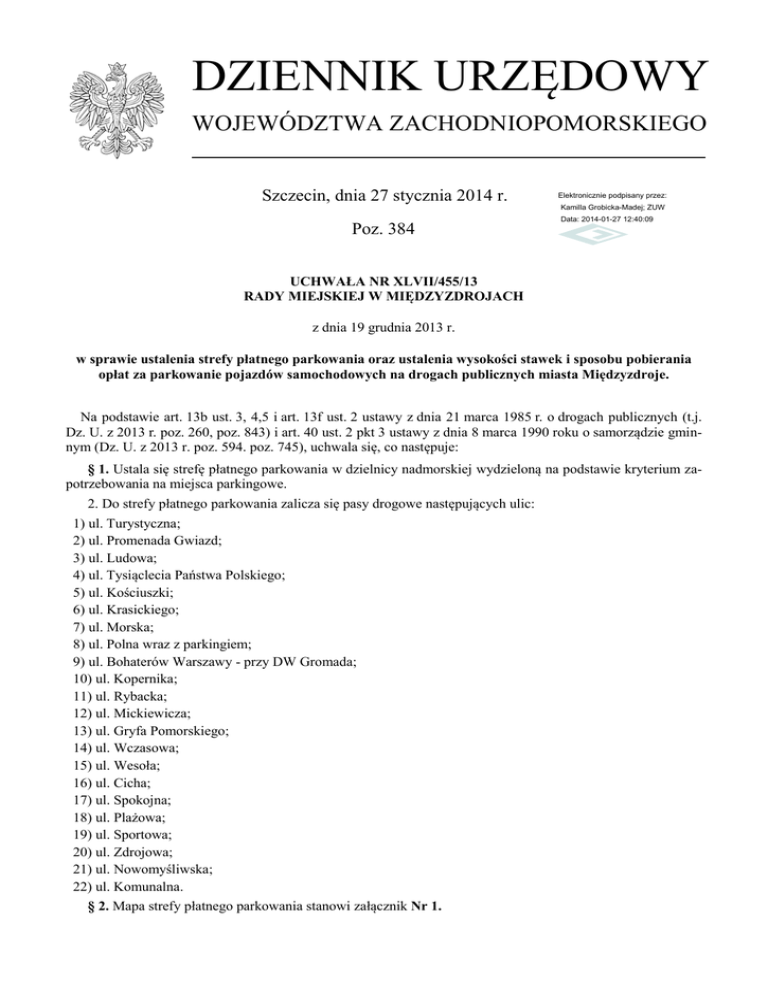 DZIENNIK URZĘDOWY WOJEWÓDZTWA ZACHODNIOPOMORSKIEGO Szczecin, dnia 27 stycznia 2014 r. Elektronicznie podpisany przez: Kamilla Grobicka-Madej; ZUW Poz. 384 Data: 2014-01-27 12:40:09 UCHWAŁA NR XLVII/455/13 RADY MIEJSKIEJ W MIĘDZYZDROJACH z dnia 19 grudnia 2013 r. w sprawie ustalenia strefy płatnego parkowania oraz ustalenia wysokości stawek i sposobu pobierania opłat za parkowanie pojazdów samochodowych na drogach publicznych miasta Międzyzdroje. Na podstawie art. 13b ust. 3, 4,5 i art. 13f ust. 2 ustawy z dnia 21 marca 1985 r. o drogach publicznych (t.j. Dz. U. z 2013 r. poz. 260, poz. 843) i art. 40 ust. 2 pkt 3 ustawy z dnia 8 marca 1990 roku o samorządzie gminnym (Dz. U. z 2013 r. poz. 594. poz. 745), uchwala się, co następuje: § 1. Ustala się strefę płatnego parkowania w dzielnicy nadmorskiej wydzieloną na podstawie kryterium zapotrzebowania na miejsca parkingowe. 2. Do strefy płatnego parkowania zalicza się pasy drogowe następujących ulic: 1) ul. Turystyczna; 2) ul. Promenada Gwiazd; 3) ul. Ludowa; 4) ul. Tysiąclecia Państwa Polskiego; 5) ul. Kościuszki; 6) ul. Krasickiego; 7) ul. Morska; 8) ul. Polna wraz z parkingiem; 9) ul. Bohaterów Warszawy - przy DW Gromada; 10) ul. Kopernika; 11) ul. Rybacka; 12) ul. Mickiewicza; 13) ul. Gryfa Pomorskiego; 14) ul. Wczasowa; 15) ul. Wesoła; 16) ul. Cicha; 17) ul. Spokojna; 18) ul. Plażowa; 19) ul. Sportowa; 20) ul. Zdrojowa; 21) ul. Nowomyśliwska; 22) ul. Komunalna. § 2. Mapa strefy płatnego parkowania stanowi załącznik Nr 1. Dziennik Urzędowy Województwa Zachodniopomorskiego –2– Poz. 384 § 3. 1. Wprowadza się opłaty za parkowanie pojazdów samochodowych w strefie płatnego parkowania w następującej wysokości: 1) za pierwsze pół godziny parkowania 2) za pierwszą godzinę parkowania 3) za drugą godzinę parkowania 4) za trzecią godzinę parkowania 5) za czwartą i każdą następną rozpoczętą godzinę parkowania 6) bilet parkingowy jednodniowy 7) karta abonamentowa 2 dniowa 8) karta abonamentowa 3 dniowa 9) karta abonamentowa 5 dniowa 10) karta abonamentowa parkingowa jednotygodniowa 11) zegar parkingowy dla mieszkańców Gminy Międzyzdroje - 1,50 zł; 3,00 zł; 3,50 zł; 4,00 zł; 3,00 zł; 20,00 zł; 35,00 zł; 50,00 zł; 70,00 zł; 90,00 zł; 20,00 zł. 2. Opłaty za parkowanie pobiera się całorocznie, od poniedziałku do soboty w godz. od 8.00 do 21.00. § 4. Wpływy z opłat za parkowanie pojazdów samochodowych w SPP przeznacza się na remont, utrzymanie, przebudowę i budowę dróg, w tym na budowę nowych miejsc postojowych na terenie miasta. § 5. Wprowadza się Regulamin Strefy Płatnego Parkowania w mieście Międzyzdroje, stanowiący załącznik Nr 2 do uchwały, który określa sposób organizacji i eksploatacji miejsc parkingowych oraz sposób pobierania opłat. § 6. Wykonanie uchwały powierza się Burmistrzowi Międzyzdrojów. § 7. Uchwała podlega ogłoszeniu w Dzienniku Urzędowym Województwa Zachodniopomorskiego i wchodzi w życie po upływie 14 dni od dnia ogłoszenia. § 8. Z dniem wejścia uchwały w życie traci moc uchwała Nr LI/535/2010 Rady Miejskiej w Międzyzdrojach z dnia 30 marca 2010 r. w sprawie ustalenia strefy płatnego parkowania oraz ustalenia wysokości stawek i sposobu pobierania opłat za parkowanie pojazdów samochodowych na drogach publicznych miasta Międzyzdroje, zmieniona uchwałą Nr XXXV/331/13 Rady Miejskiej w Międzyzdrojach z dnia 24.01.2013 r. oraz traci moc uchwała Nr XLVI/437/13 z dnia 28.11.2013 r. w sprawie ustalenia strefy płatnego parkowania oraz ustalenia wysokości stawek i sposobu pobierania opłat za parkowanie pojazdów samochodowych na drogach publicznych miasta Międzyzdroje. Przewodniczący Rady Miejskiej Jan Magda Dziennik Urzędowy Województwa Zachodniopomorskiego –3– Poz. 384 Dziennik Urzędowy Województwa Zachodniopomorskiego –4– Poz. 384 Załącznik Nr 2 Do Uchwały XLVII/455/13 Rady Miejskiej w Międzyzdrojach z dnia 19.12.2013 r. REGULAMIN STREFY PŁATNEGO PARKOWANIA Regulamin niniejszy określa zasady funkcjonowania Strefy Płatnego Parkowania na drogach publicznych miasta Międzyzdroje całorocznie w godzinach od 8.00 -21.00. PRZEPISY OGÓLNE 1. Użyte w niniejszym regulaminie zwroty i wyrażenia należy rozumieć następująco; 1.1. SPP – obszar objęty Strefą Płatnego Parkowania oznakowaną na wjazdach do strefy znakami D-44 „Strefa parkowania” i na wyjazdach znakami D-45 – „Koniec strefy parkowania”. 1.2 BSPP – Biuro Strefy Płatnego Parkowania. 1.3 Bilet parkingowy- dokument stwierdzający czas, za jaki opłacono postój pojazdu w SPP. 1.4 Karta abonamentowa parkingowa – dokument stwierdzający wniesienie opłat za parkowanie. 1.5 Karta abonamentowa specjalna – dokument zawierający numer ewidencyjny, numer rejestracyjny pojazdu oraz ulicę lub strefę, na której obowiązuje zerowa stawka opłat w SPP. 2. Parking płatny jest parkingiem niestrzeżonym. 3. Parkujący na obszarze SPP, na drogach publicznych obowiązani są do uiszczenia opłaty za parkowanie. 4. Zwolnione z odpłatności za parkowanie w SPP są pojazdy: 4.1. Policji, Inspekcji Transportu Drogowego, Agencji Bezpieczeństwa Wewnętrznego, Agencji Wywiadu, Państwowej Straży Pożarnej, jednostek ochrony przeciwpożarowej, Straży Granicznej, pogotowia ratunkowego, Służby Więziennej, Służby Celnej. 4.2. Zarządcy dróg. 4.3. Sił Zbrojnych Rzeczpospolitej Polskiej, a także sił zbrojnych państw obcych, jeżeli umowa międzynarodowa, której Rzeczpospolita jest stroną, tak stanowi. 4.4. Wykorzystywane w ratownictwie lub w przypadku klęski żywiołowej. 4.5. Autobusy szkolne przewożące dzieci do szkoły. 5. Zerową stawkę opłat za parkowanie wprowadza się dla pojazdów: 5.1. Straży Miejskiej. 5.2. Obsługujących użytkowników ruchu drogowego, 5.3. Oznaczonych symbolem osoby niepełnosprawnej; w czasie parkowania kierowca zobowiązany jest do pozostawienia za przednią szybą samochodu karty parkingowej